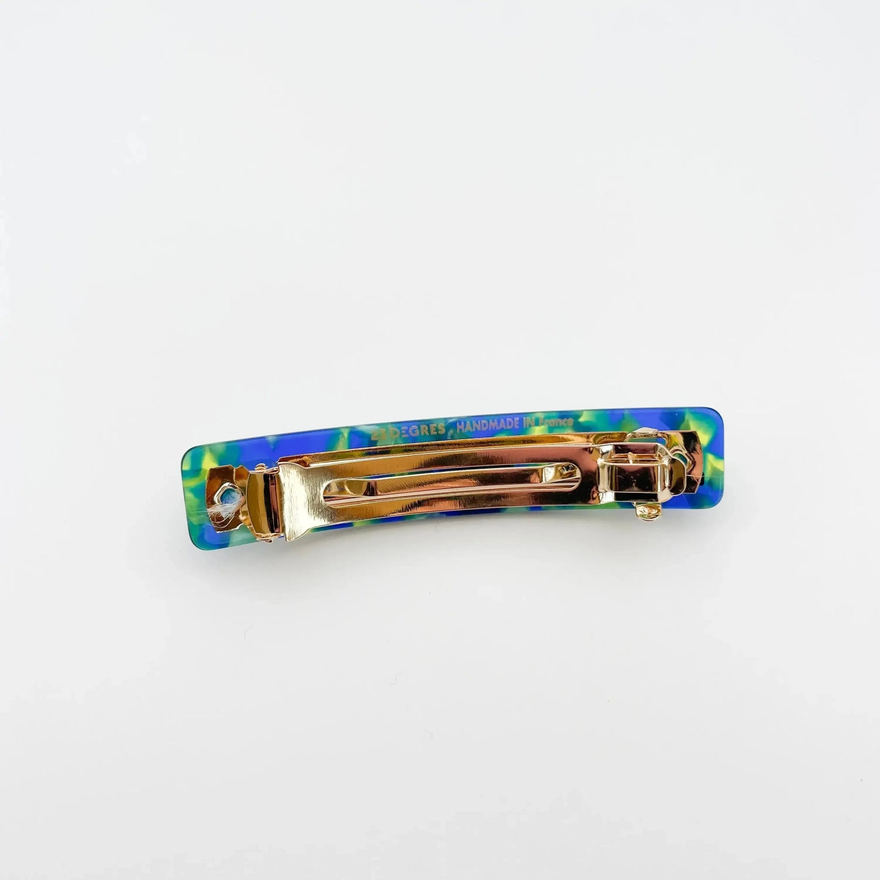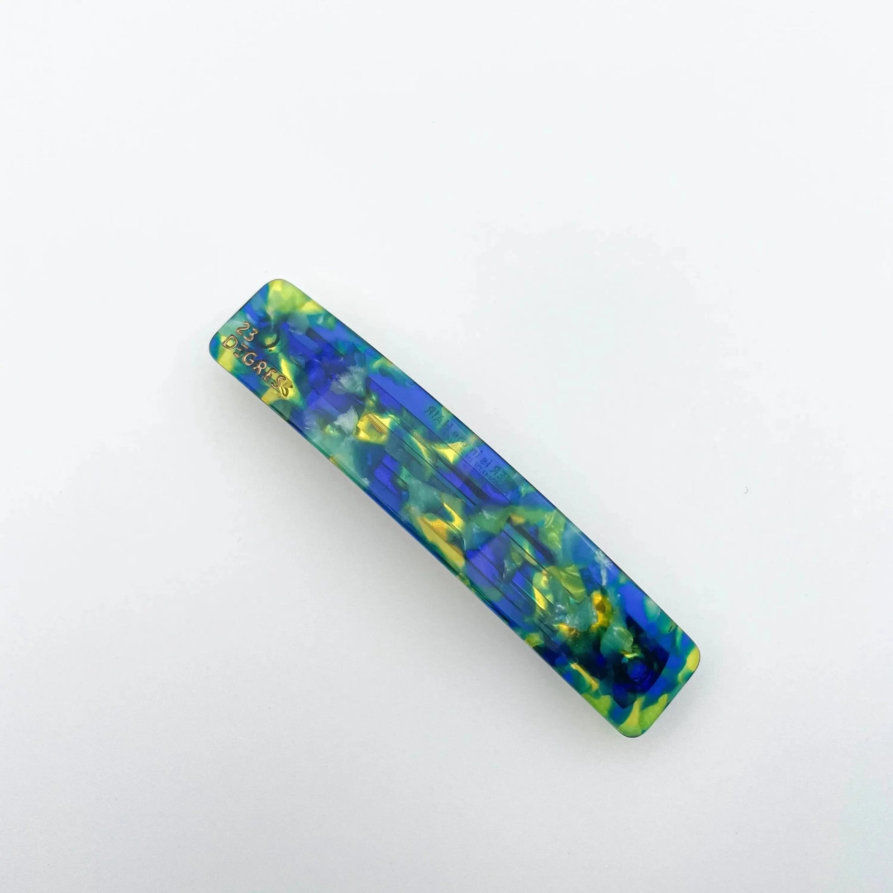 Breng een vleugje oceaanmagie in je haar met de Sun20 haarspeld van 23 Degrés. De levendige mix van blauw, groen en goudgeel doet denken aan zonlicht dat speelt op het wateroppervlak. Gemaakt van glanzend acetaat met een sterke metalen Clic-Clac-sluiting – stijlvol én functioneel.