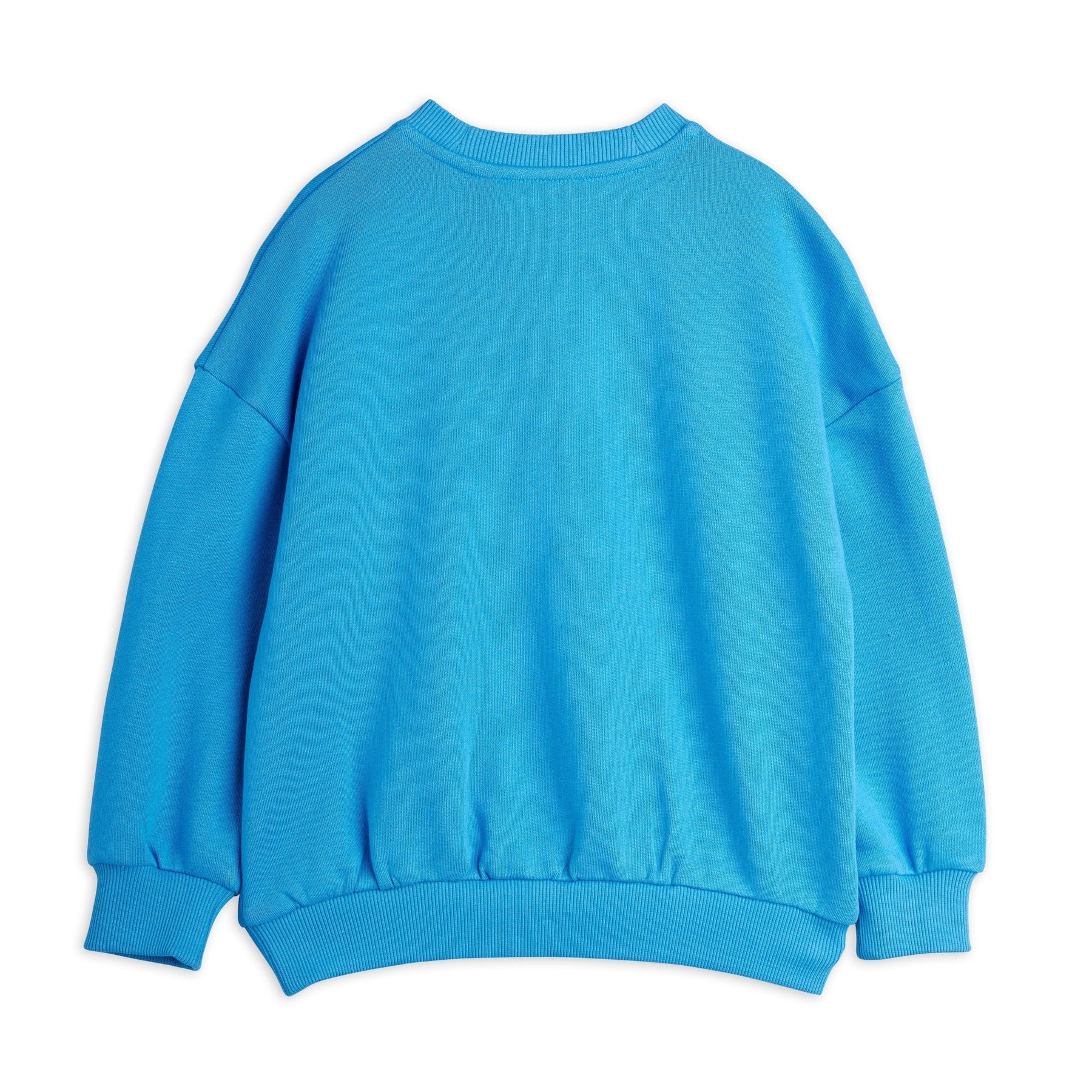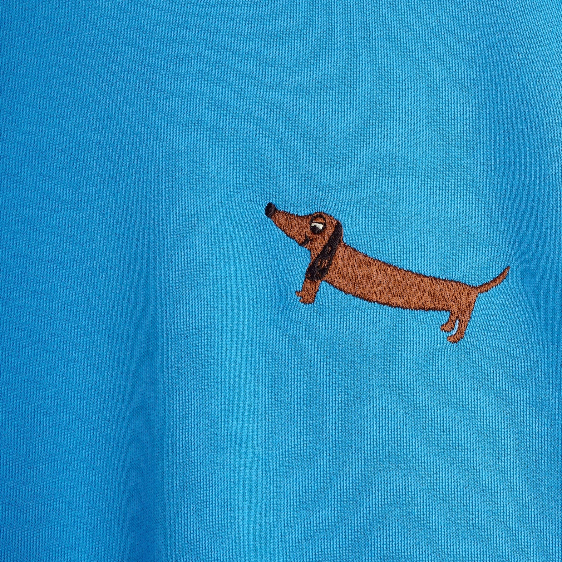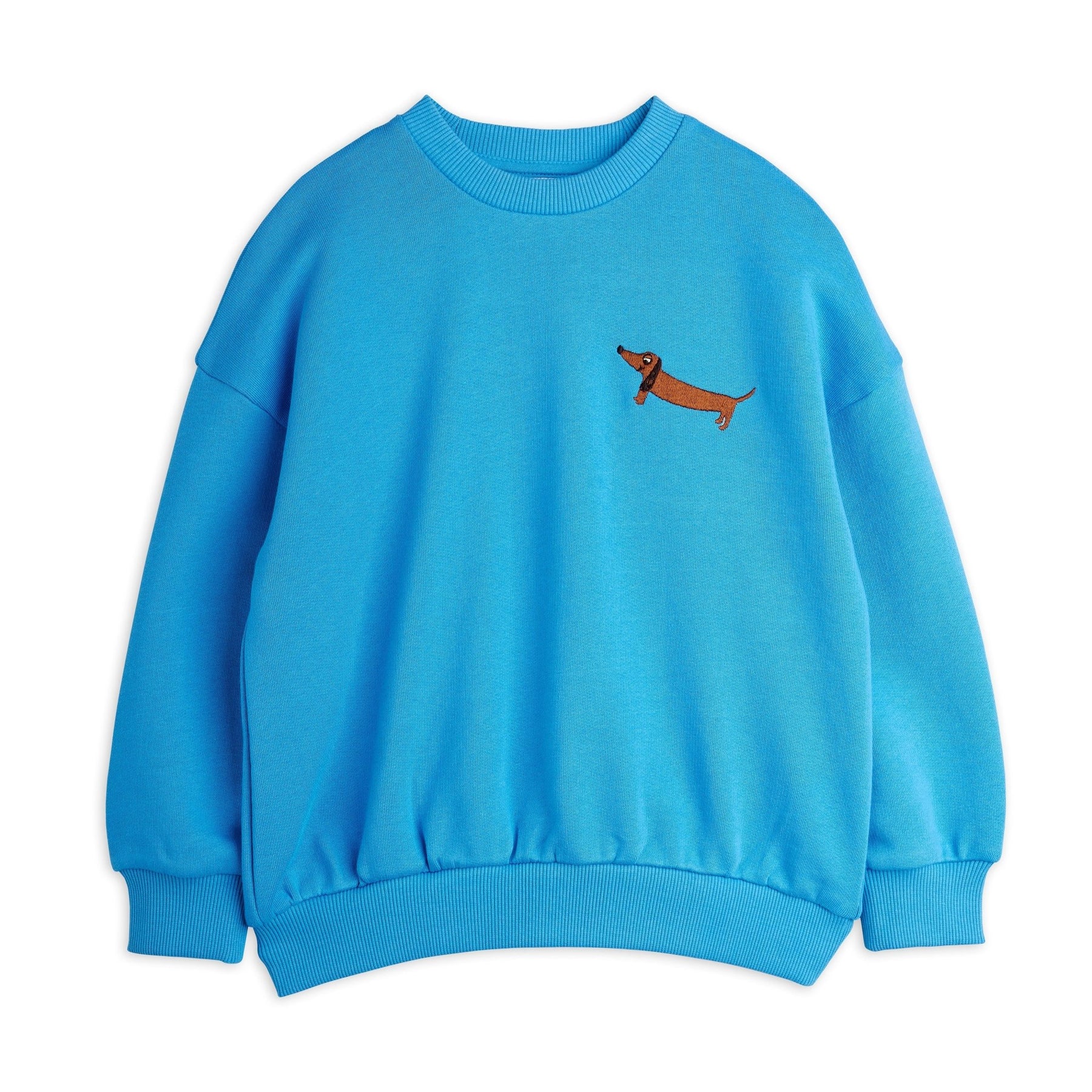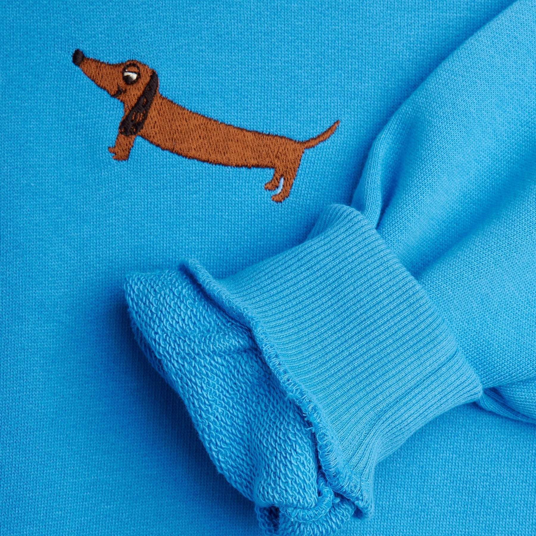 Zachte blauwe sweater met hondje op de borst van Mini Rodini.