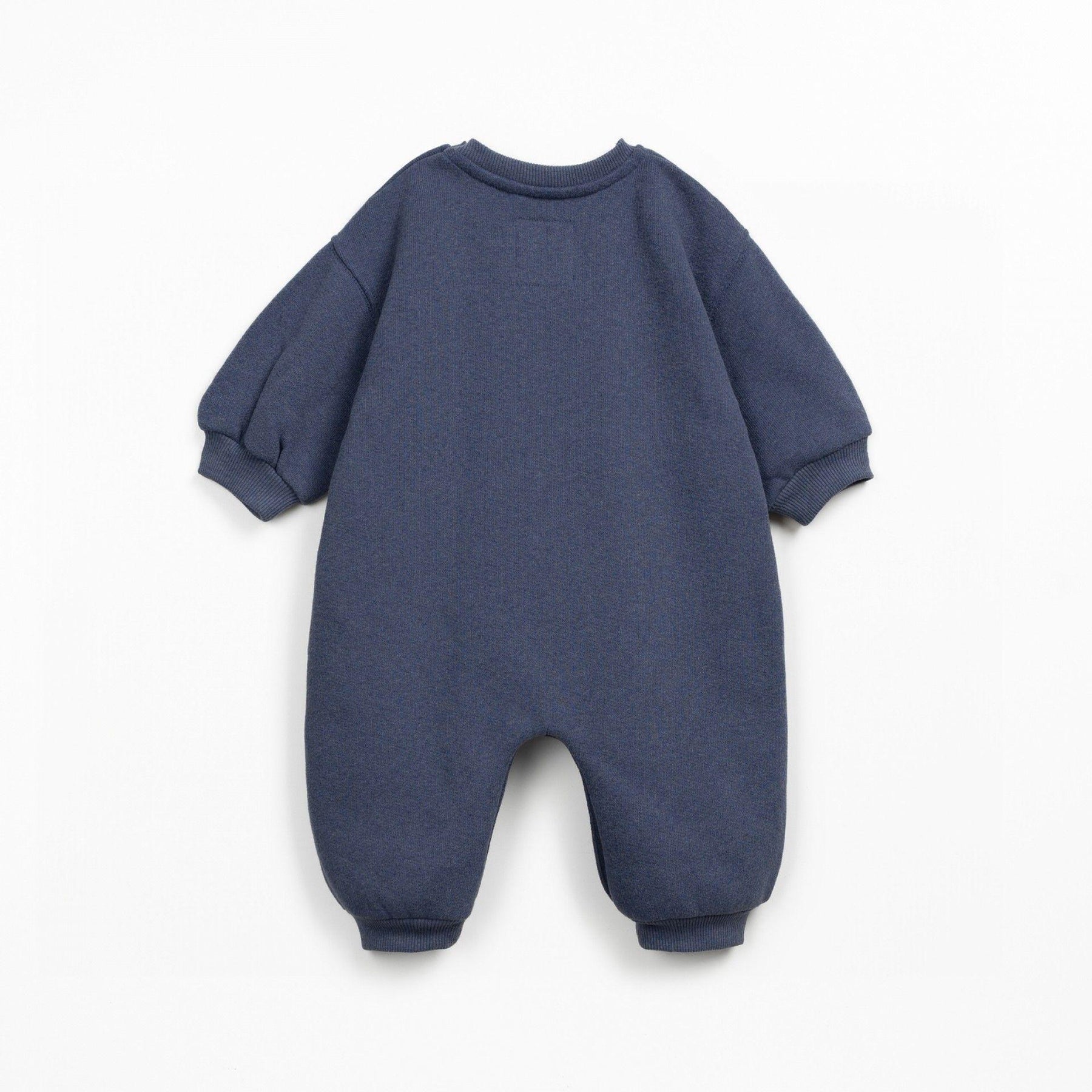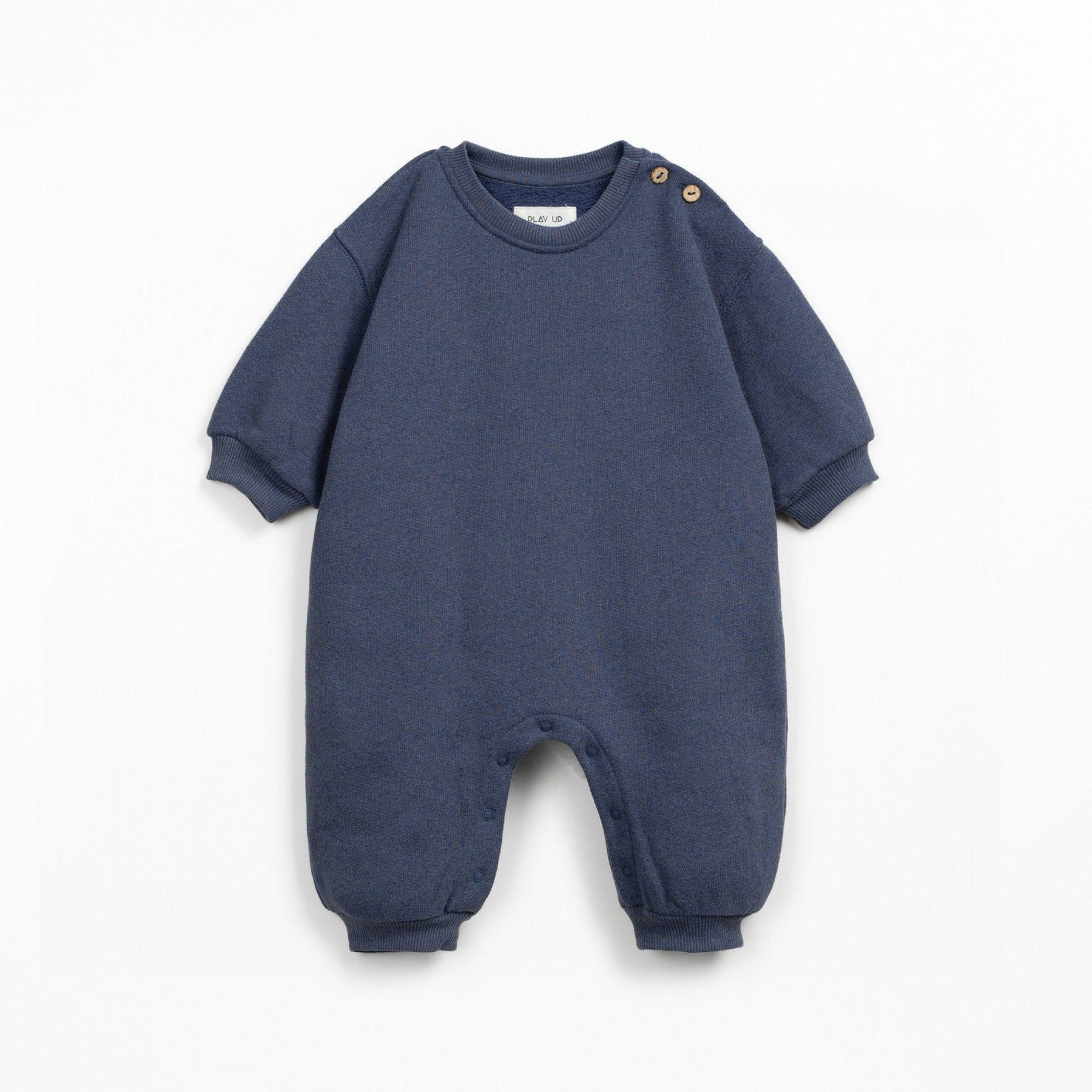 Deze zachte, blauwe, fleece jumpsuit van Play Up houdt je kleintje warm deze herfst. Er zit een knoopje aan de hals om het aan- en uittrekken te vergemakkelijken.