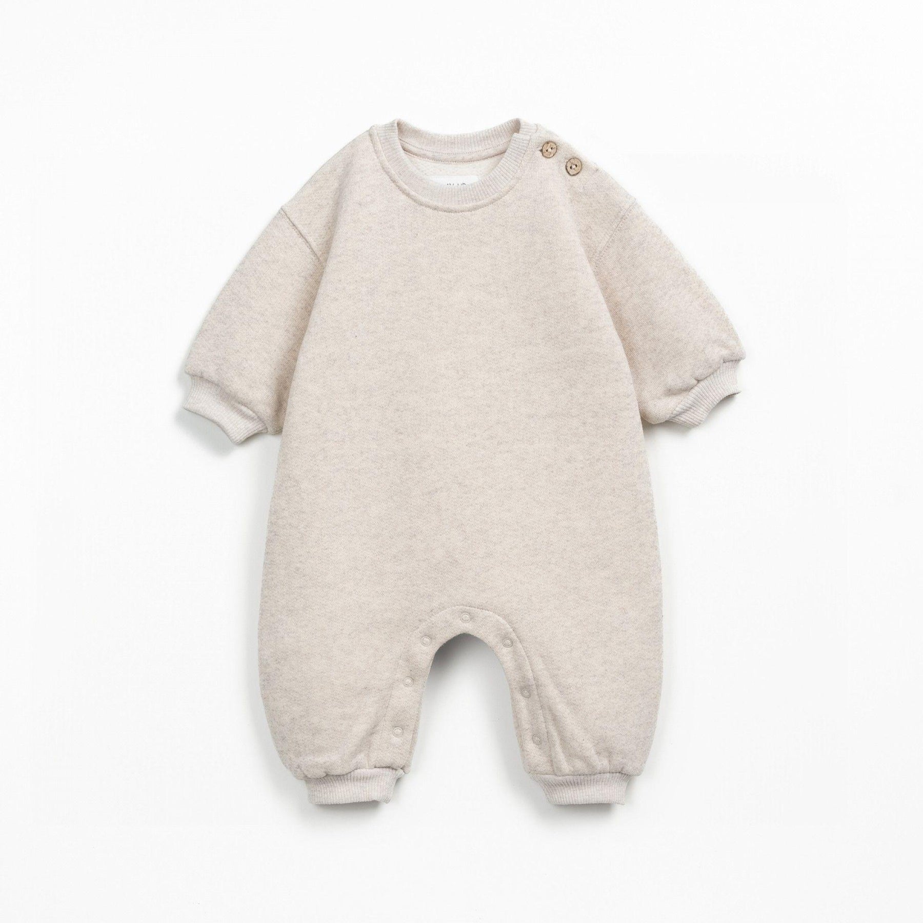 Deze zachte, beige, fleece jumpsuit van Play Up houdt je kleintje warm deze herfst. Er zit een knoopje aan de hals om het aan- en uittrekken te vergemakkelijken.