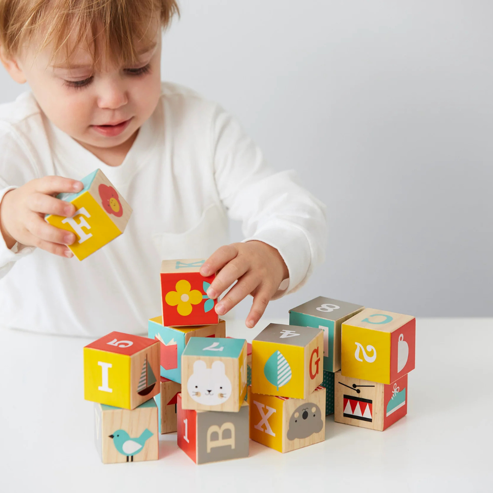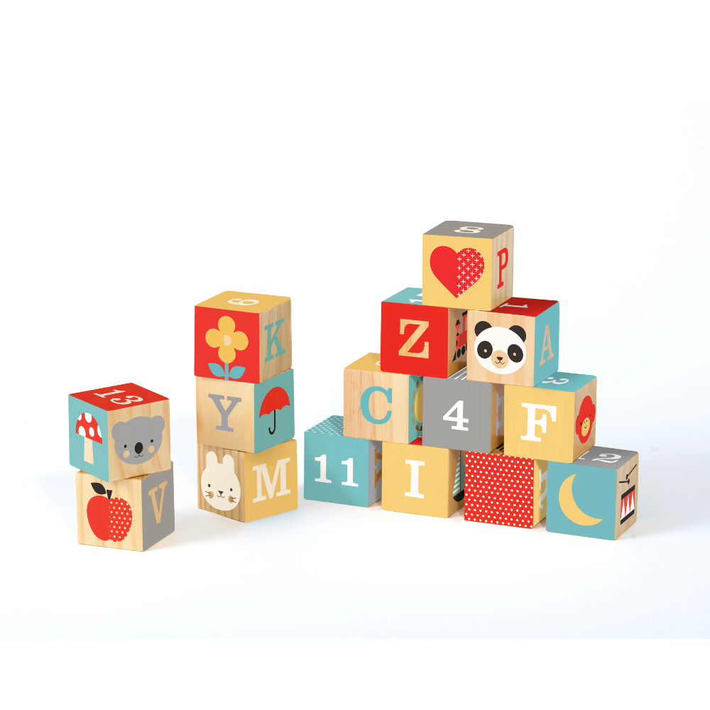 Van de plank in de kinderkamer tot op de vloer van de speelkamer: stapelen, sorteren, spelen, uitstallen en opnieuw beginnen met deze ABC-houten blokken. Met opgedrukte letters, cijfers en schattige pictogrammen zoals hartjes, panda's, apen en bloemen.