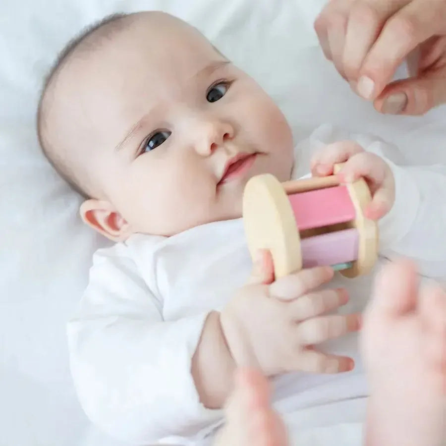 De PlanToys Rammelaar Roller Pastel brengt vrolijk geluid en spelplezier voor de allerkleinsten! Deze houten rammelaar maakt een zacht, aangenaam geluid wanneer hij over vlakke oppervlakken rolt en stimuleert zowel zicht als gehoor.