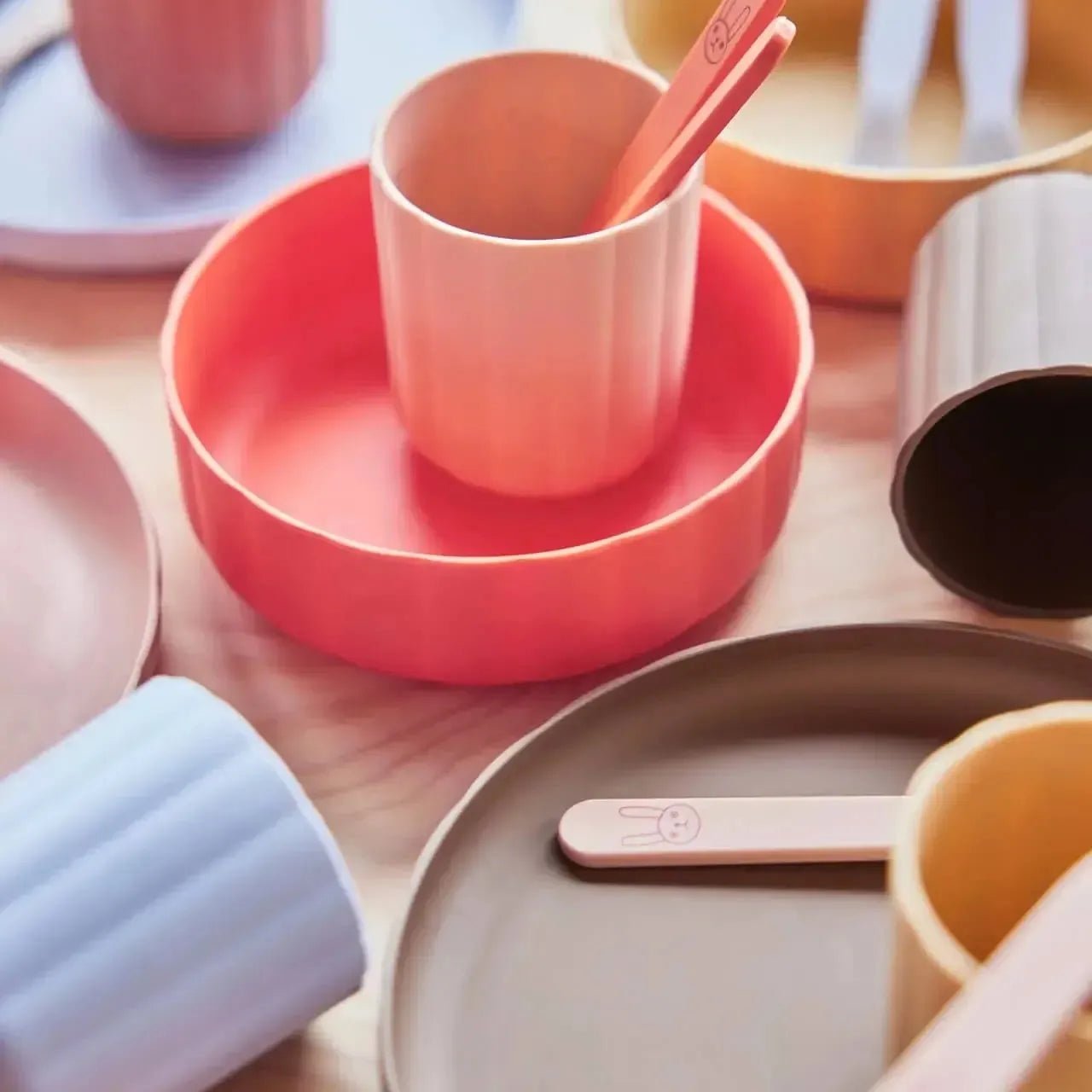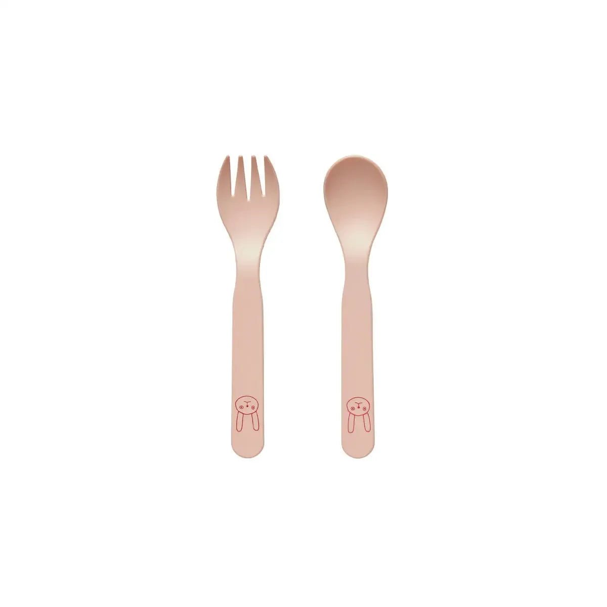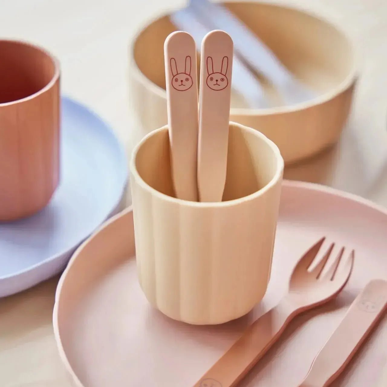 Dit bestek setje van OYOY is gemaakt van milieuvriendelijk PLA en heeft afgeronde vormen zodat peuters veilig kunnen oefenen met zelfstandig eten. Het bestek is perfect op maat voor kleine handjes. Als het bestek versleten is, kan het worden gesorteerd als hard plastic en gerecycled tot nieuwe producten. De set bevat een lepel en een vork. Het bestek heeft een mat zijdeachtig oppervlak en past bij de rest van de Pullo-collectie. Mag in de vaatwasser. Niet geschikt voor de magnetron.