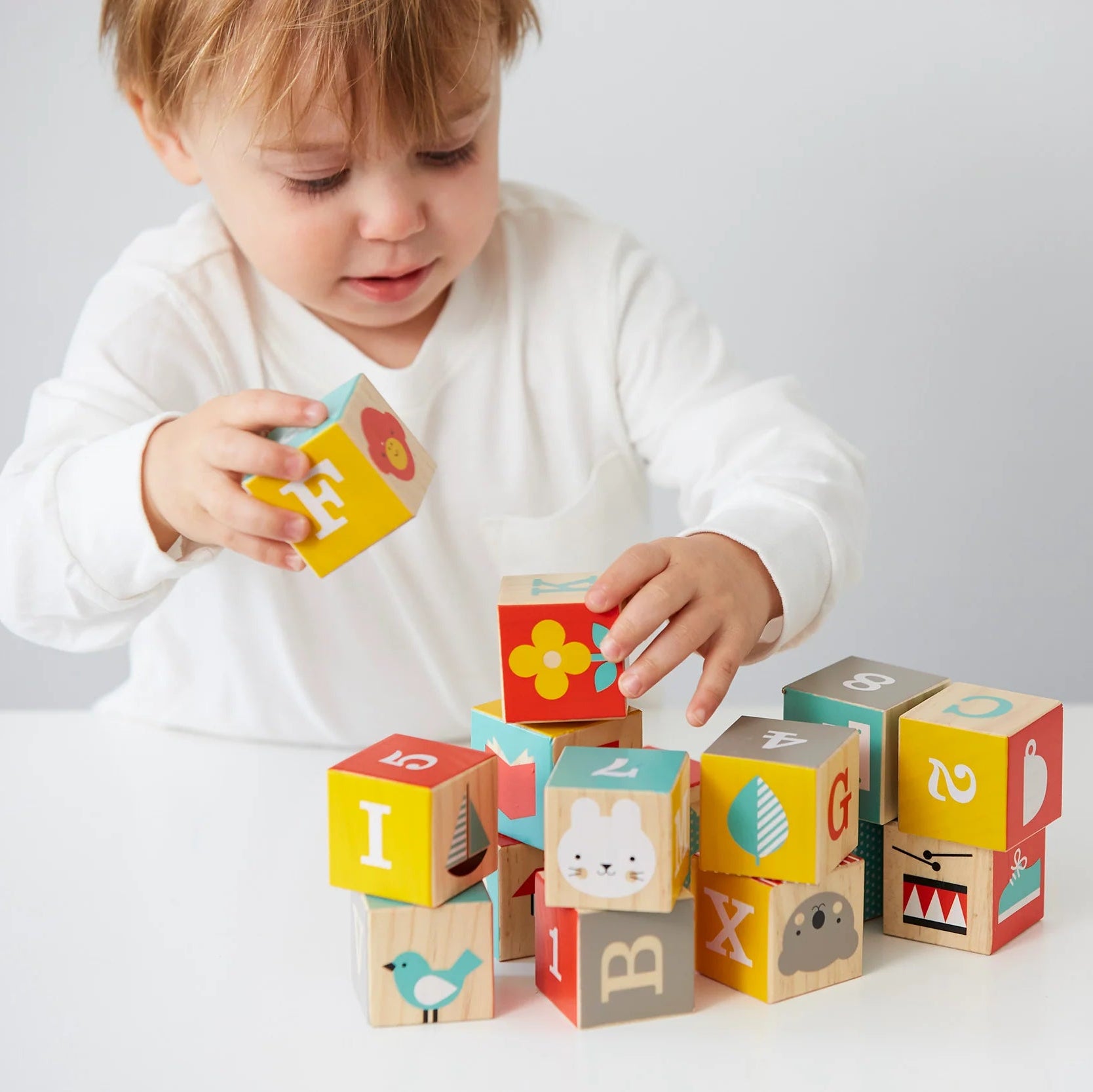 Van de plank in de kinderkamer tot op de vloer van de speelkamer: stapelen, sorteren, spelen, uitstallen en opnieuw beginnen met deze ABC-houten blokken. Met opgedrukte letters, cijfers en schattige pictogrammen zoals hartjes, panda's, apen en bloemen.