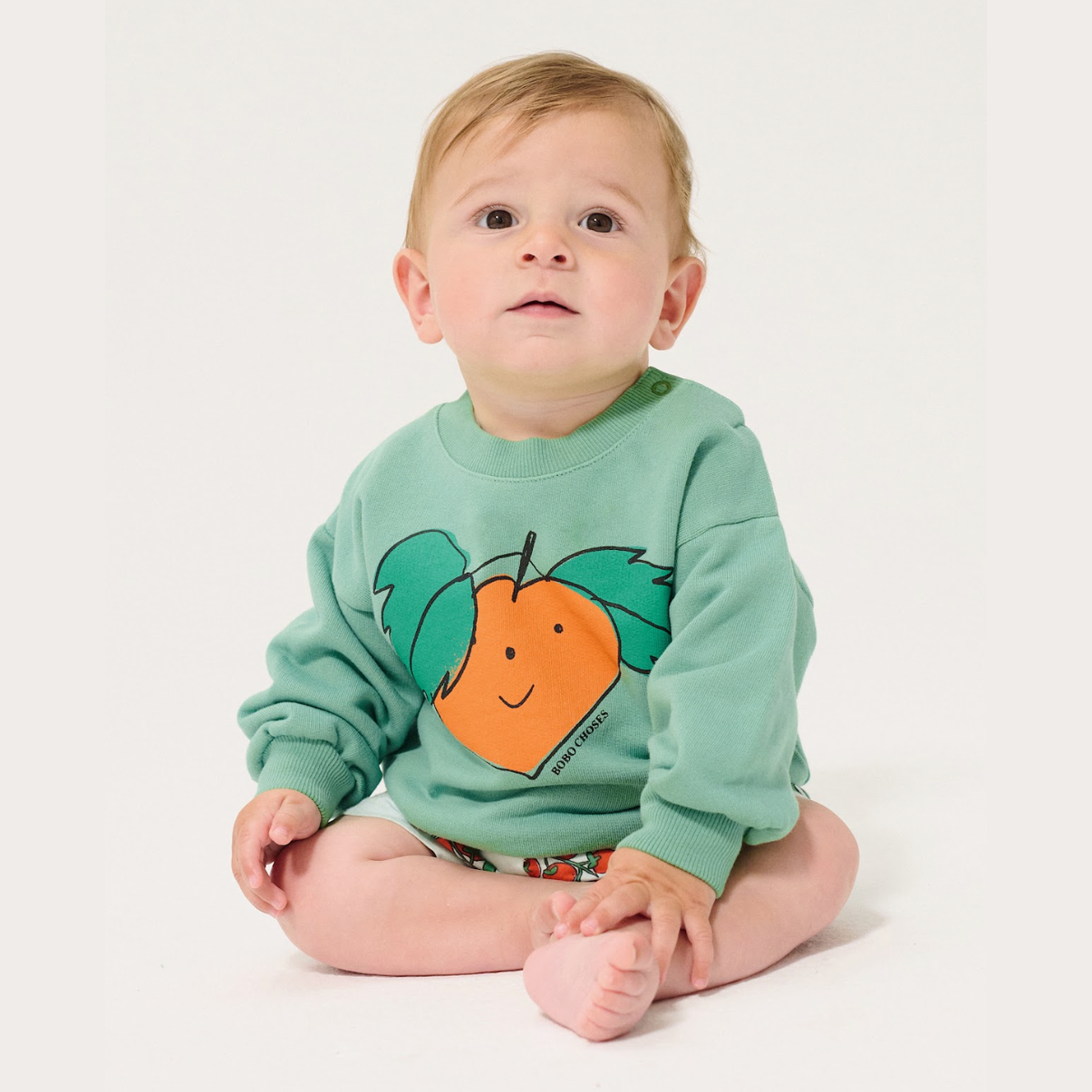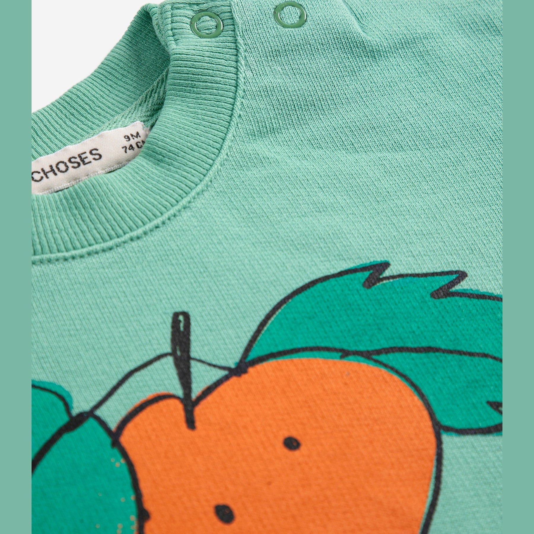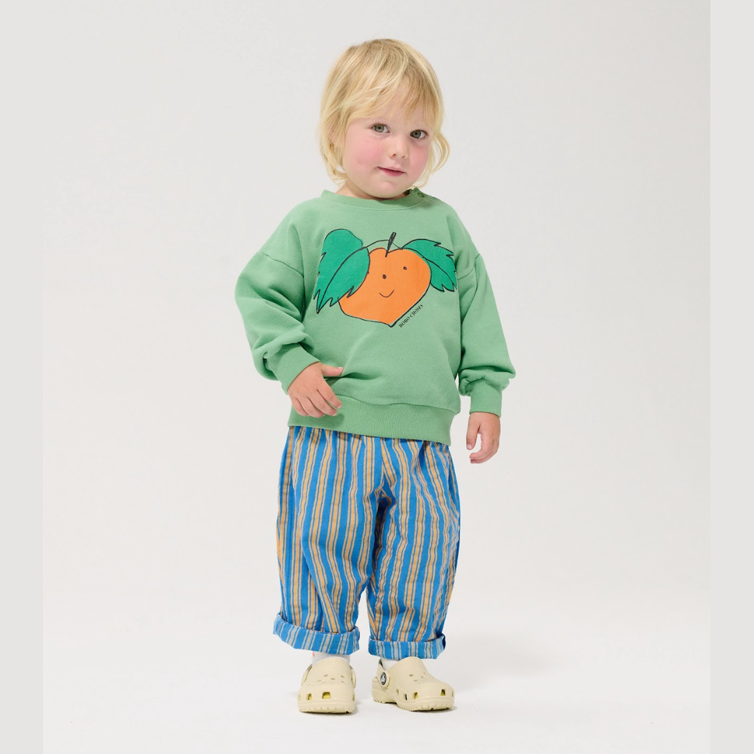 Groene sweater met mandarijn op van Bobo Choses.