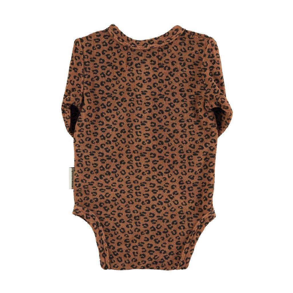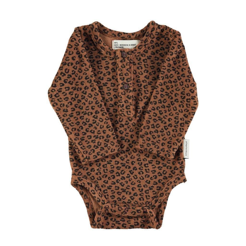 Romper met lange mouwen van badstof katoen. Knoopsluiting op de borst en drukknoopsluiting onderaan.