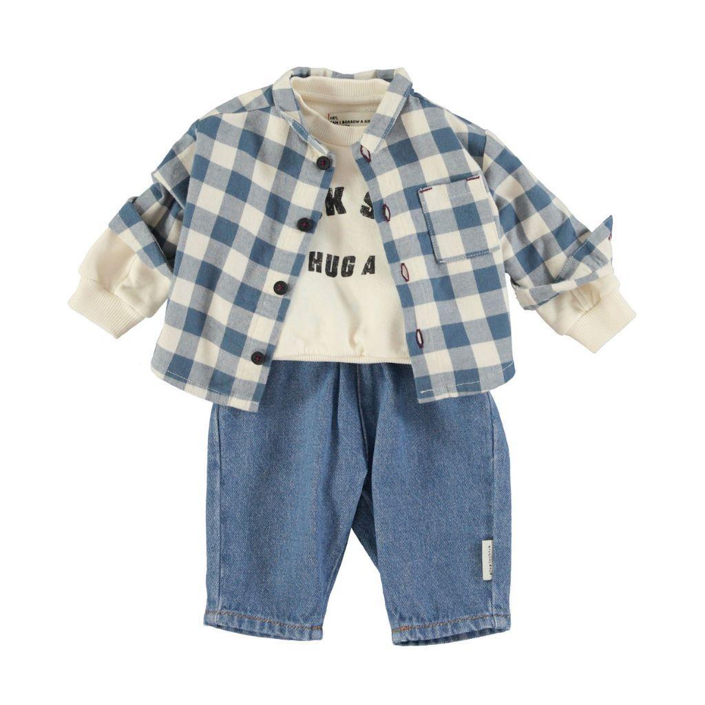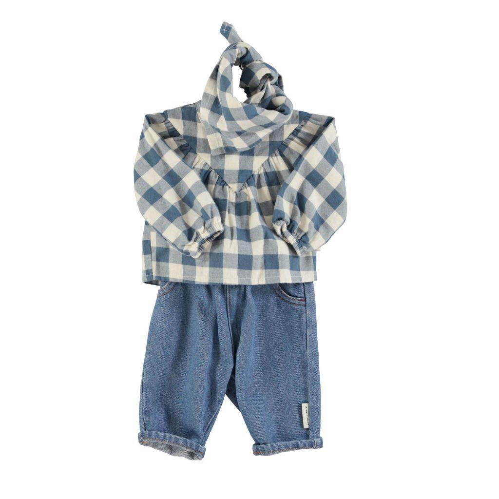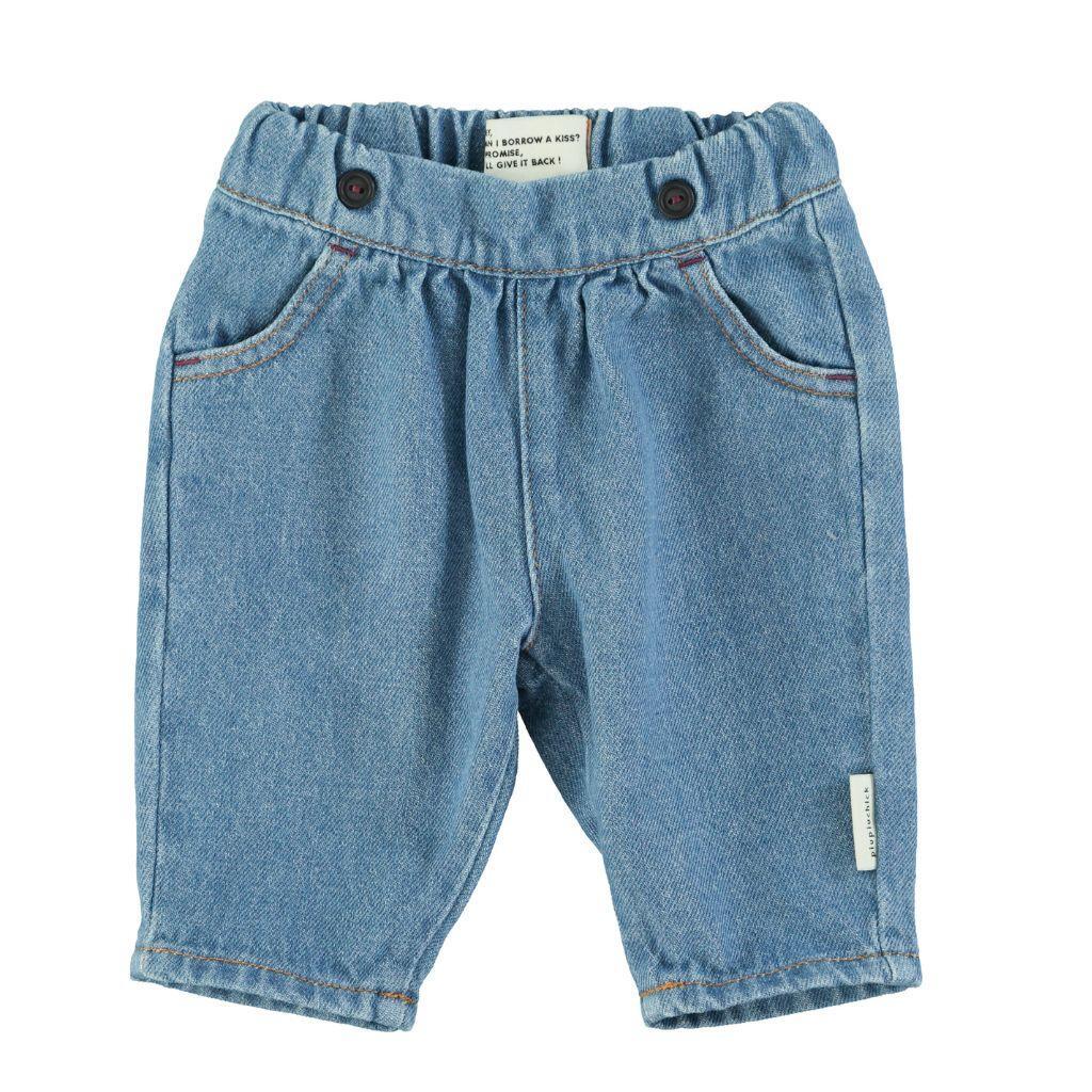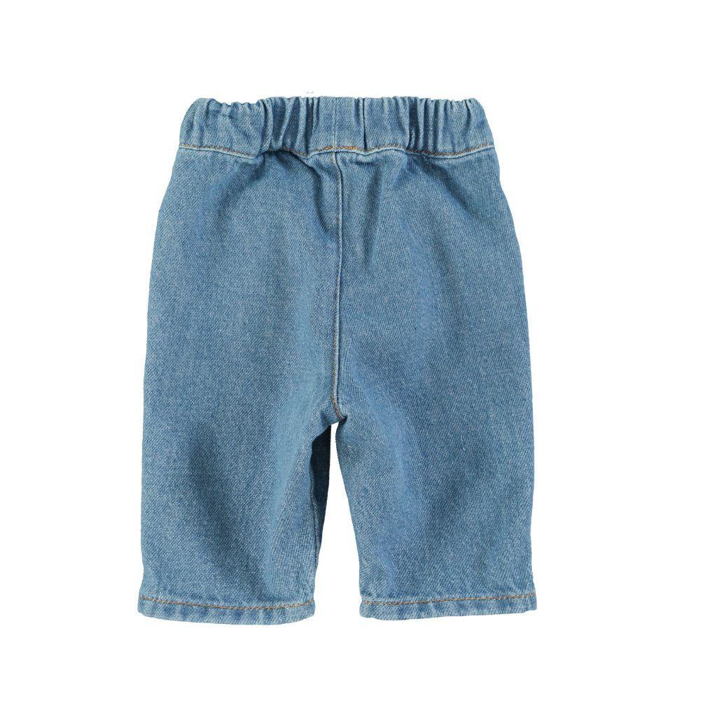 Babybroek met steekzakken. Elastische taille met kleine zwarte knopen aan de voorkant.