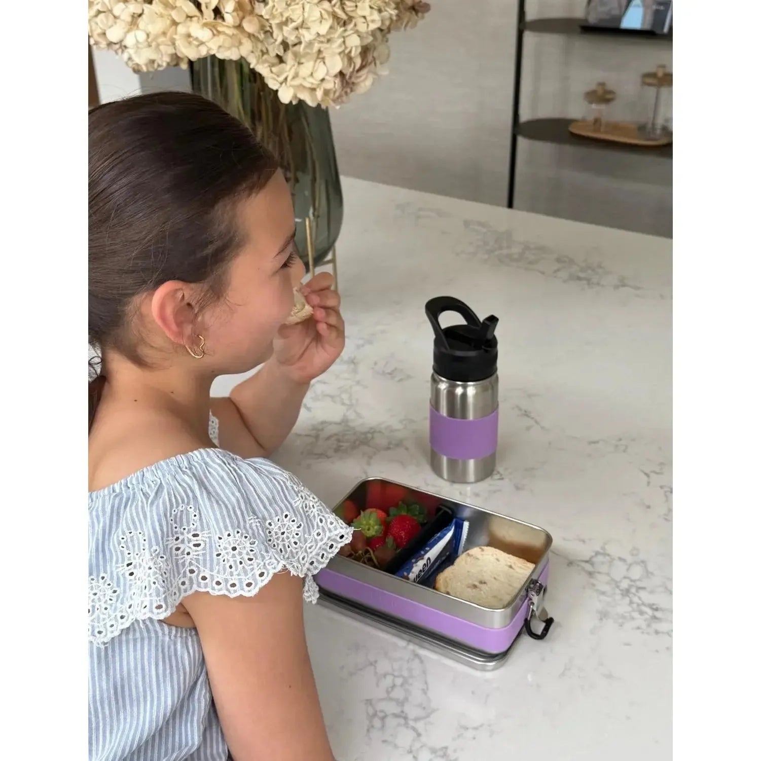 Een ruime lunchbox met veel ruimte, inclusief een handige verdeler om je eten gescheiden te houden.