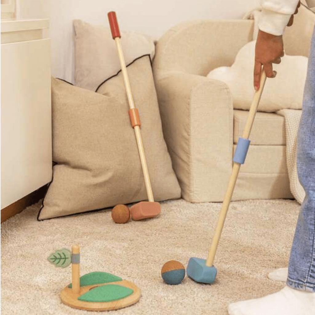 Deze minigolfset combineert plezier en vaardigheden De set, gemaakt van kurk, hout en vilt, biedt een spannende leerreis. Terwijl ze zich op elke slag concentreren, oefenen je kinderen hun concentratie en geduld, leren ze omgaan met emoties en obstakels overwinnen. En met elke putt scherpen ze hun strategisch denken aan en scherpen ze hun probleemoplossend vermogen aan dat veel verder reikt dan de golfbaan.