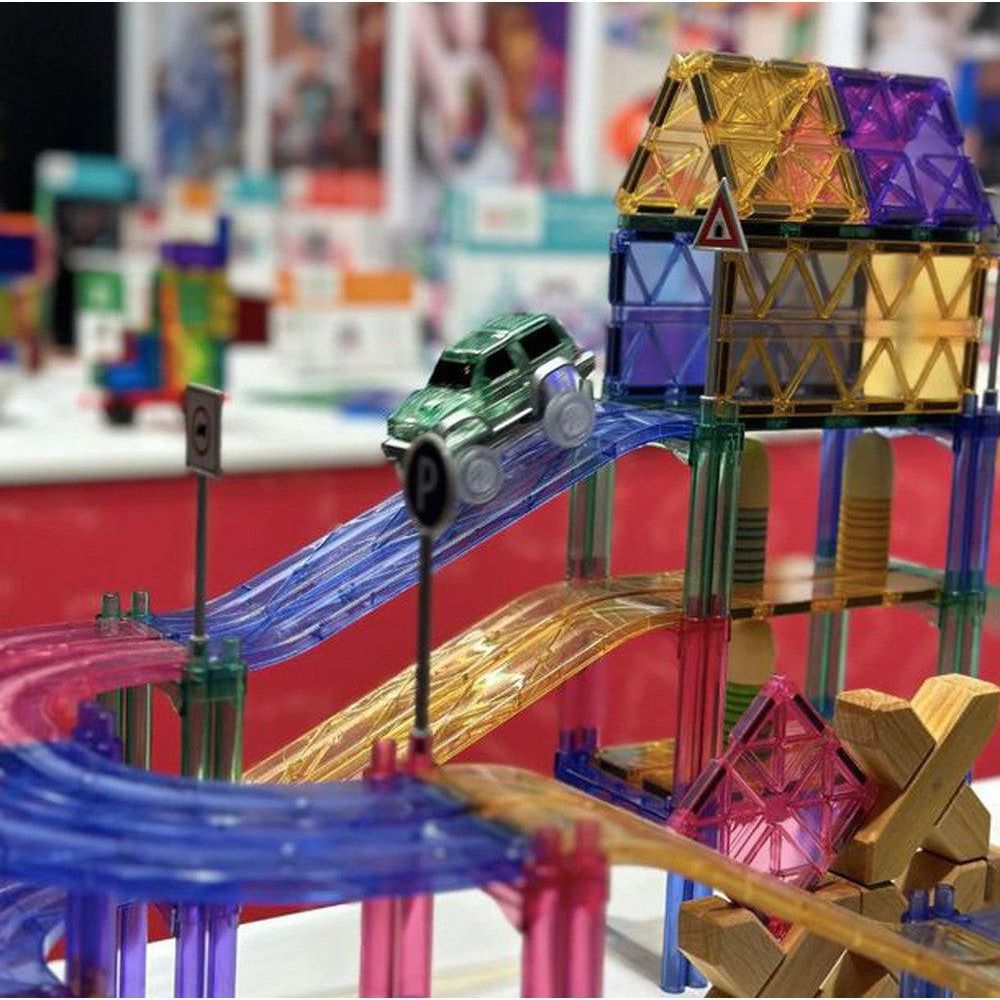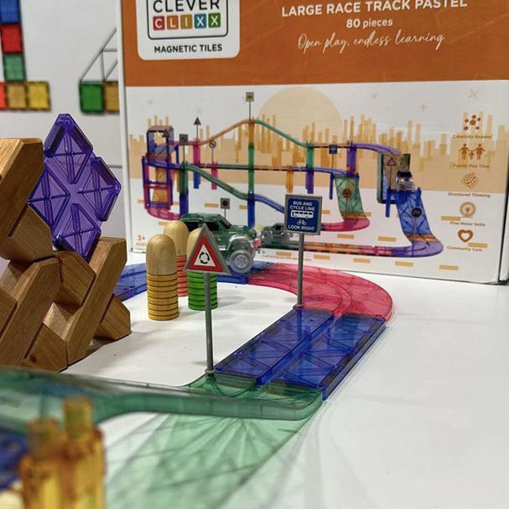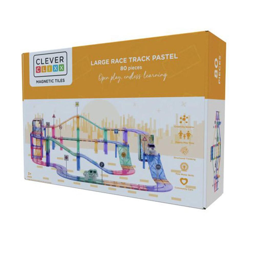 Eindeloos raceplezier met dit 80-delige Cleverclixx Race Track Pack. Je kind bouwt de coolste racebanen op verschillende niveaus met deze leuke intense set. Verkeersborden, een zelfrijdende auto en pilaren zijn inbegrepen voor extra speelplezier.