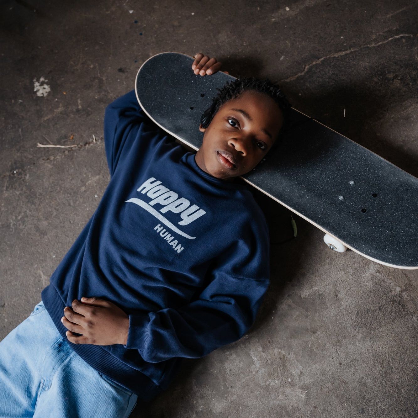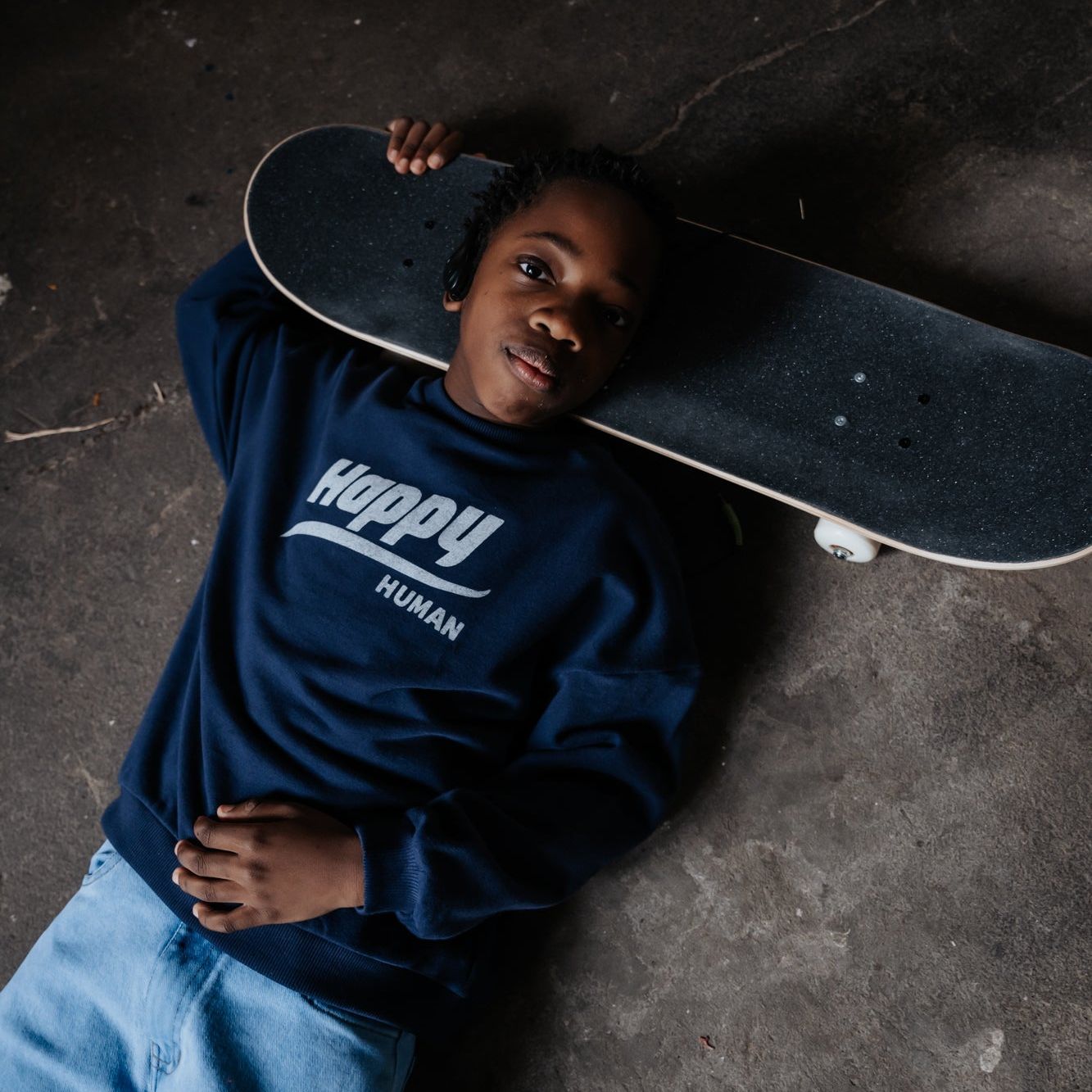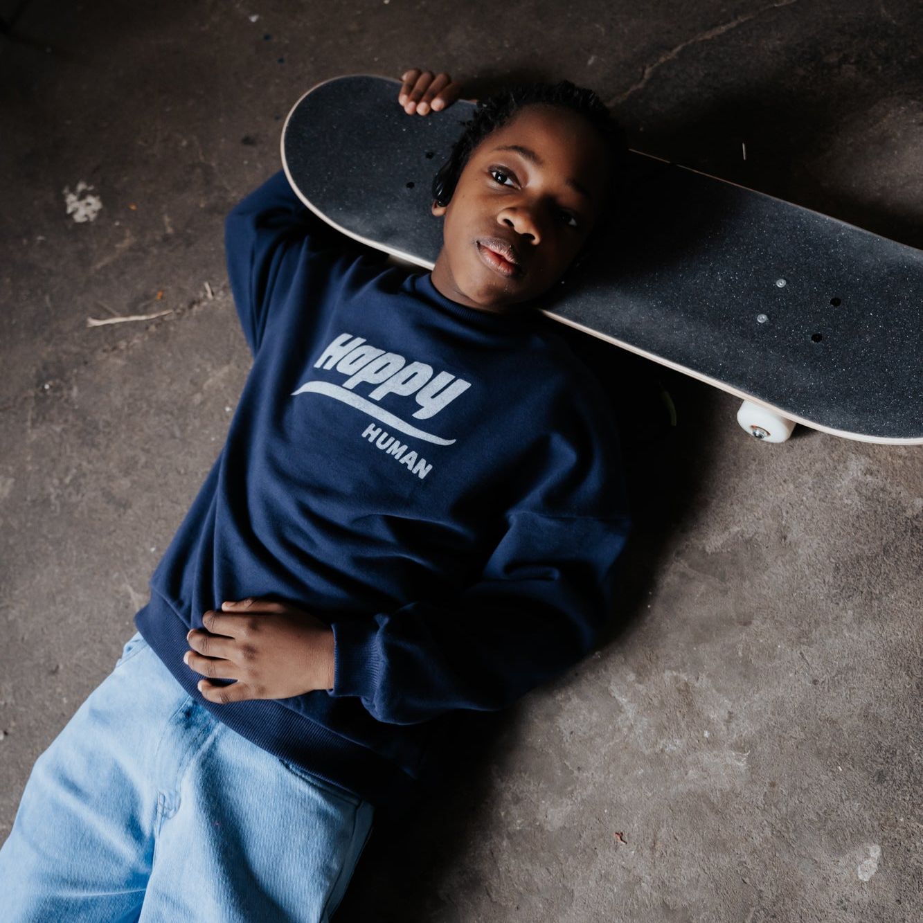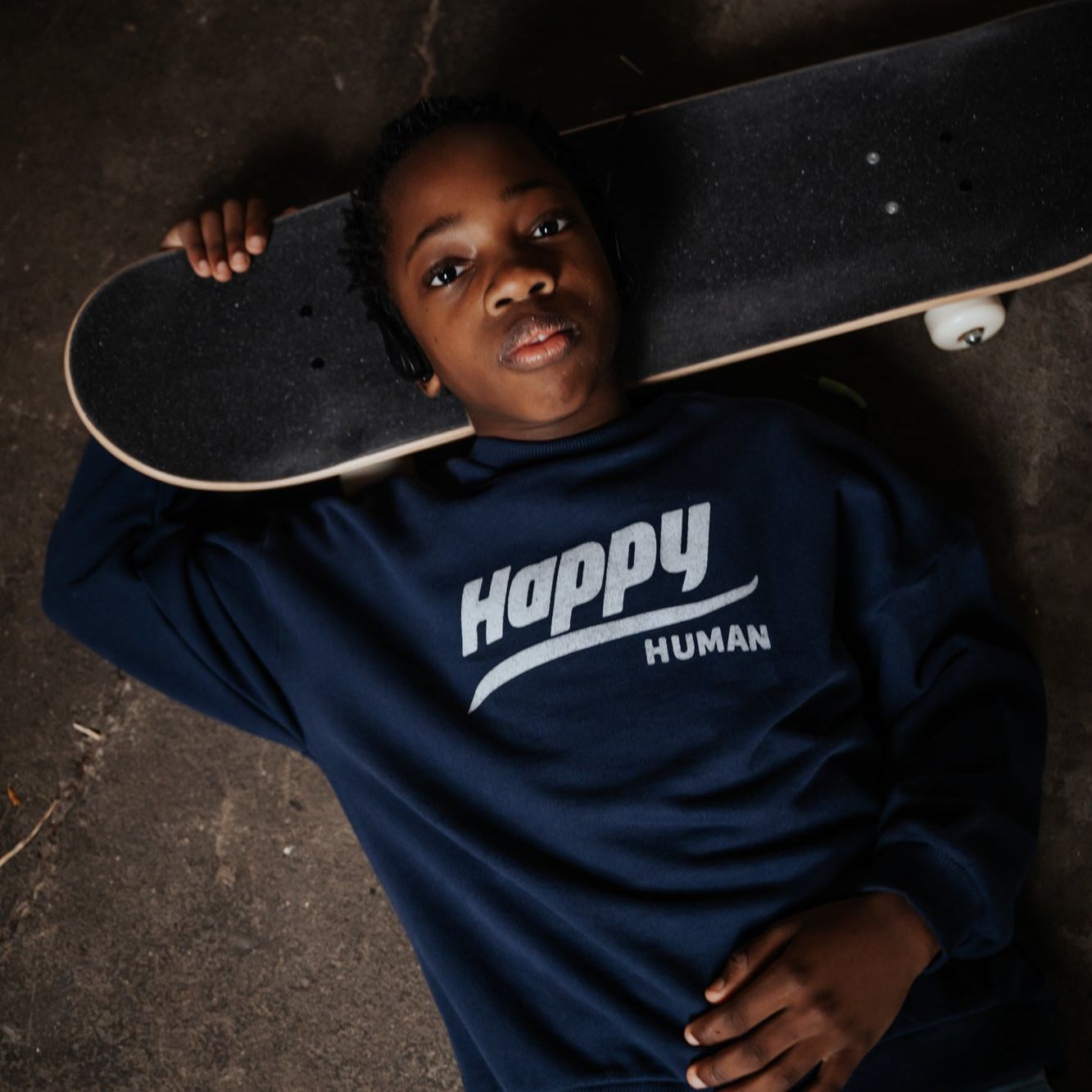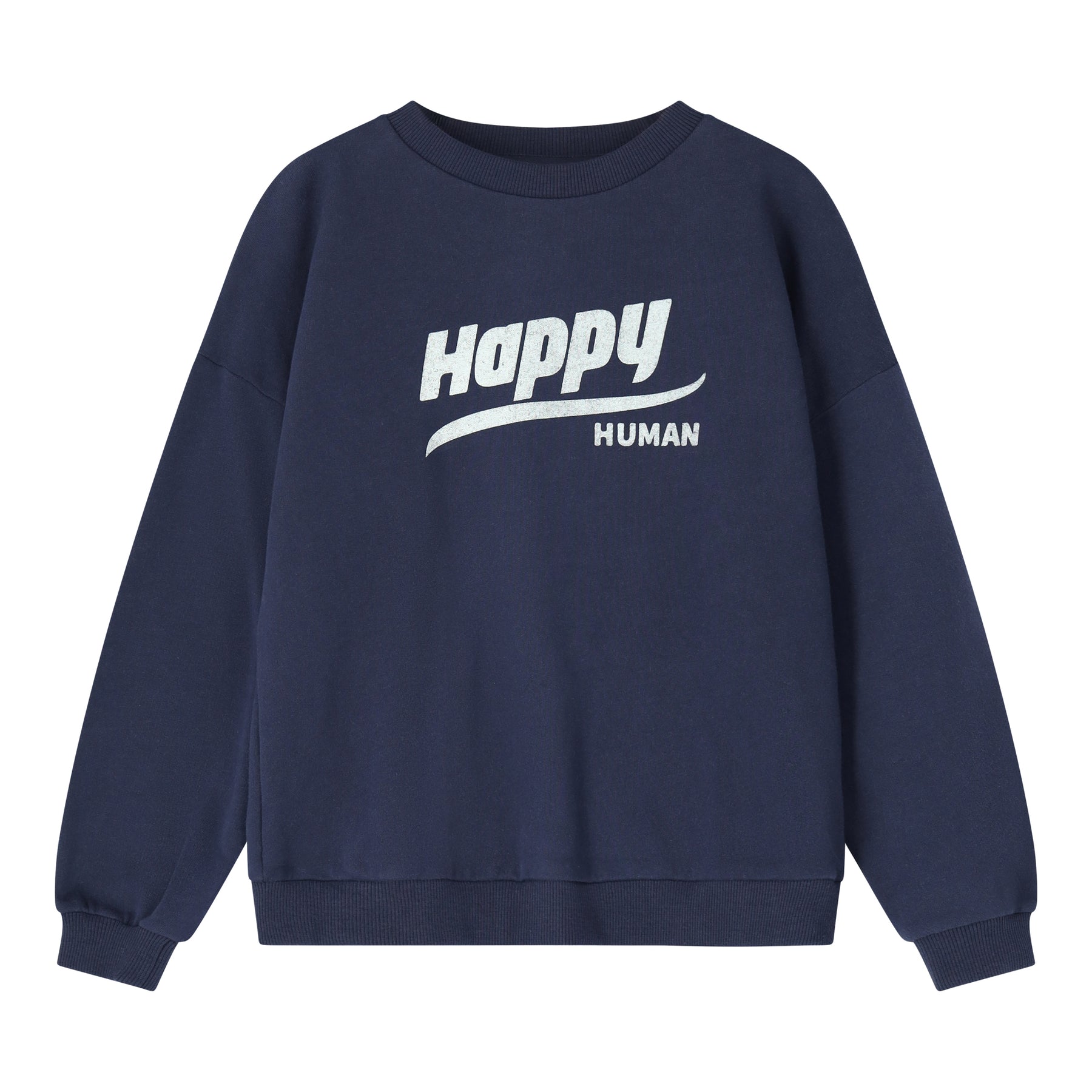Donkerblauwe trui van Cos I Said So met de opdruk "Happy Human".