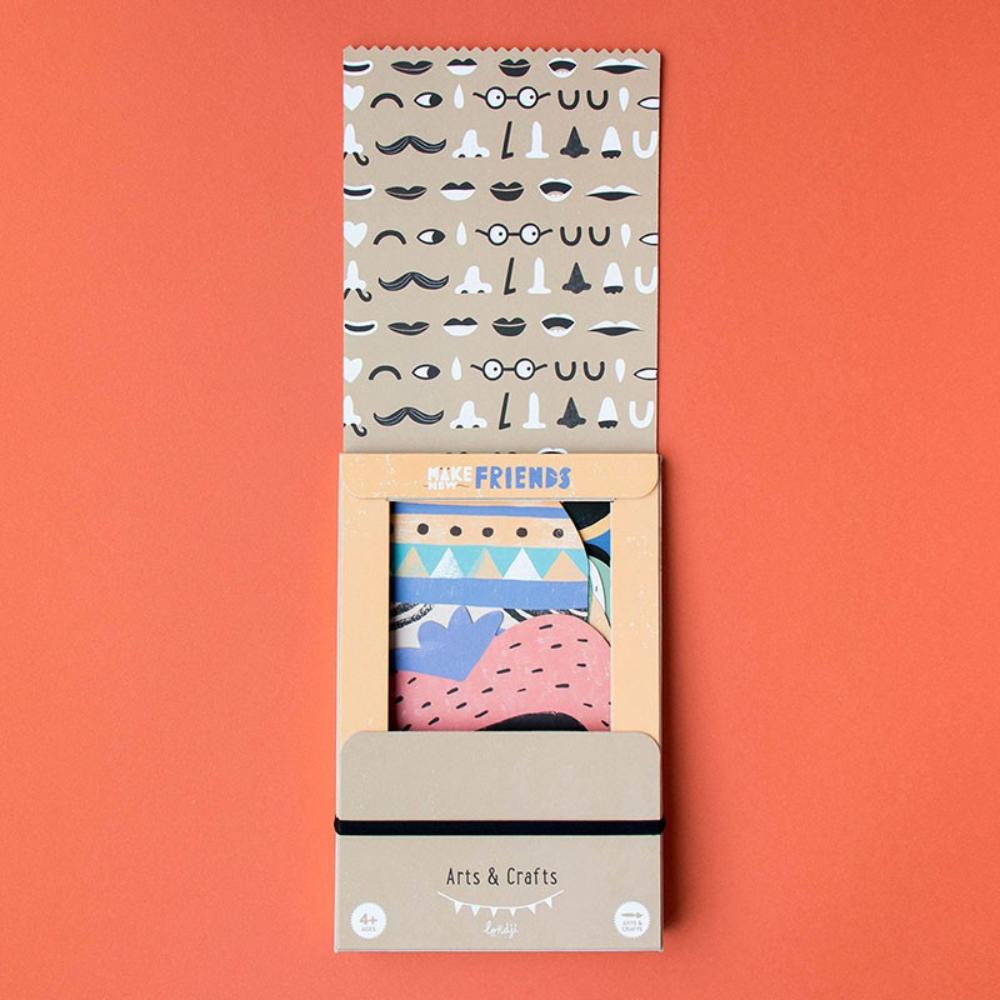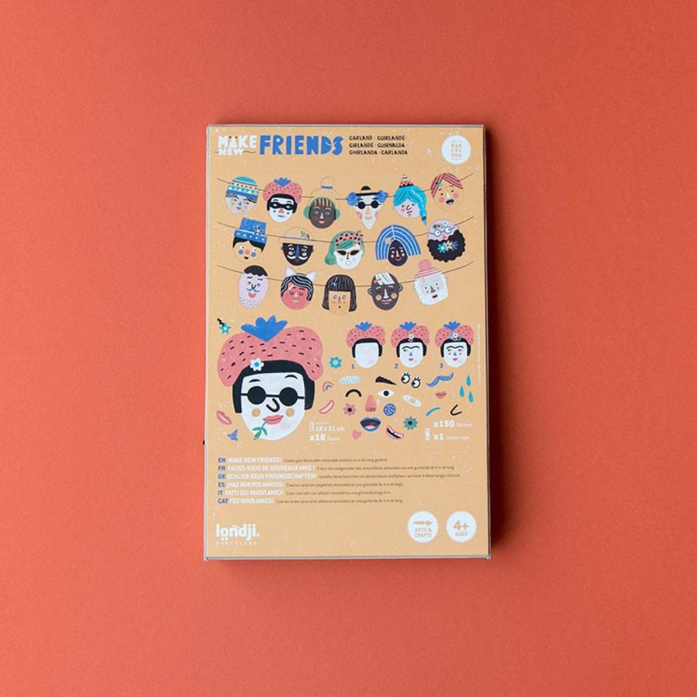 De set bevat 16 kartonnen gezichten, 150 herbruikbare stickers en een koord om de vlaggen op te hangen.