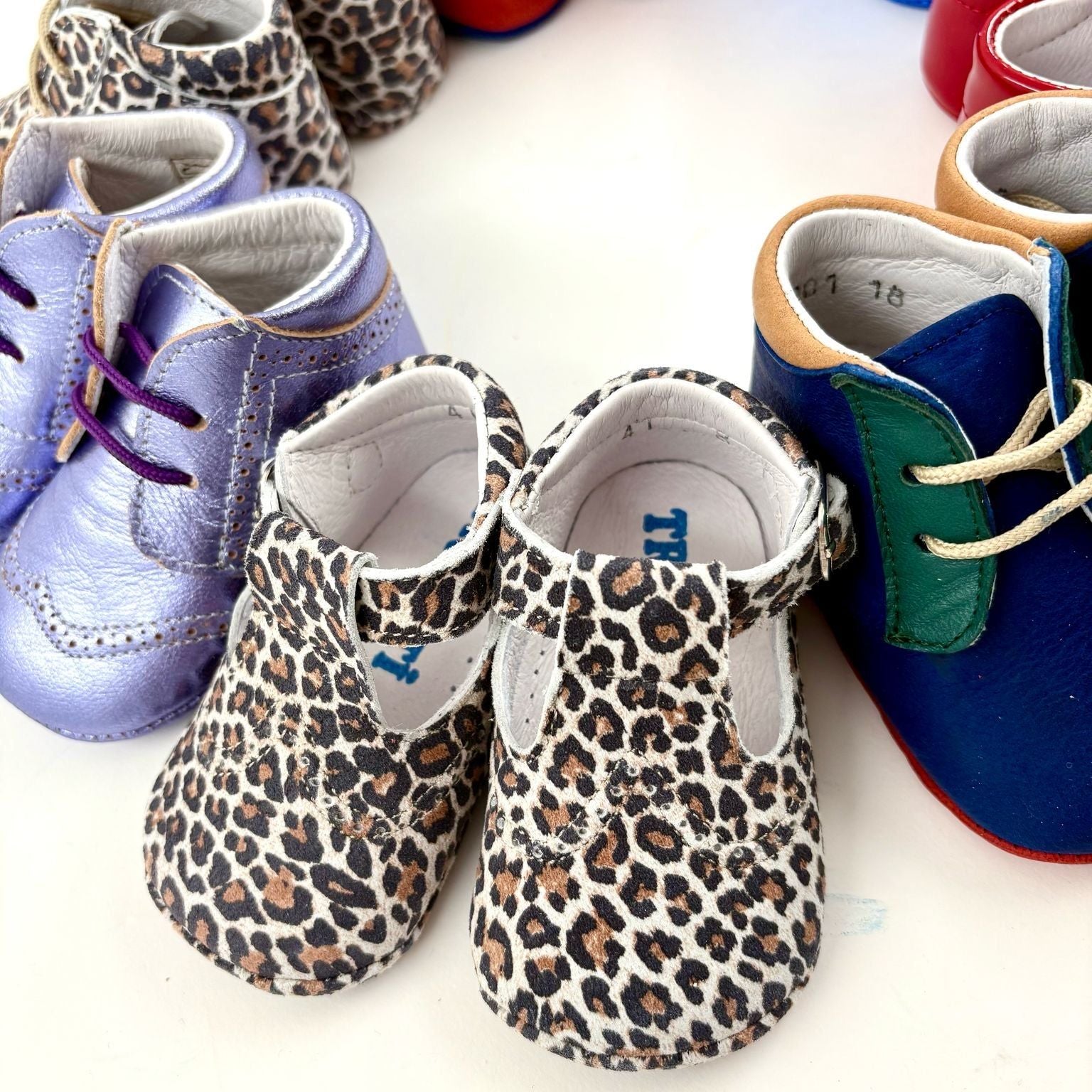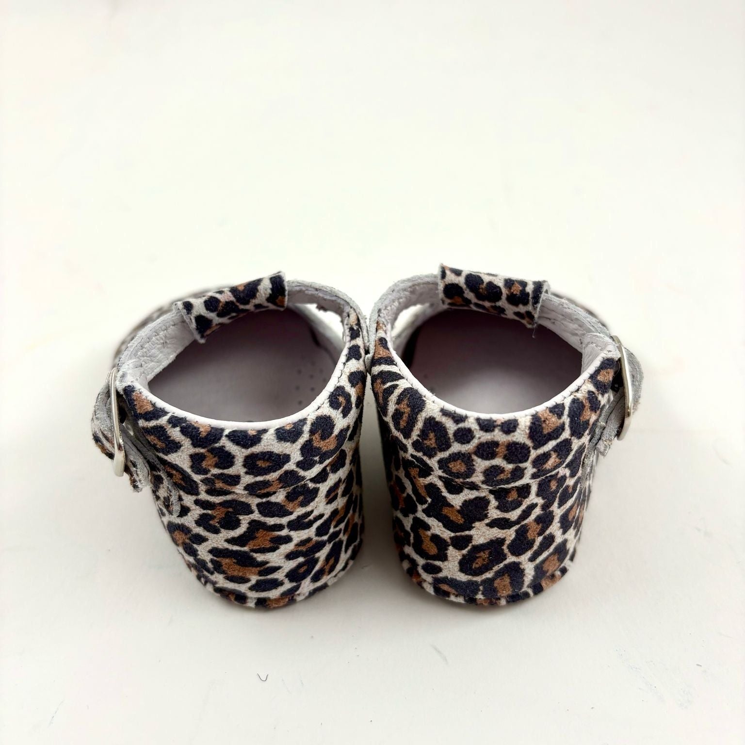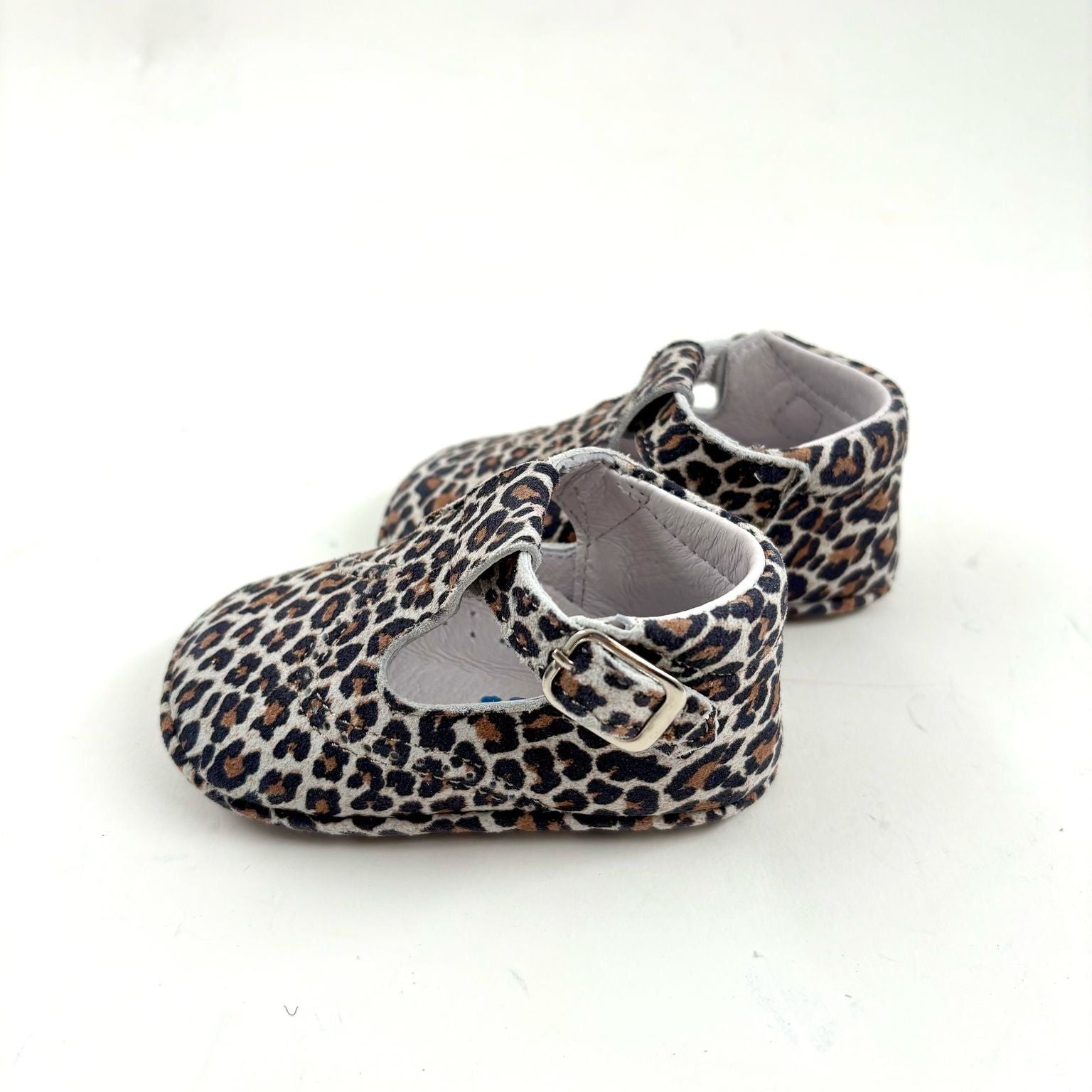 Deze schattige Mary Janes met leopardprint zijn handgemaakt in een klein Portugees atelier. Ze combineren stijl met comfort: een zacht voetbed, stevige ondersteuning en een antislipzooltje zorgen voor een perfecte pasvorm voor kruipers en eerste stappers.