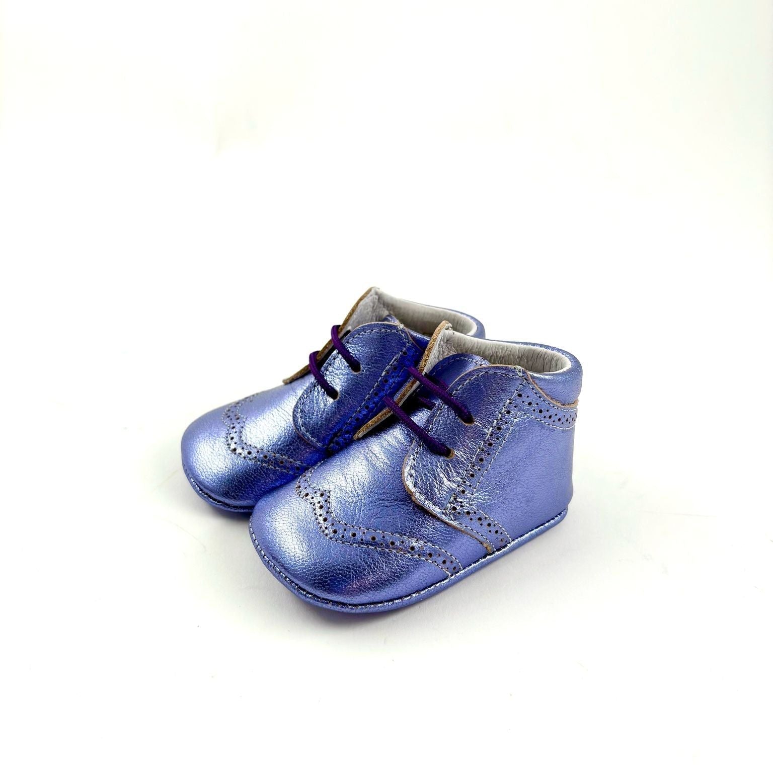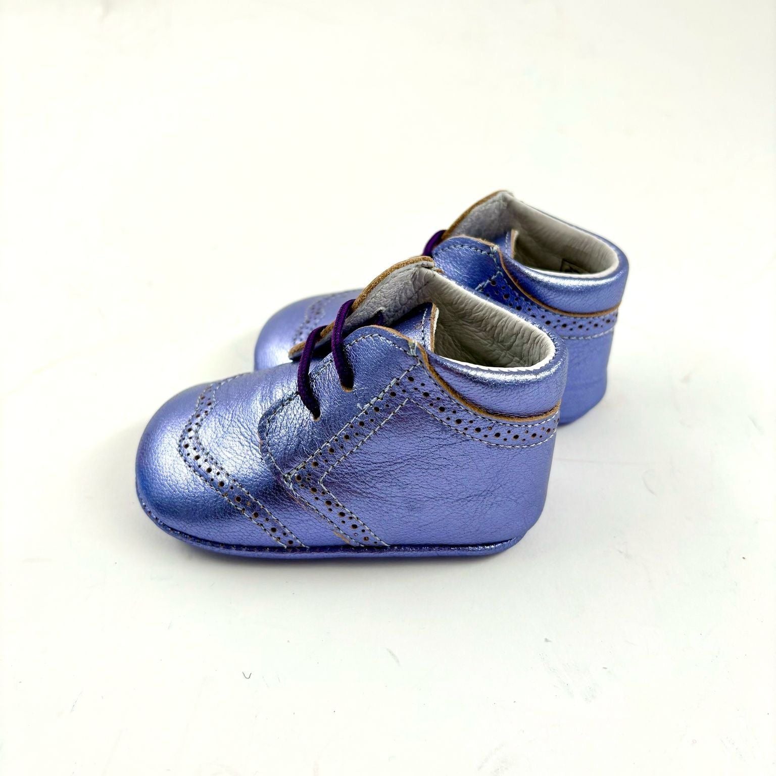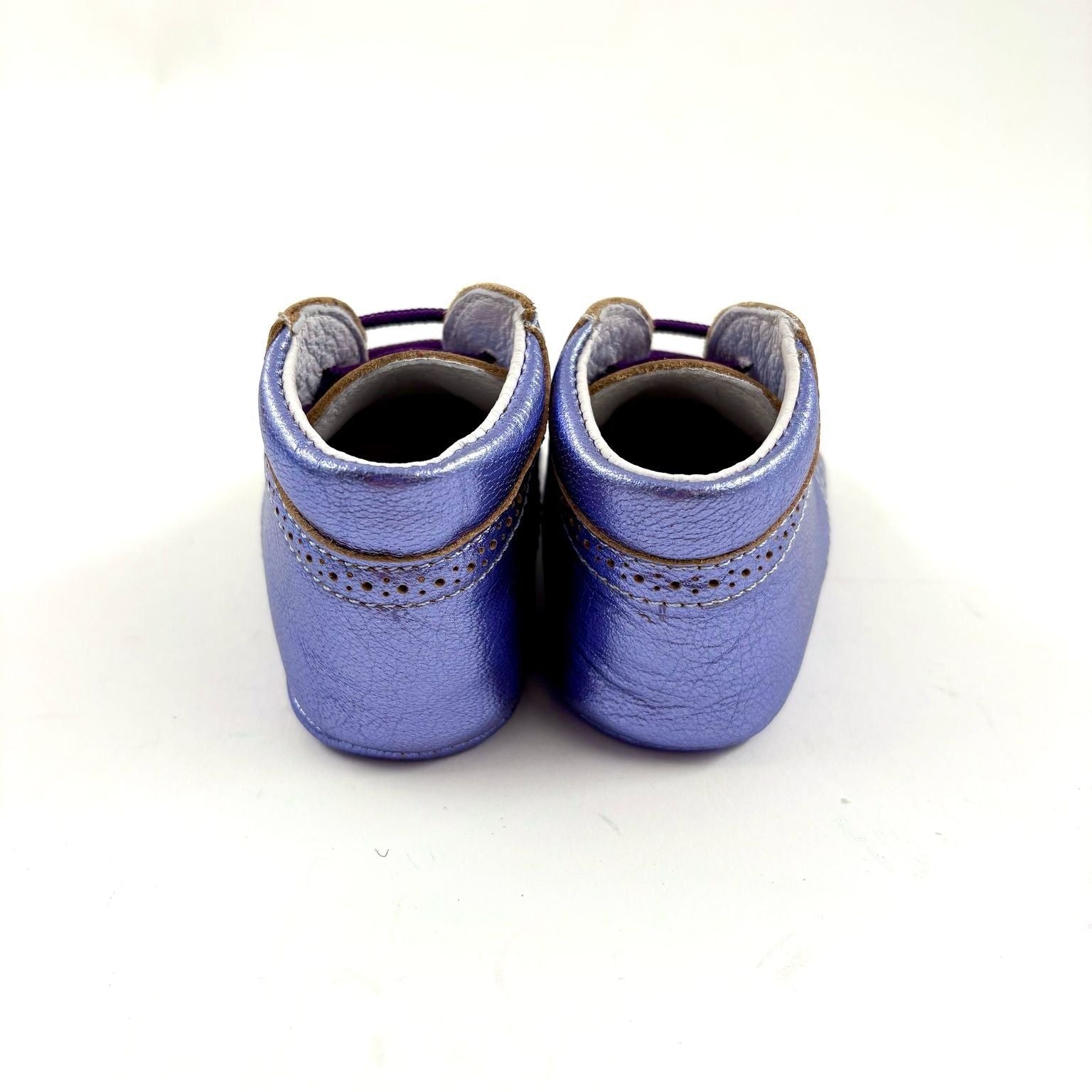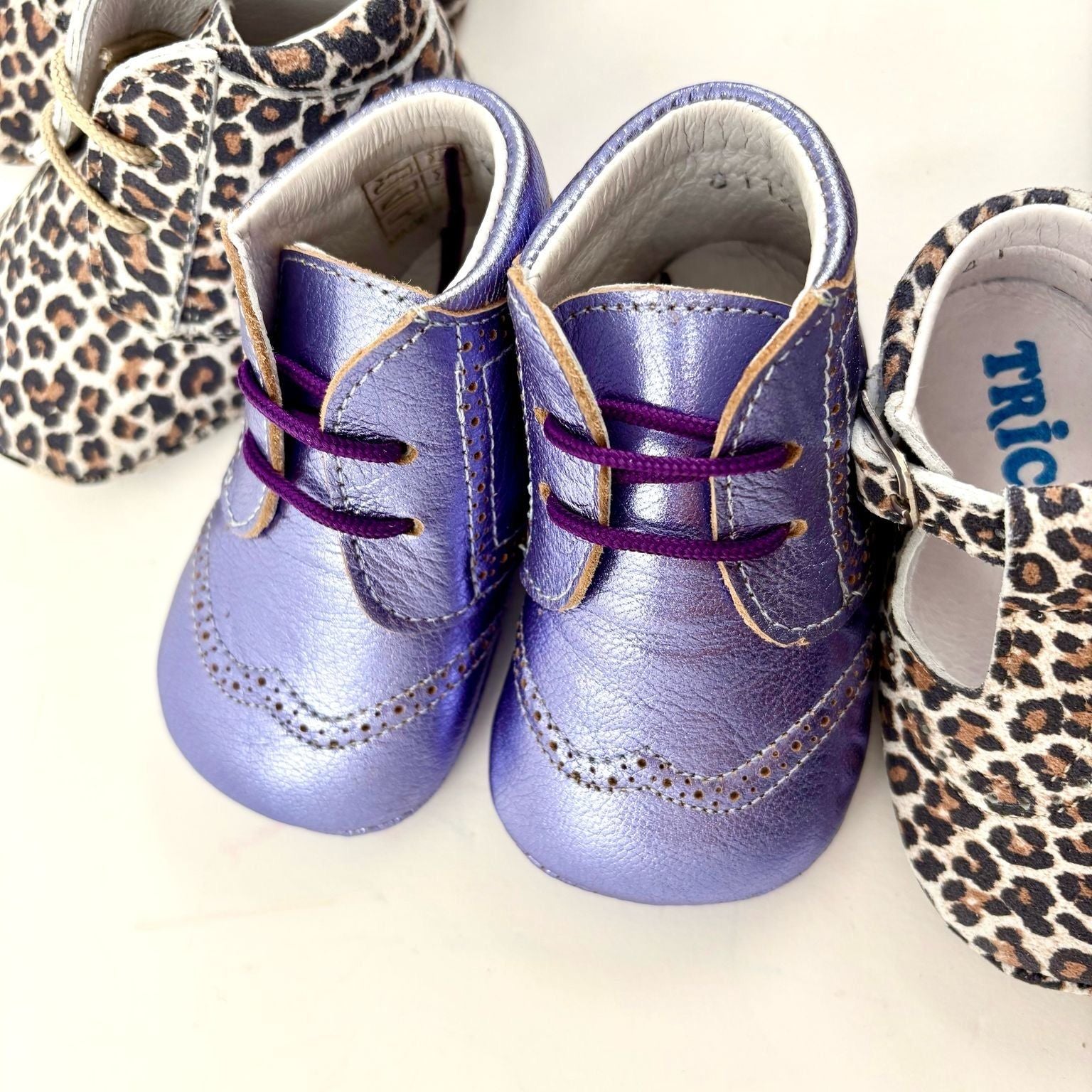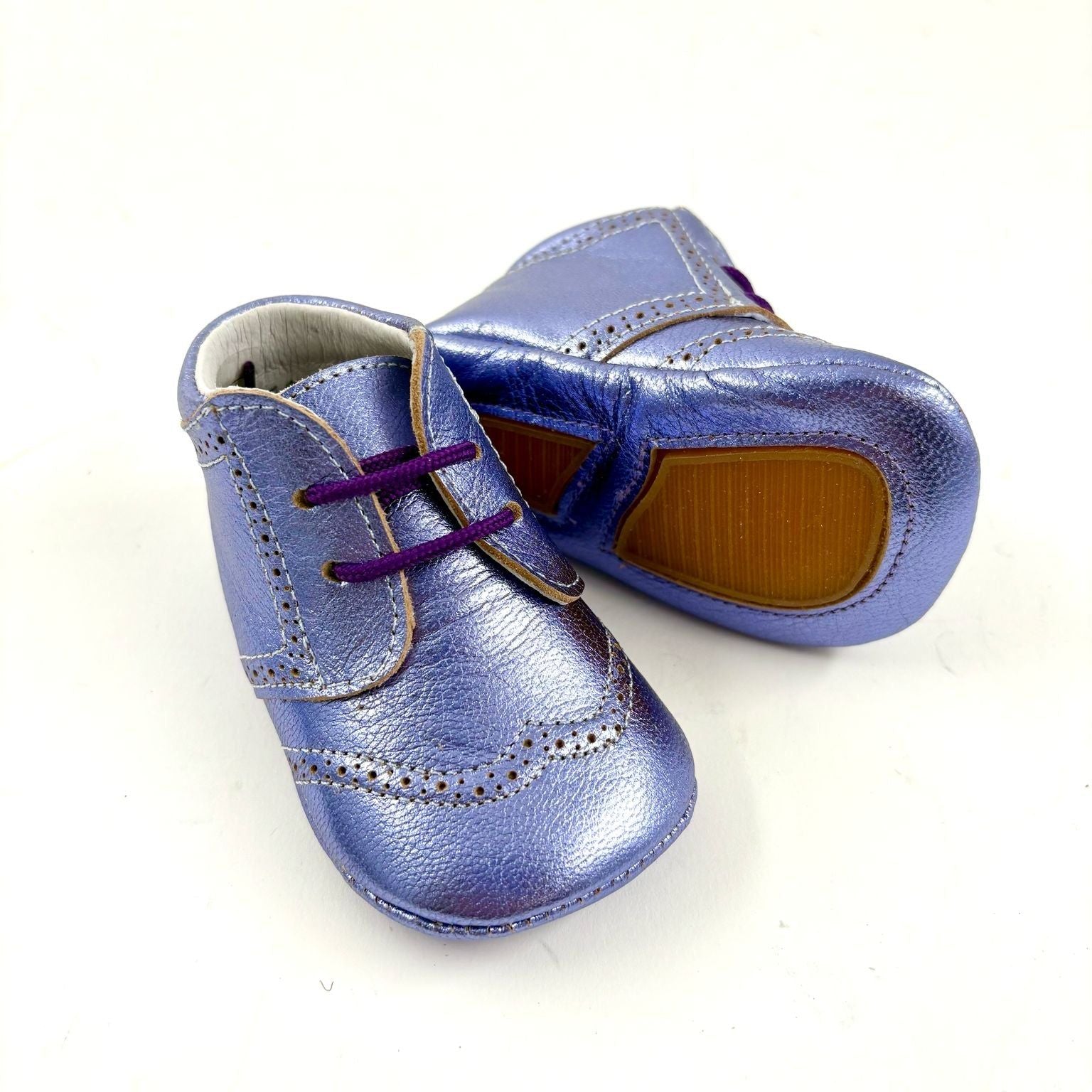 Een schitterend eerste schoentje in metallic lila leder met bijpassende paarse veters! 💜 Ontworpen door Studio Play en met de hand vervaardigd in een klein Portugees atelier. De zachte binnenkant, flexibele antislipzool en het subtiele kleurenspel maken dit schoentje uniek én comfortabel.