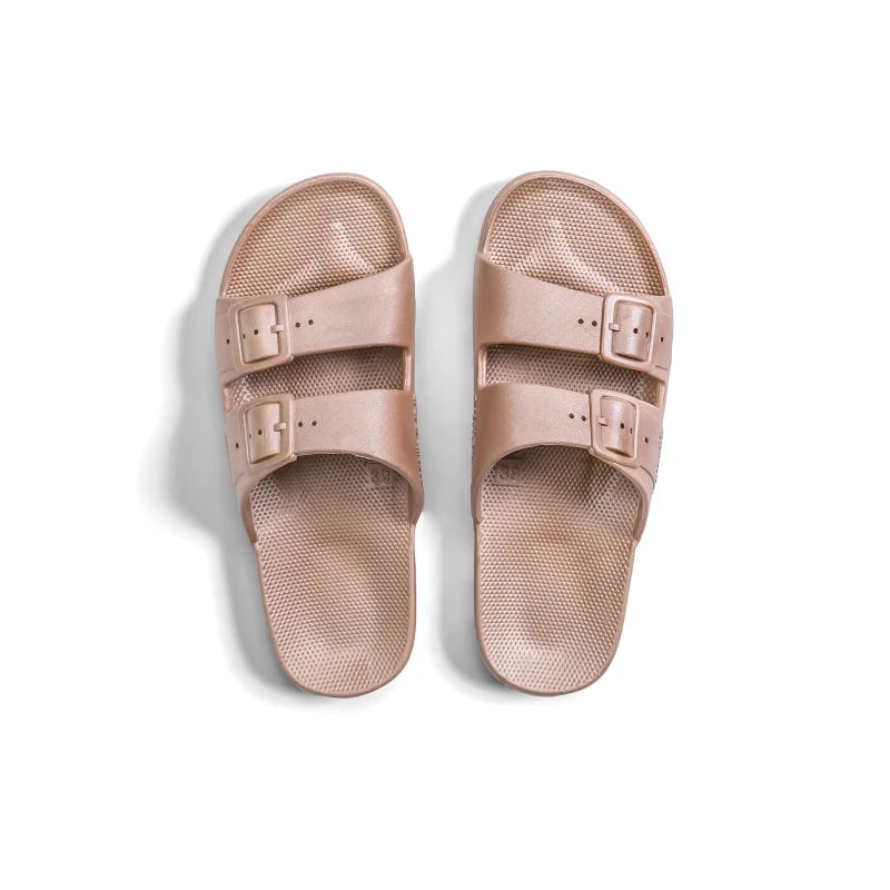 Freedom Moses biedt oogverblindende chill essentials. Cool, kleurrijk, genderloos, tijdloos en vooral leuk. Freedom Moses slides zijn cruelty-free en 100% veganistisch. Het is hun missie om een chille levensstijl te promoten zonder Mama Aarde te schaden. Ze geloven in hun producten en geven om de mensen die ze produceren. Als je Freedom Moses koopt, kan je rekenen op een bevestiging dat de fabrieken waar ze mee werken gecontroleerd en goedgekeurd zijn en een eerlijk loon en veilige werkomstandigheden bieden. Kijk rond voor de bovenaardse CHILL beweging.