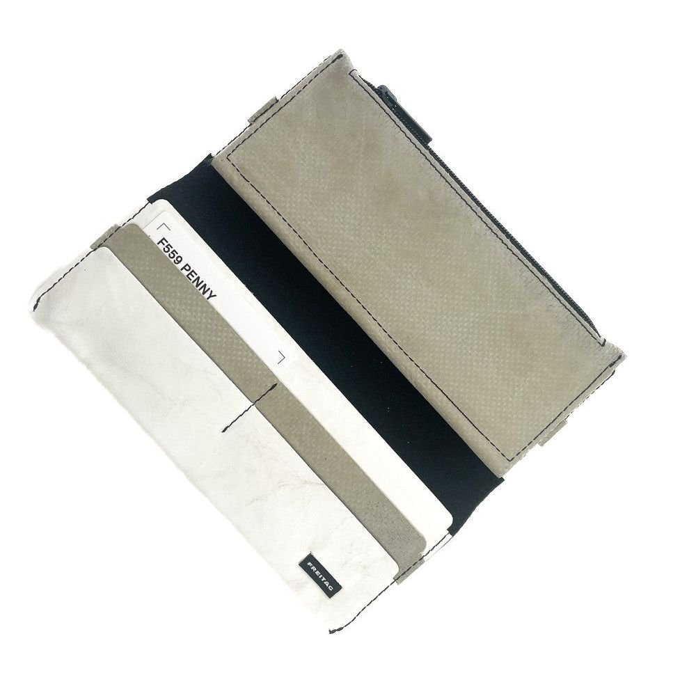 Deze grote portefeuille van FREITAG gemaakt uit gerecycleerd vrachtwagendekzeil is uniek. Er zijn er geen twee zoals deze.  Kijk hier in deze video wat de F559 PENNY kan.