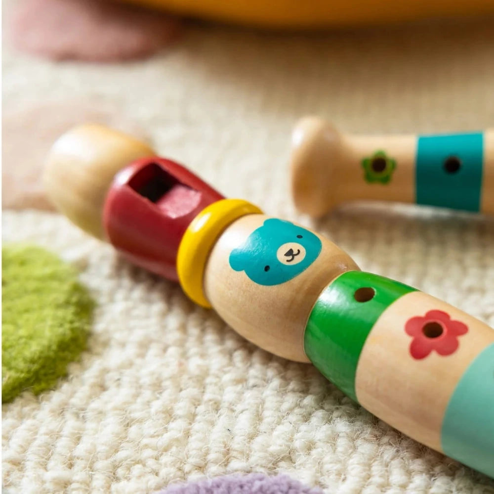 Laat uw kleintje kennismaken met het plezier van spelen met toonhoogte en het creëren van variatie in geluid met de Playful Tunes houten blokfluit van Petit Collage! Dit eenvoudig te bespelen speelgoedinstrument is een geweldige start voor muzikanten in de dop. De vrolijk lachende beer en de felle kleuren moedigen kinderen aan om het instrument op te pakken en te gaan spelen zonder zich geïntimideerd te voelen. Het grote formaat en de duidelijk gemarkeerde gaatjes maken dit instrument ideaal voor peuters. Door met hun adem geluiden te maken die van toonhoogte veranderen naargelang de positie van hun vingers, ontwikkelen ze een beter begrip van oorzaak en gevolg. De blokfluit is perfect voor kinderen vanaf 3 jaar en stimuleert de cognitieve ontwikkeling, hand-oogcoördinatie en auditief leren. Gemaakt van FSC-hout en bedrukt met inkt op waterbasis. Verpakking bedrukt met 75% gerecycled materiaal, FSC-papier en plantaardige inkt.
