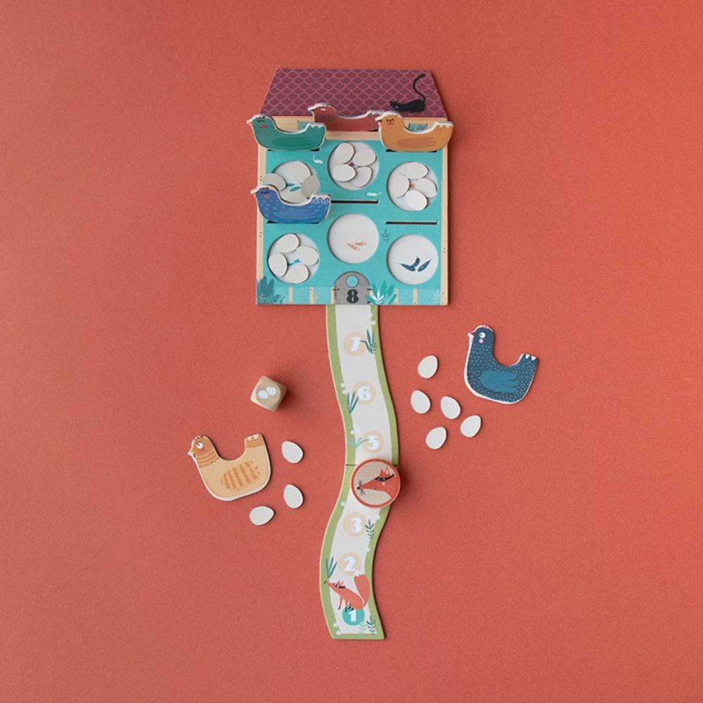 Het geluk van de dobbelstenen zal bepalen of we één ei, twee eieren, één van de kippen kunnen redden of dat we de vos langs het pad moeten verplaatsen. We zullen de beste beslissing moeten nemen om ons doel te bereiken.
