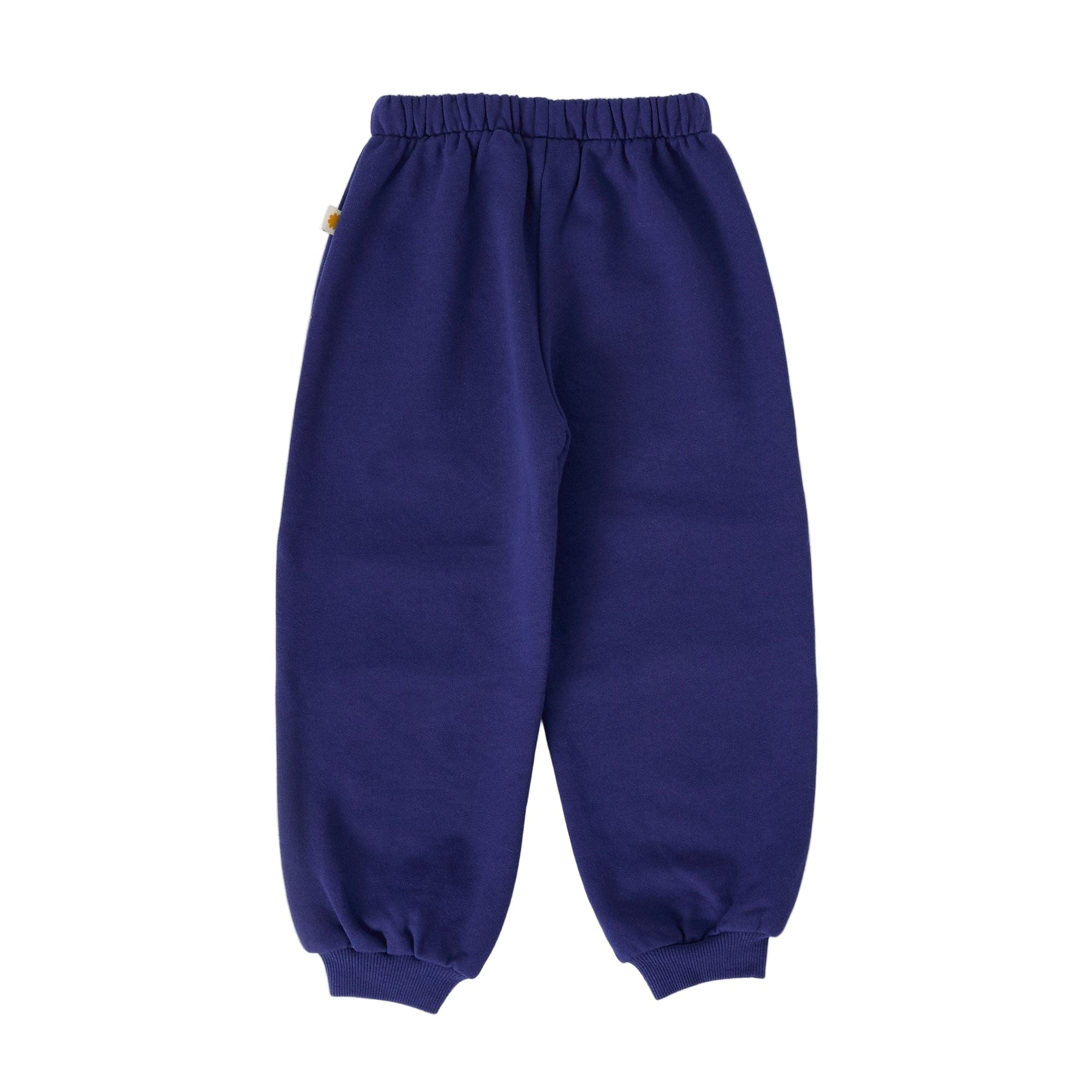 Deze kleurrijke joggingbroek is gemaakt van katoen en is donkerblauw met rode en gele kleurpanelen en witte details. De broek blijft comfortabel zitten door de elastische taille en het trekkoord. De broek sluit goed aan bij de enkels zodat de warmte binnen blijft.