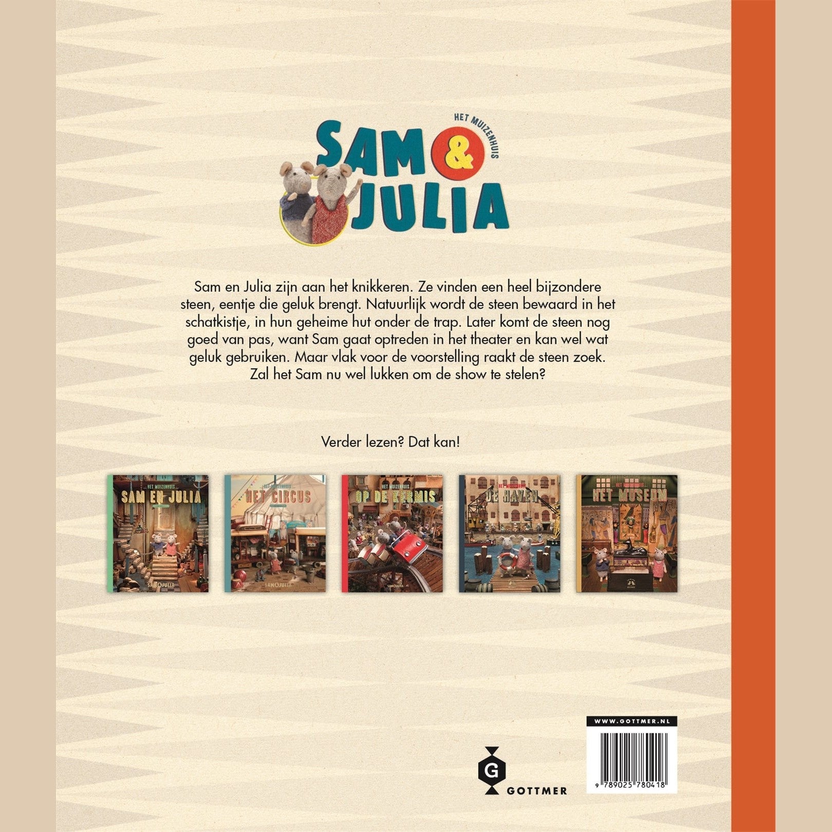 Ga mee naar het theater in dit tweede deel uit de populaire prentenboekenreeks over Het Muizenhuis. Sam en Julia zijn aan het knikkeren. Ze vinden daarbij een heel bijzondere steen, eentje die geluk brengt. Deze waardevolle schat wordt veilig bewaard in hun speciale schatkistje, verborgen in hun geheime hut onder de trap. De gelukssteen zal nog goed van pas komen, want Sam gaat optreden in het theater, samen met Ella Ballerina. De arme Sam is heel zenuwachtig voor de voorstelling, dus hij kan wel wat geluk gebruiken!