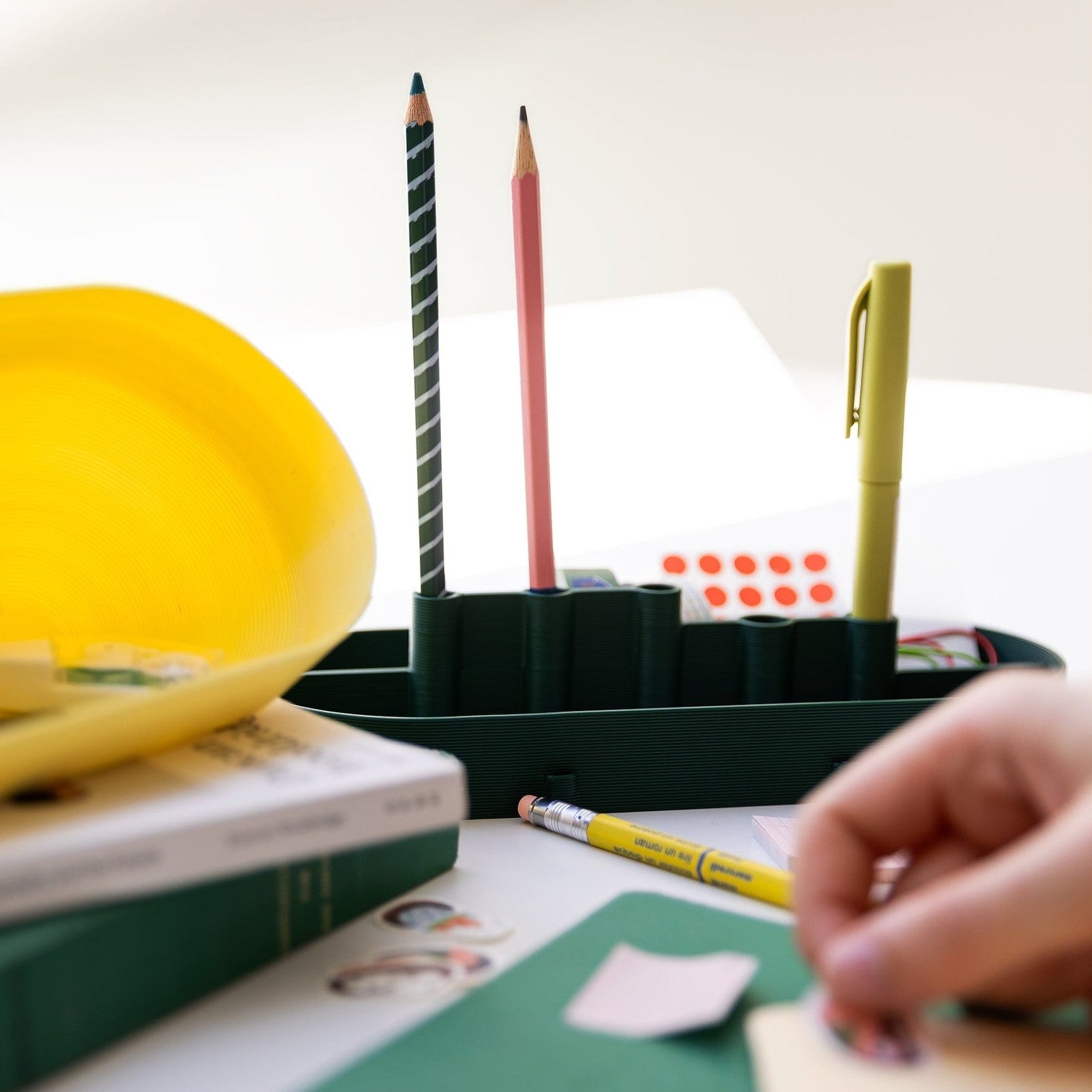 De onderkant van de gereedschapskist is verdeeld in verschillende compartimenten voor je potloden, stiften, tangen, schroevendraaiers... Bovenop zit een hoed, waarvan de schuine zijkanten ervoor zorgen dat je hem omdraait tot een organizer voor in je broekzak. De twee delen kunnen onafhankelijk van elkaar worden gebruikt als organizer voor op je bureau, of gesloten worden gehouden door de elastieken die een derde kleurrijk accent toevoegen: je kunt hem dan in je tas stoppen en overal mee naartoe nemen.