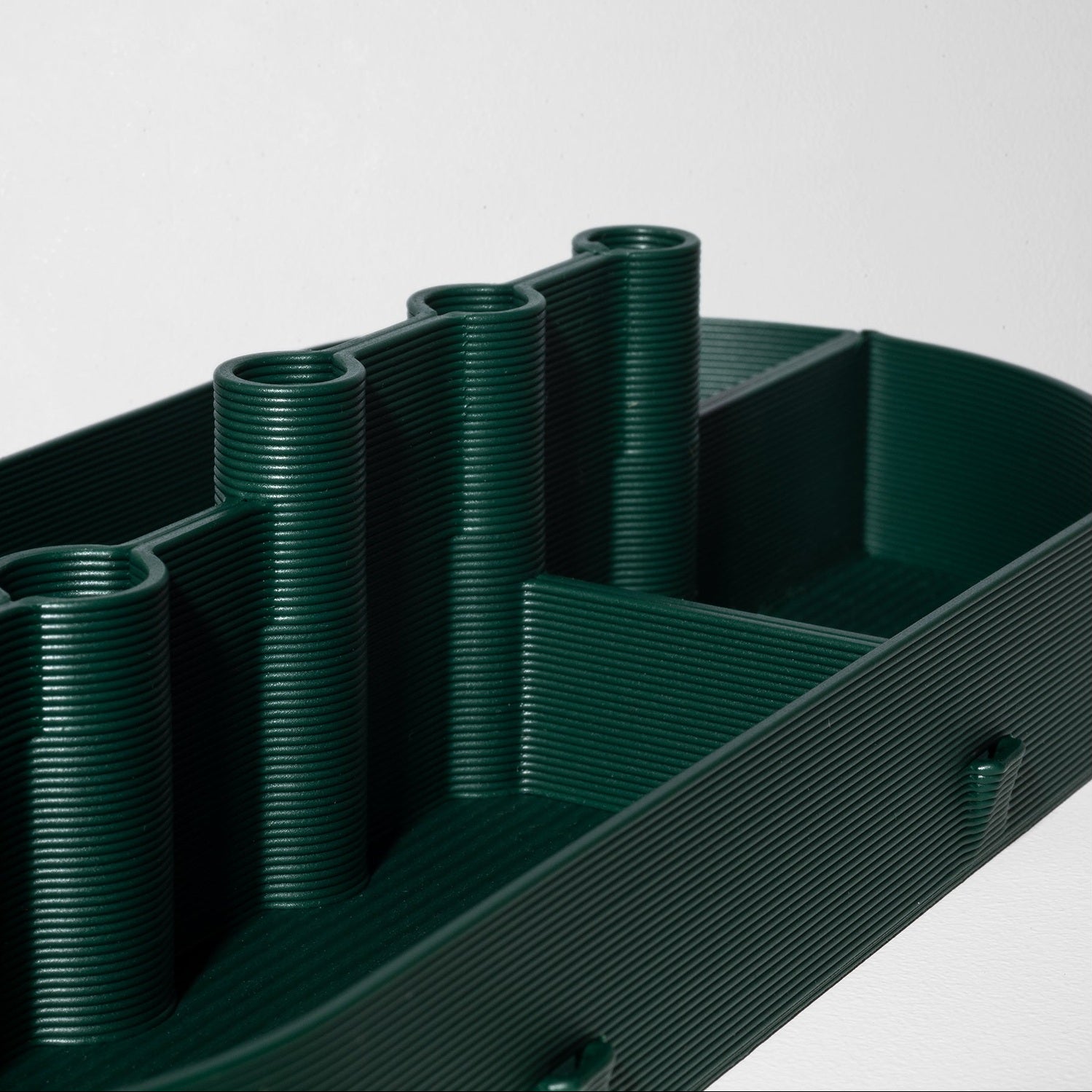 De ontwerpen van Warren & Laetitia worden volledig in 3D geprint met gerecyclede of recyclebare materialen, zoals rPLA (van voedselverpakkingen) en rPETG (van plastic flessen). Ze optimaliseren elk ontwerp voor het printproces zelf, waardoor minimale verspilling ontstaat en elke vorm functioneel én bewust ontworpen is.