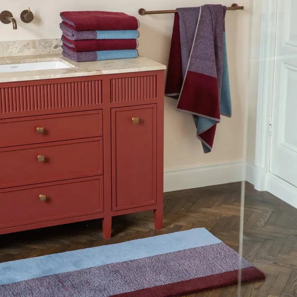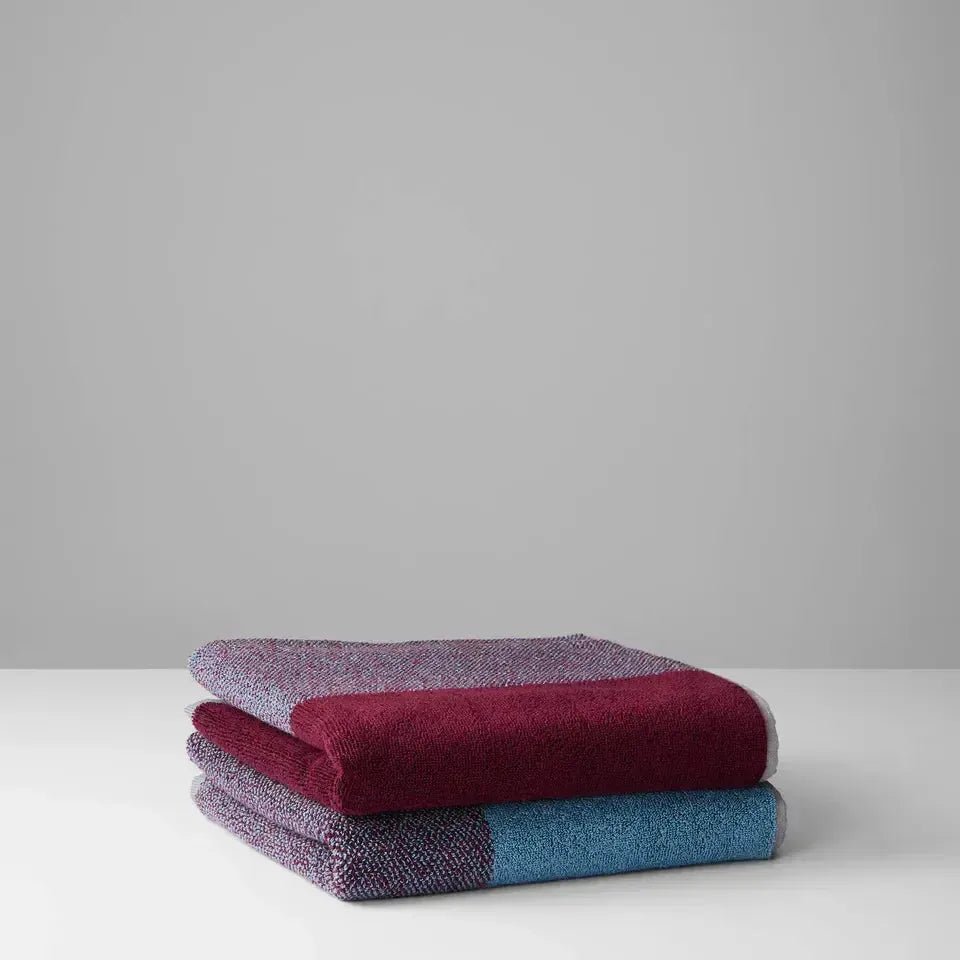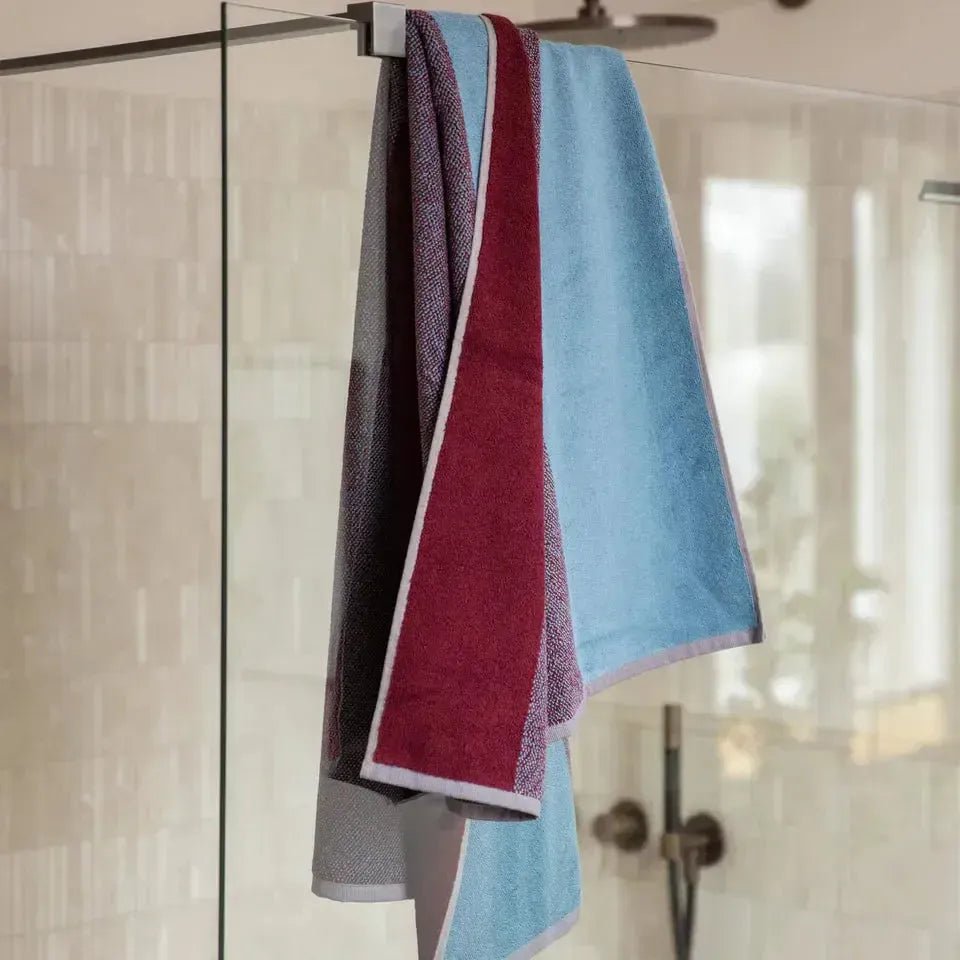 Deze Suite702 badhanddoeken set (50x100 cm) combineert zachtheid en compacte stevigheid dankzij de korte lussen. Gemaakt van 100% biologisch gekamd terry katoen, zorgt deze set voor een luxe en duurzame ervaring in je badkamer. De kleuren Sky Blue en Bordeaux vloeien in het midden samen tot een elegante mengkleur.