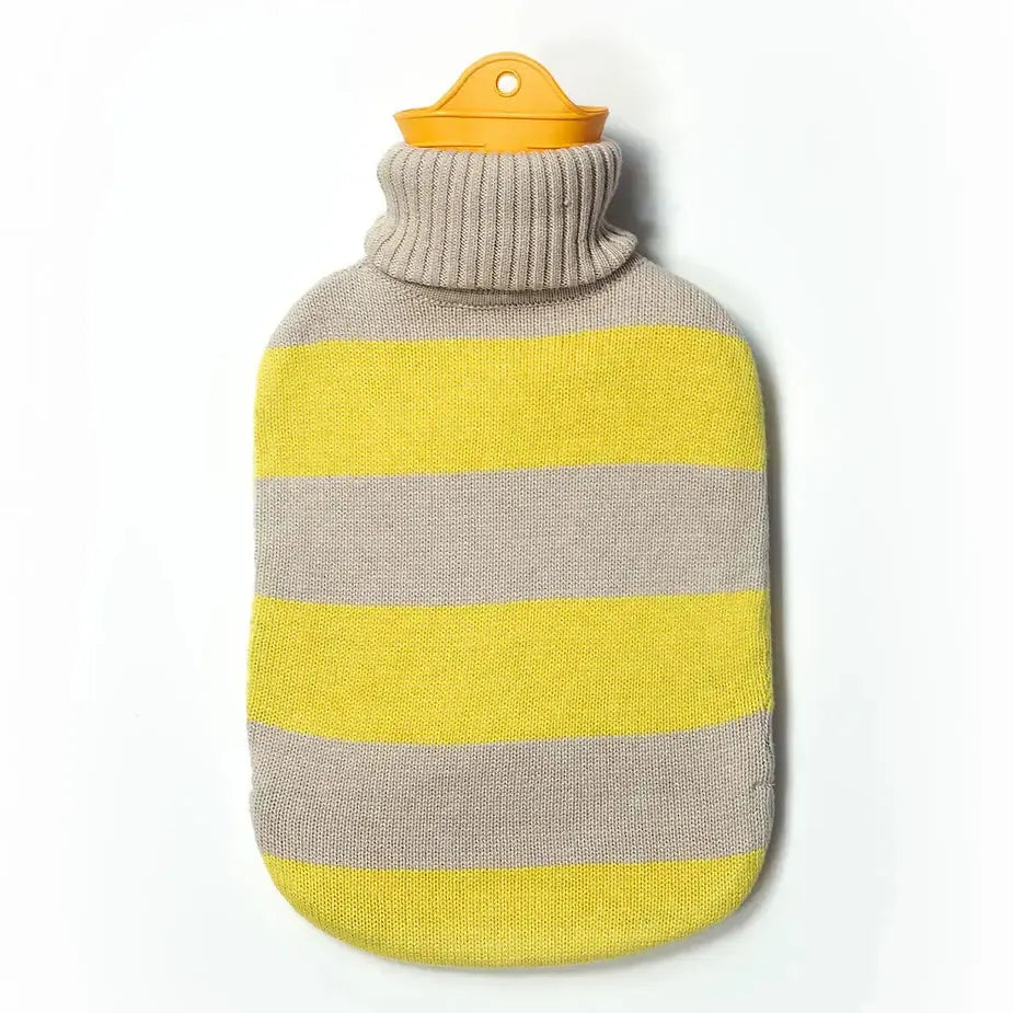 De kruik van natuurlijk latex rubber met gebreid hoesje van biologisch katoen. Het hoesje is heerlijk zacht en kriebelt niet. Met de modieuze kleur samenstellingen past deze kruik niet alleen in bed maar ook op de bank.