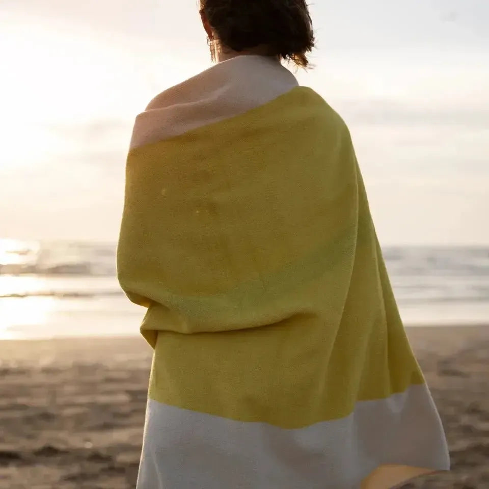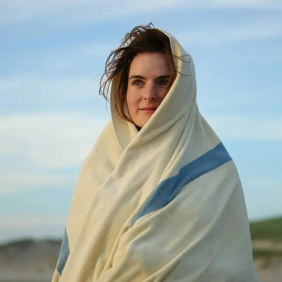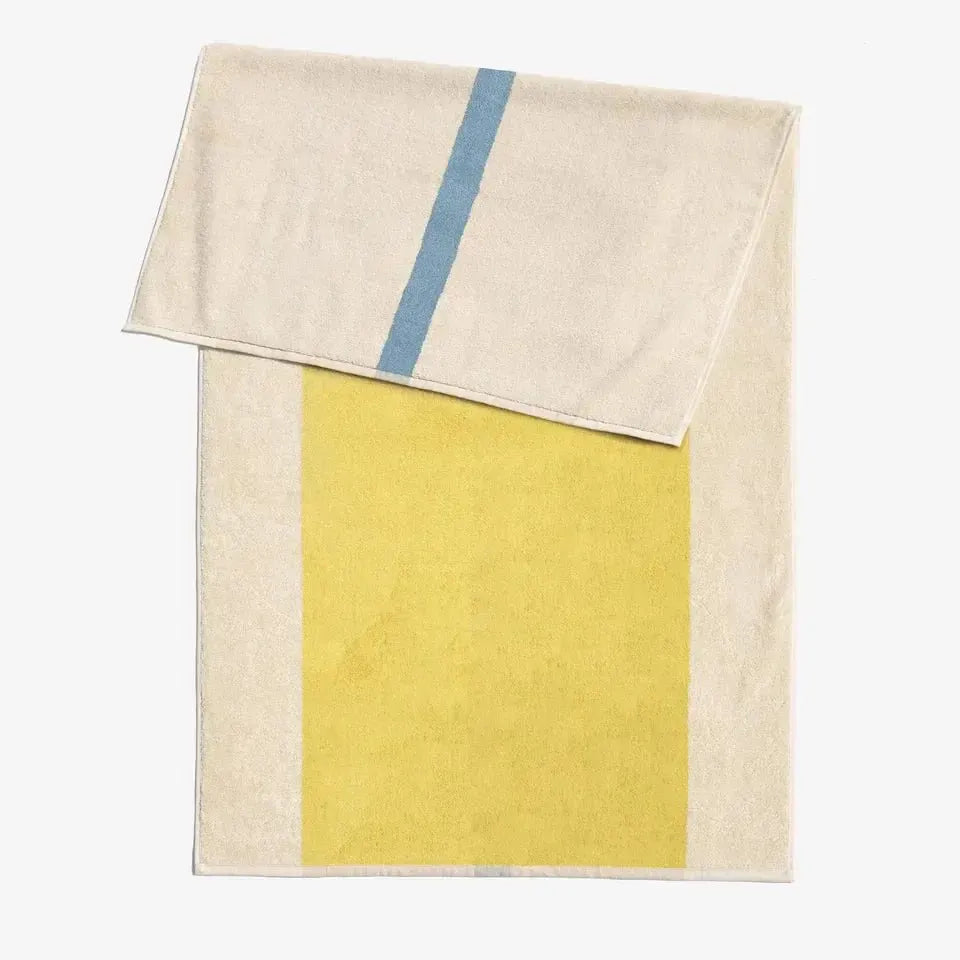Het strandlaken sky blue/yellow is 90x180, gemaakt van heerlijk zacht biologisch katoen en heeft een gewicht van 420 gram per vierkante meter. Dankzij de korte lussen is het strandlaken lekker licht en voelt hij uitzonderlijk zacht aan.