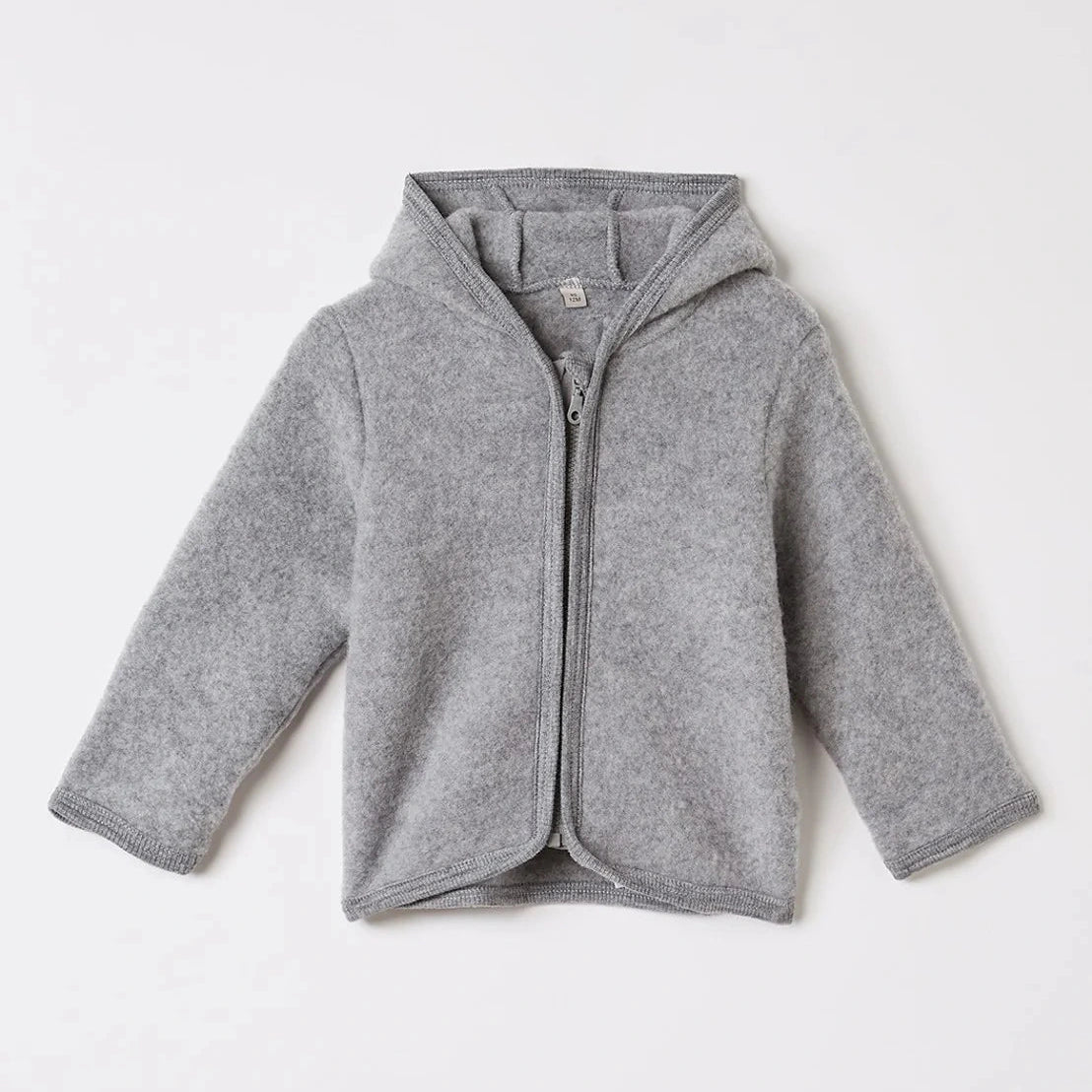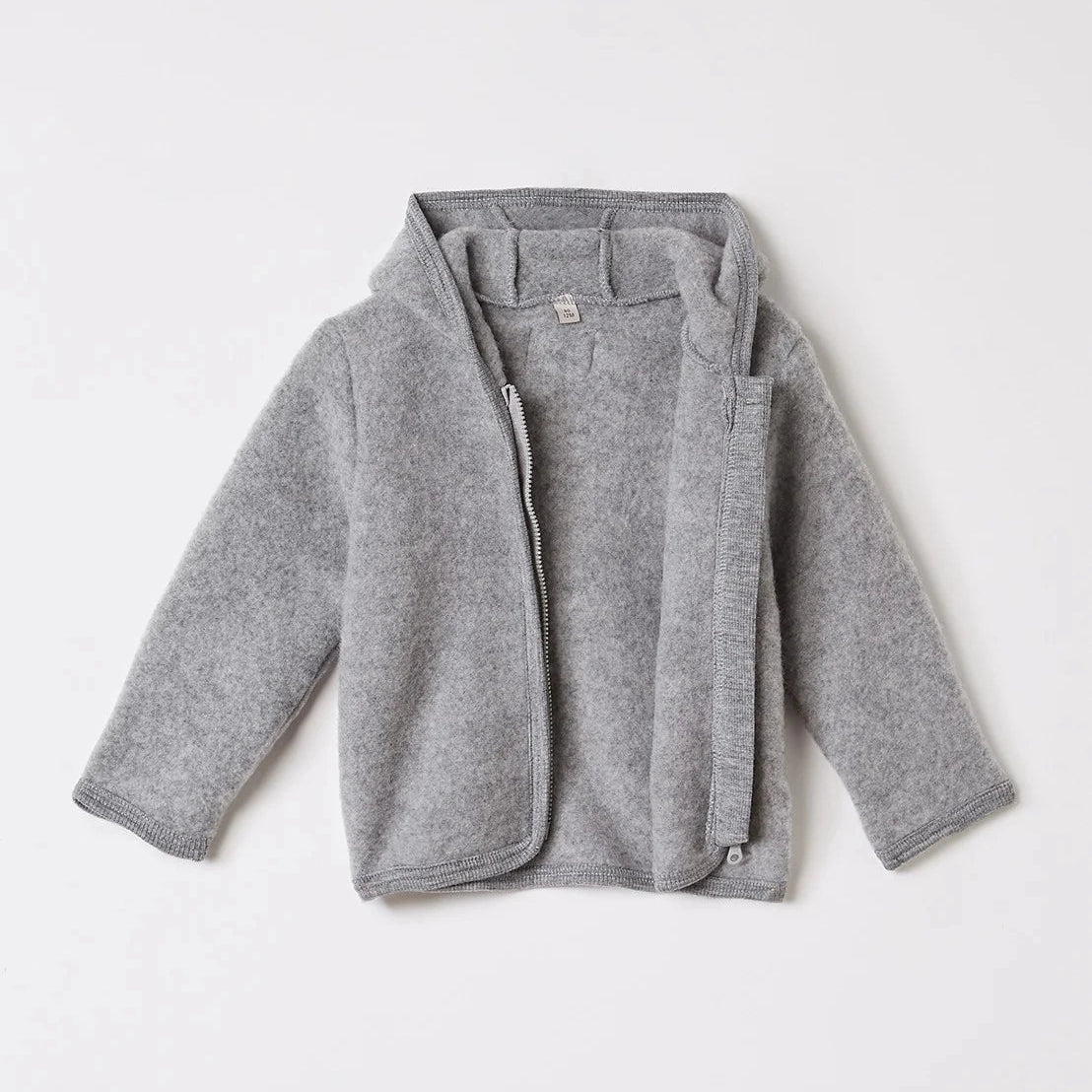 Deze schattige wollen fleece jas van HUTTEliHUT is gemaakt van 100% zachte merinowol en houdt je kleintje heerlijk warm. De vaste capuchon is afgewerkt met speelse konijnenoortjes, wat zorgt voor een onweerstaanbare look. De jas sluit vooraan met een handige rits met kinbescherming, en heeft zachte ribboorden aan alle uiteinden voor extra comfort.
