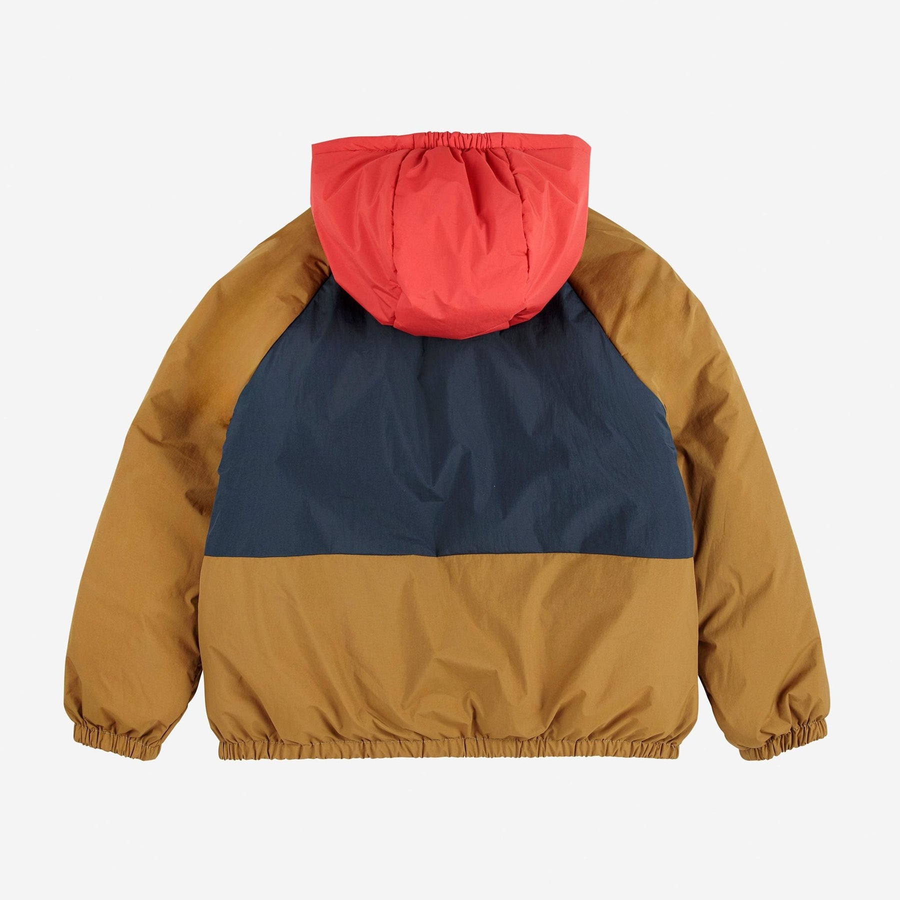 Dikke, warme winterjas met kap van Bobo Choses. De jas is omkeerbaar en de ene kant is met hondjes de andere color block.