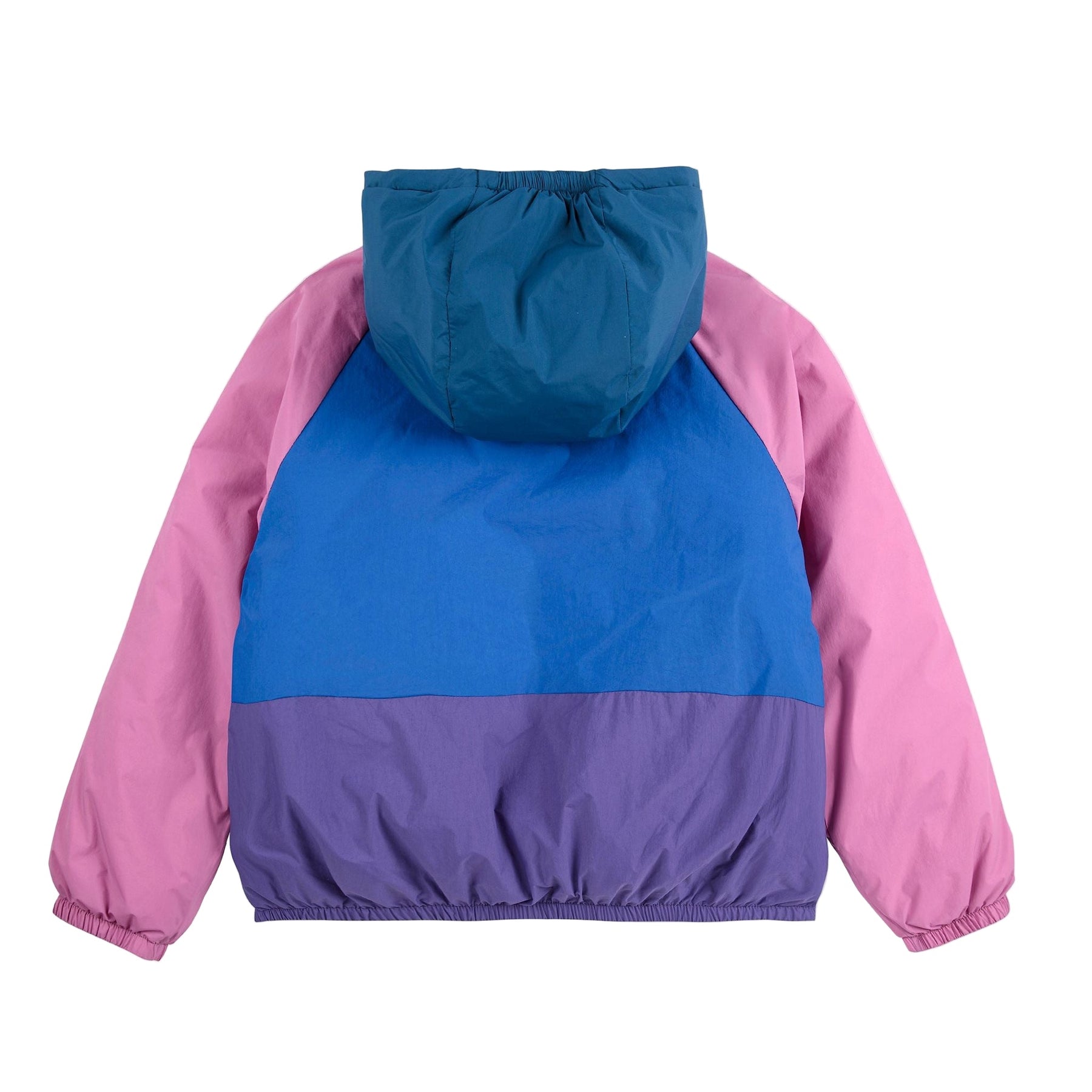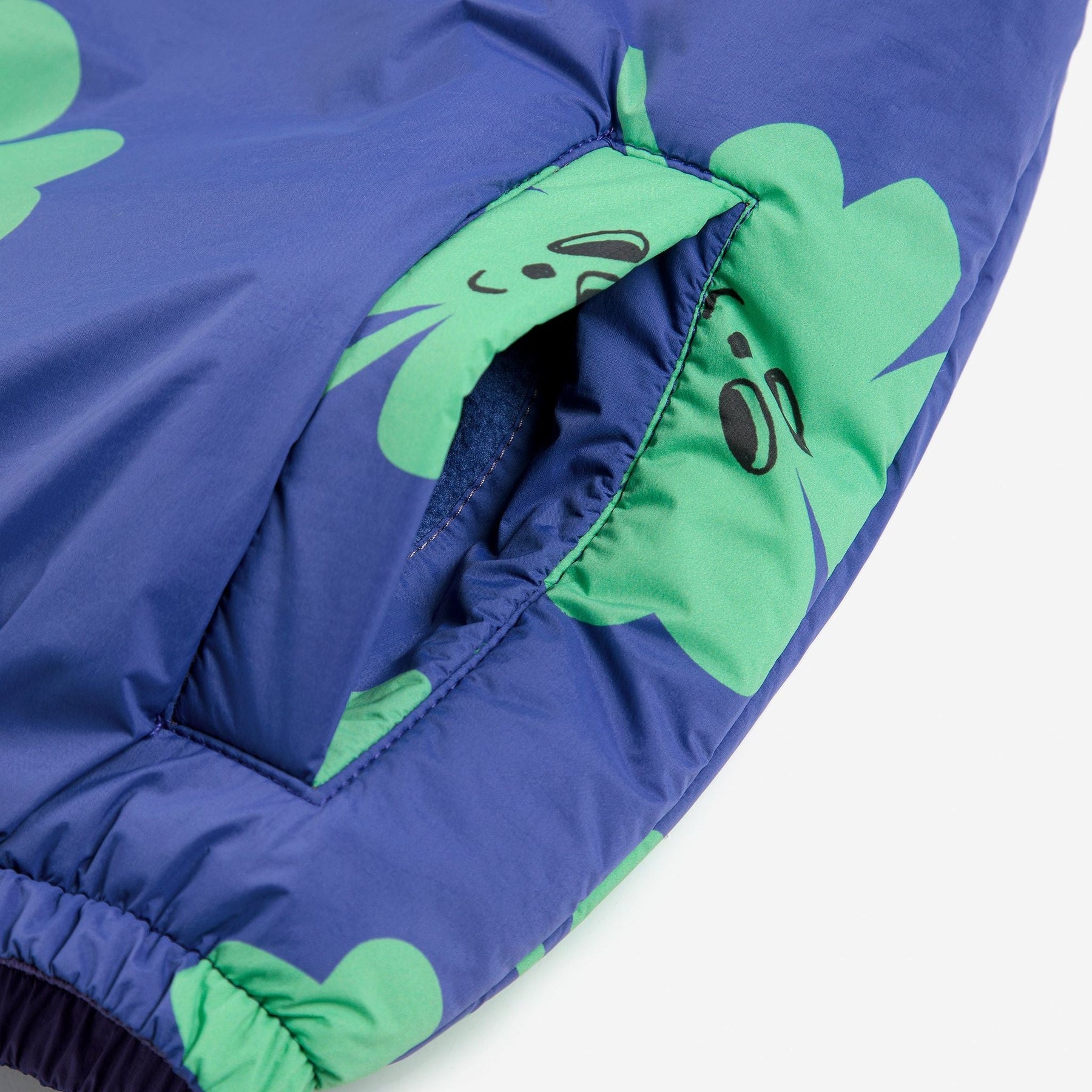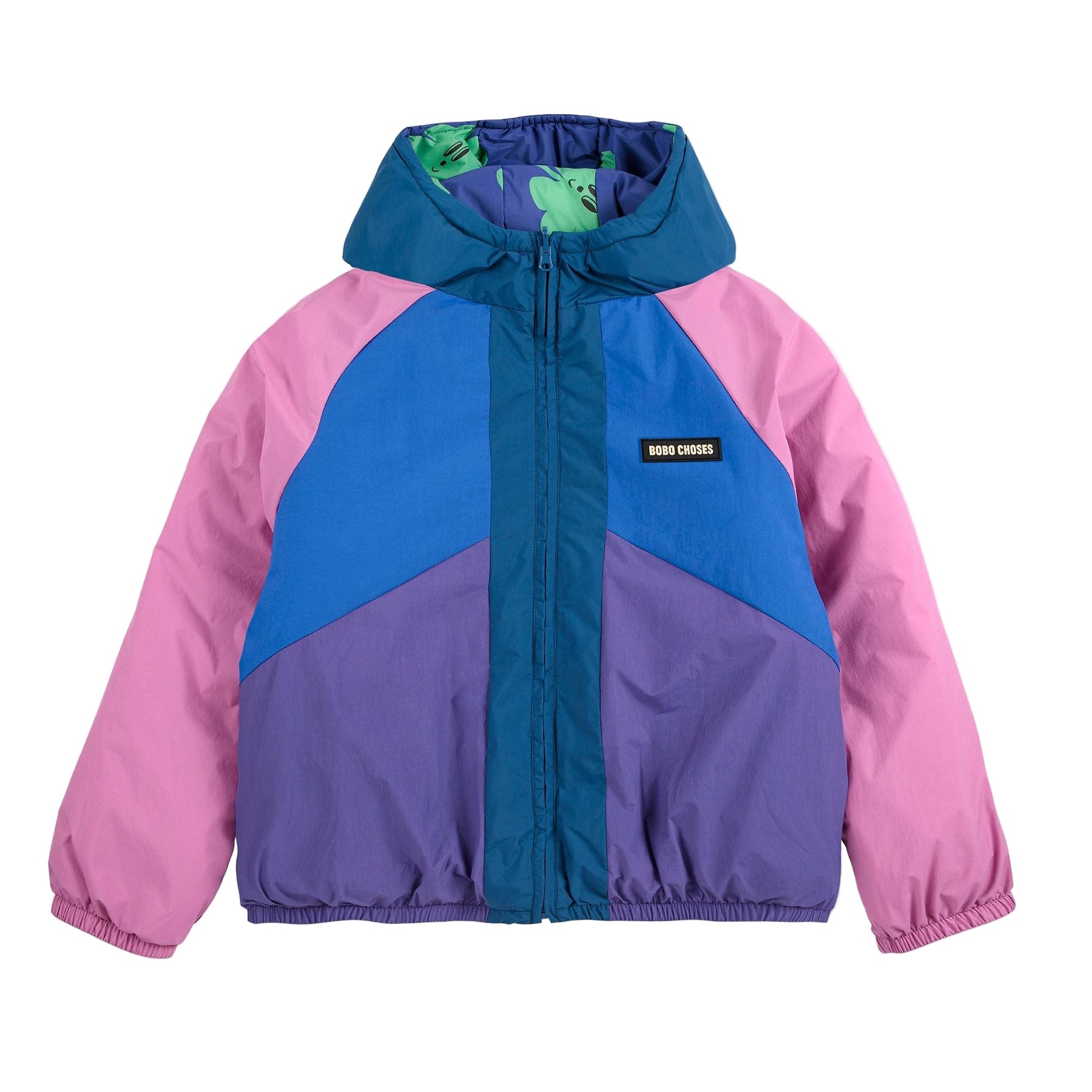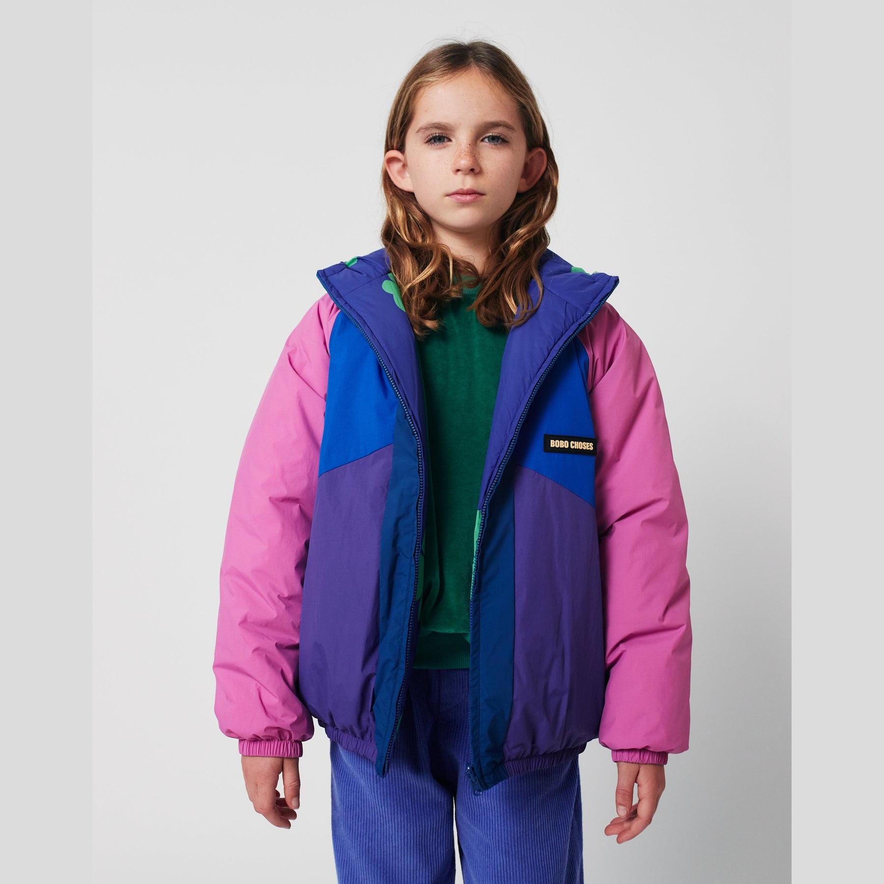 Dikke, warme winterjas met kap van Bobo Choses. De jas is omkeerbaar en de ene kant is met klaver en de andere color block.