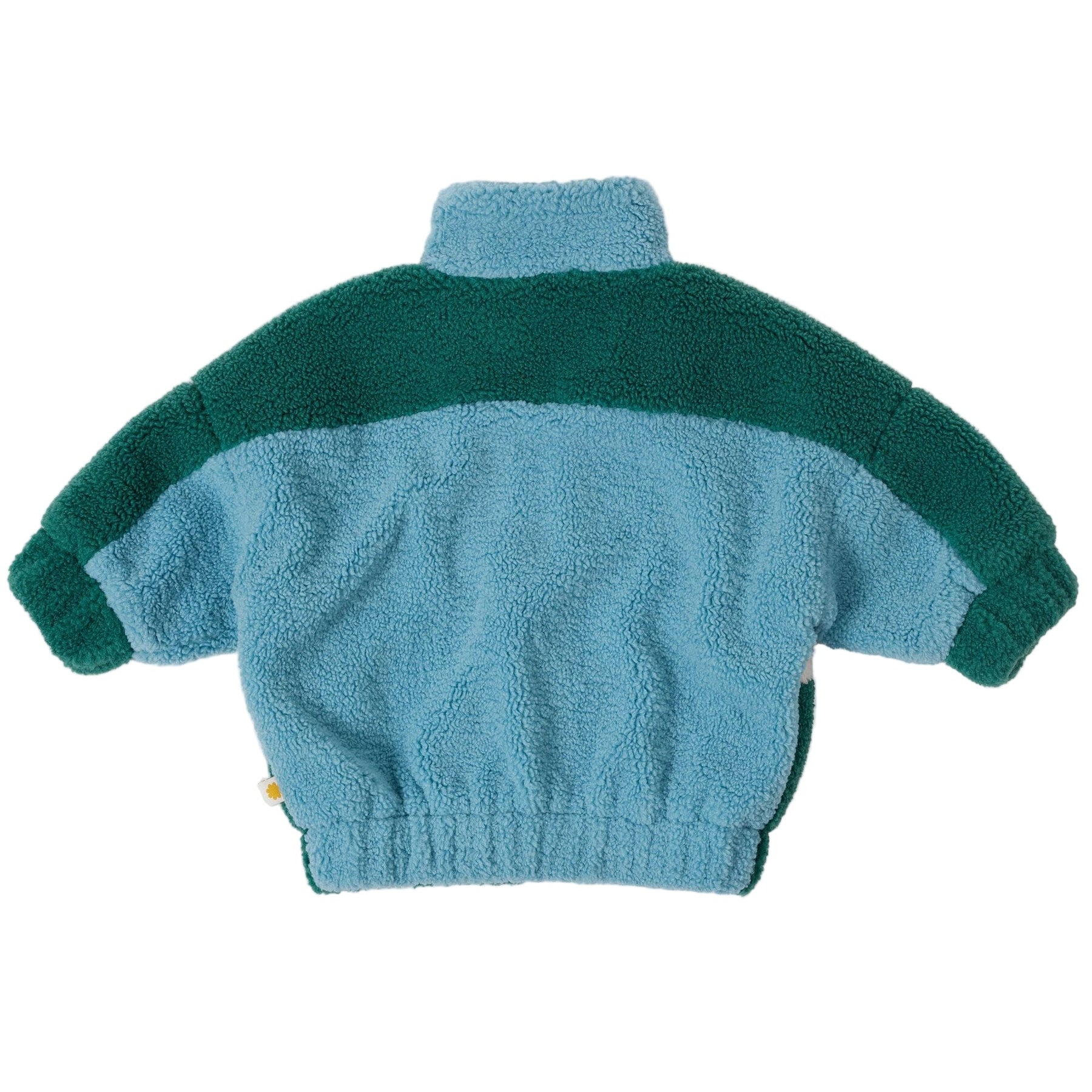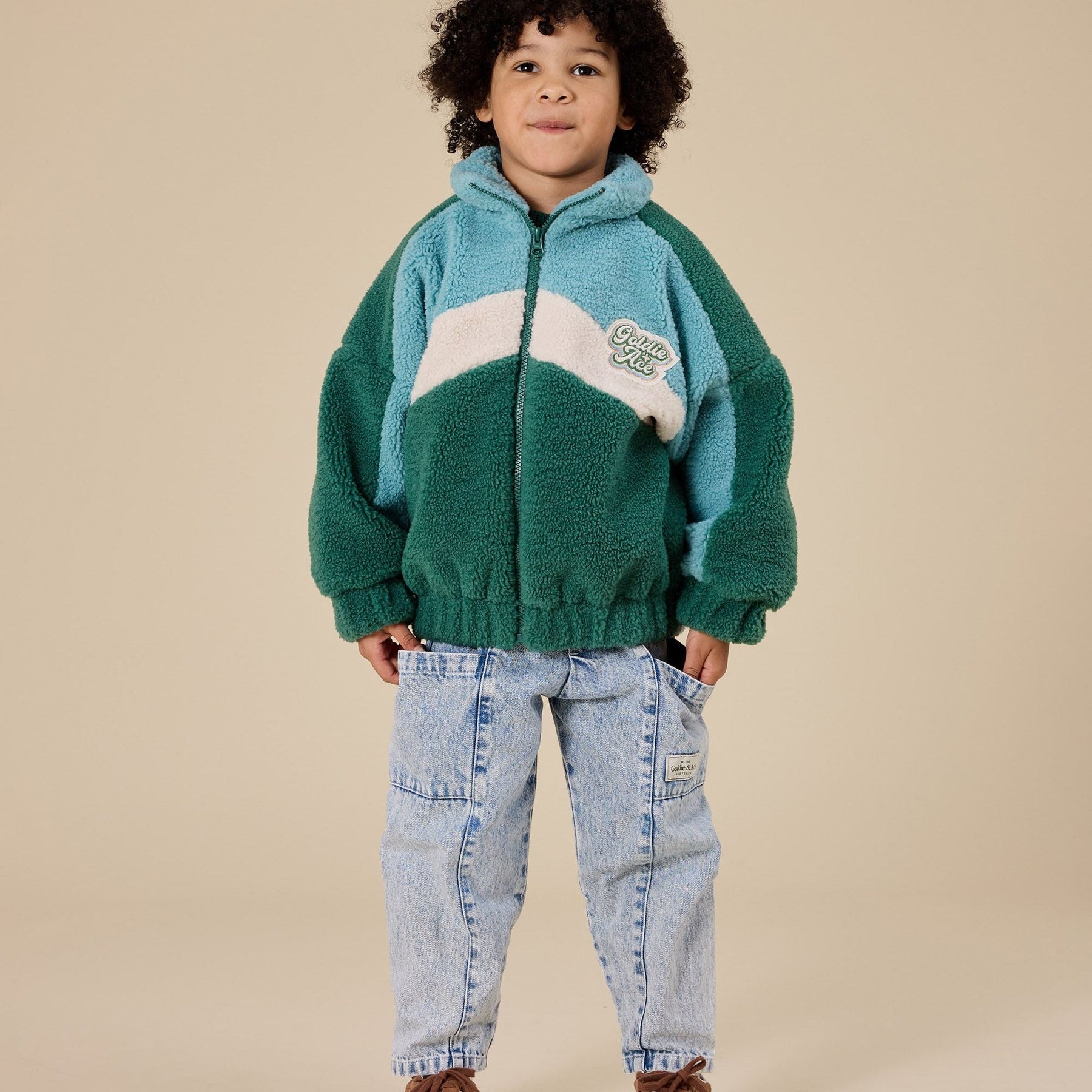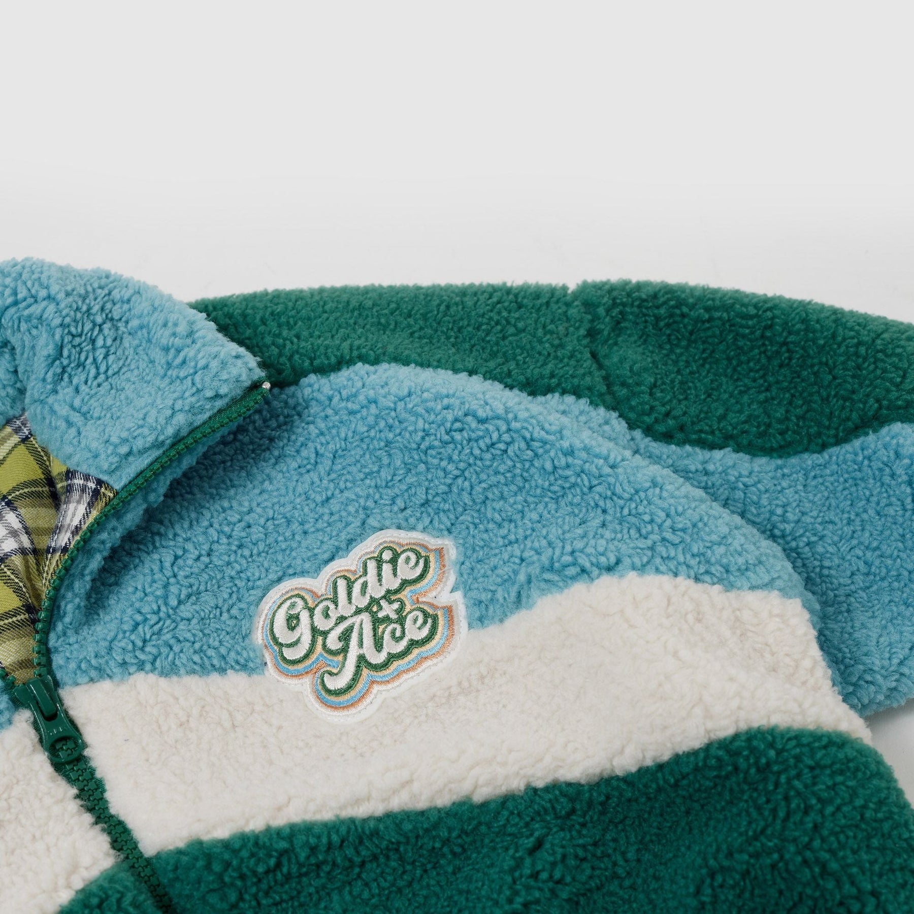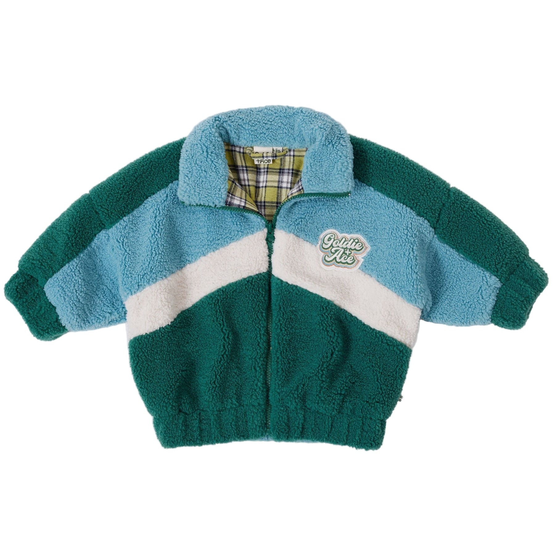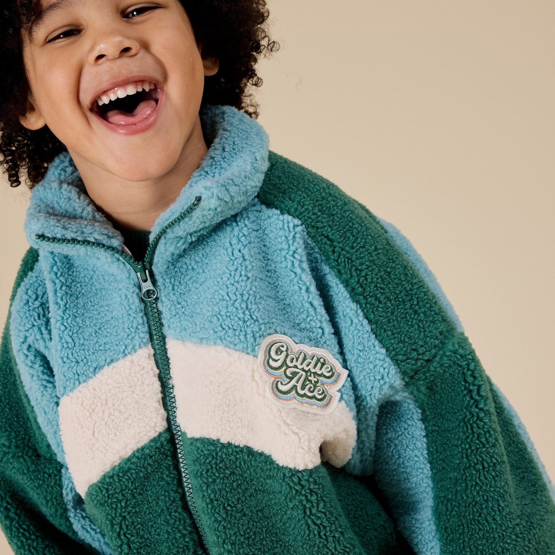 Dit is een stoere en heerlijk zachte jas van Goldie+ Ace in de kleuren blauw, crème en donkergroen. De jas heeft een vintage badge.