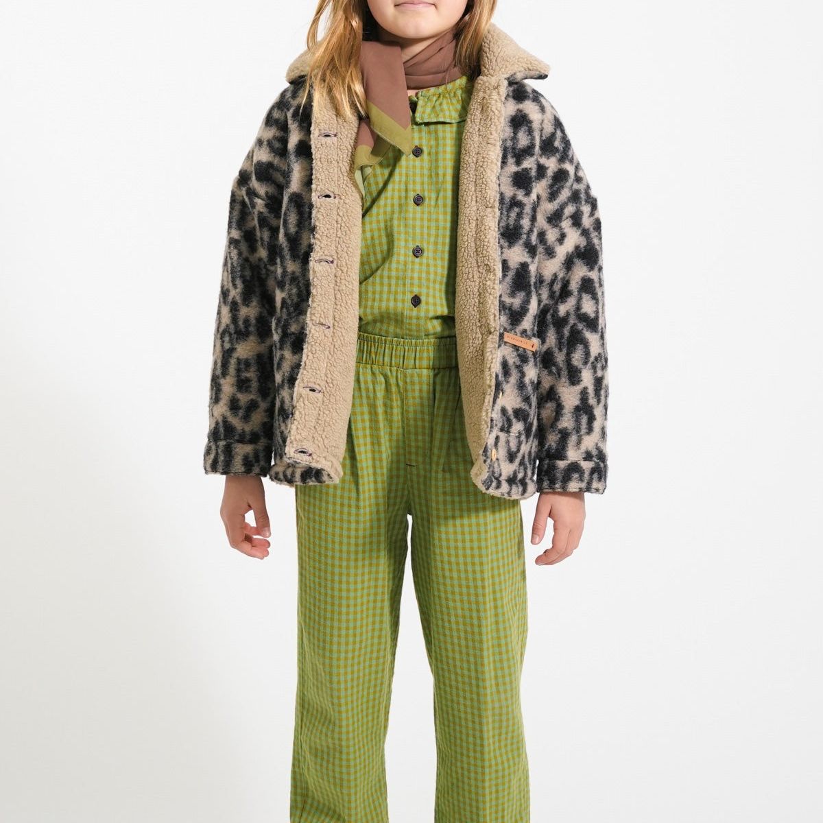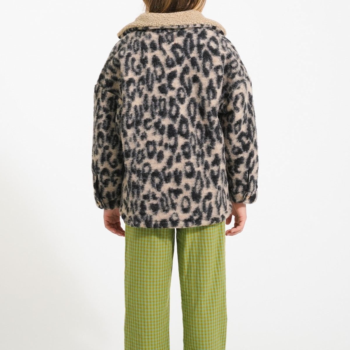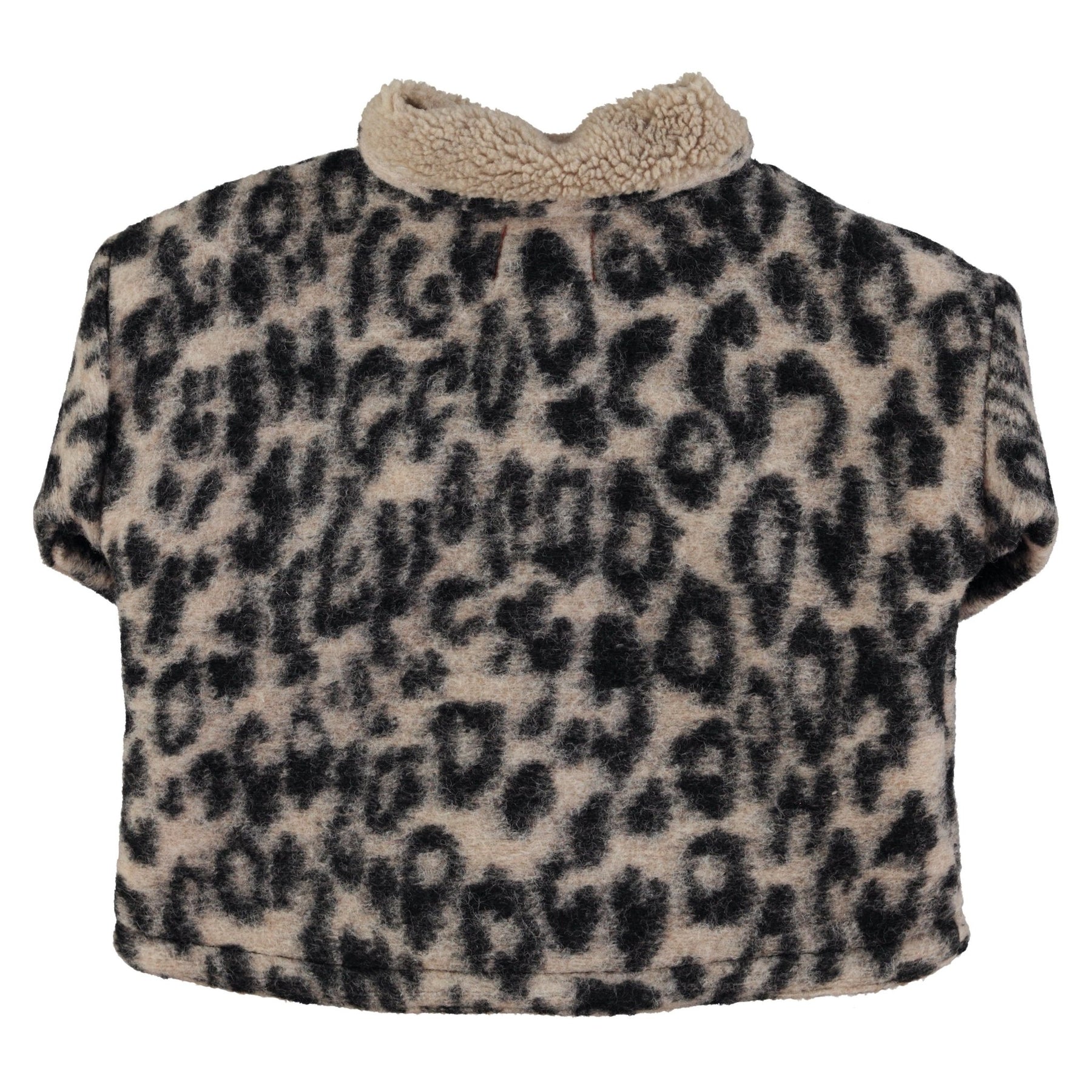 Warme jas met kraag. Knopen aan de voorkant. Opgezette zakken aan de voorkant met leren logo. Voering van imitatie omgekeerd lam.