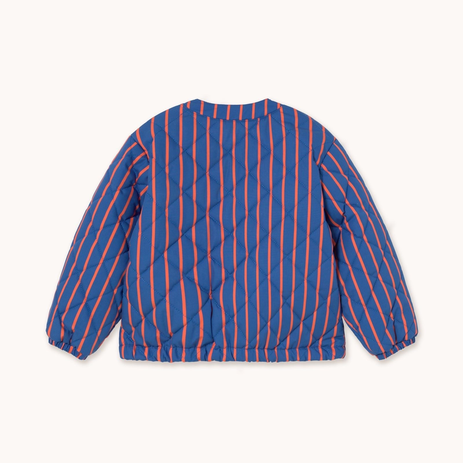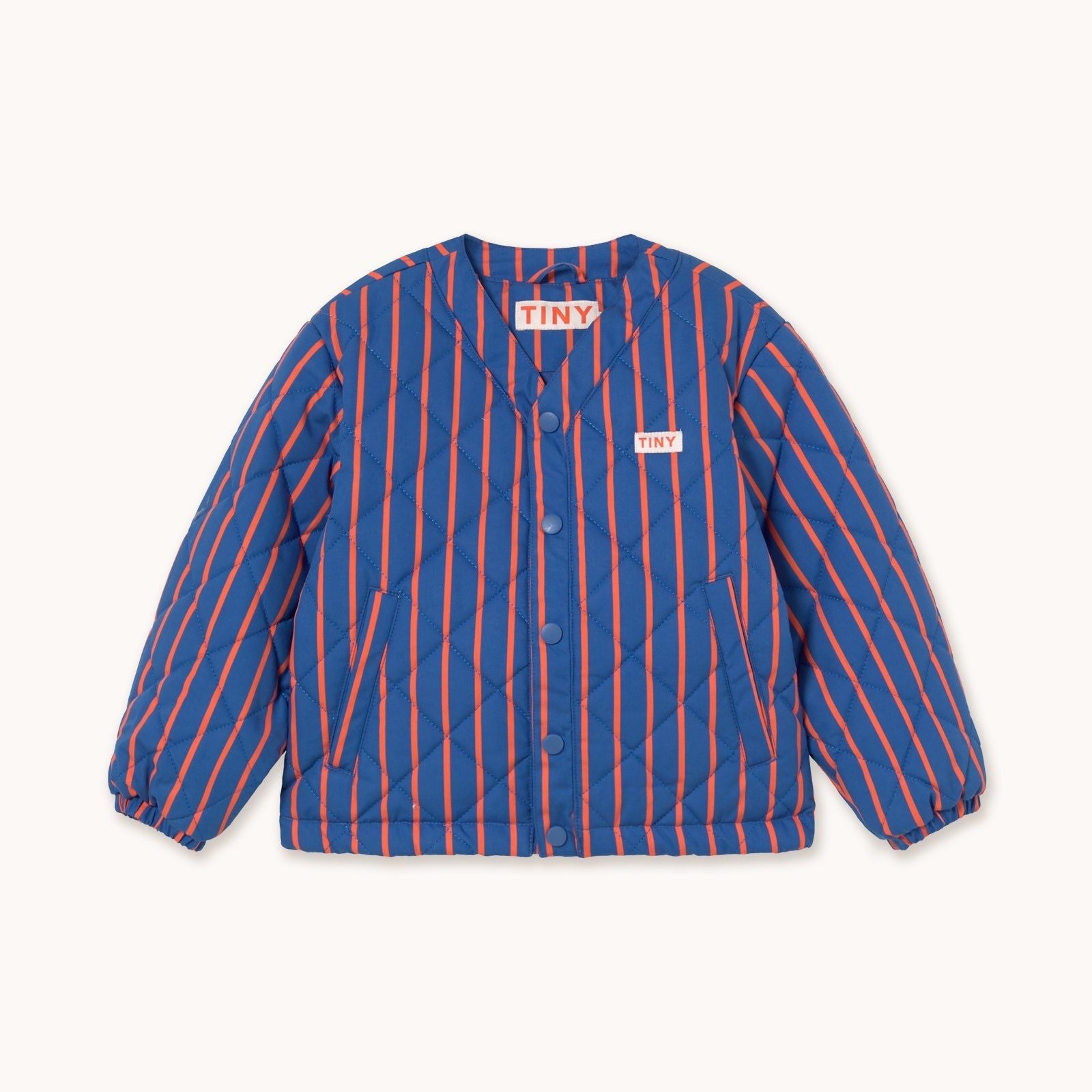 Dit is een mooie gewatteerde jas van Tiny Cottons met streepjespatroon in rood en blauw. Gemaakt in China.