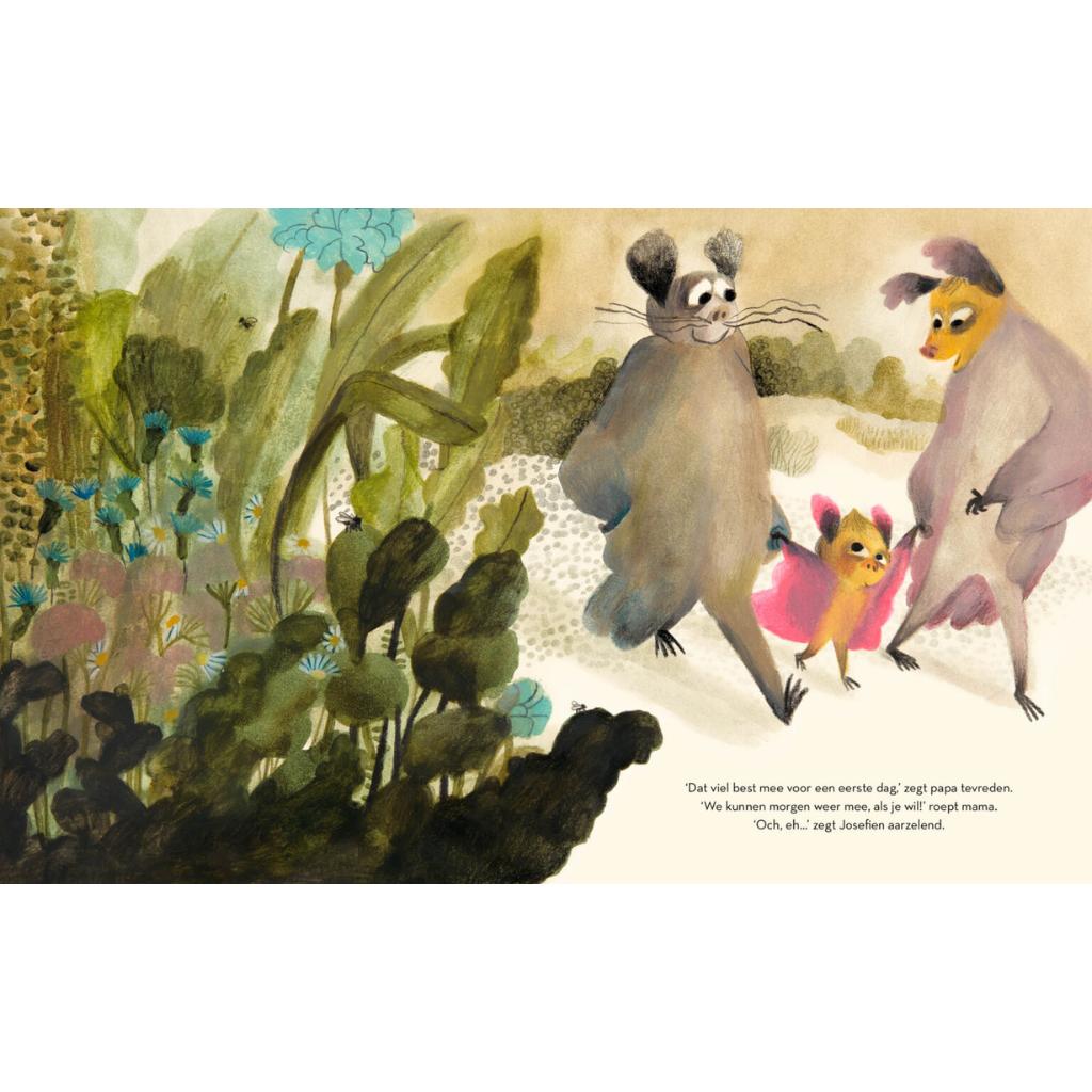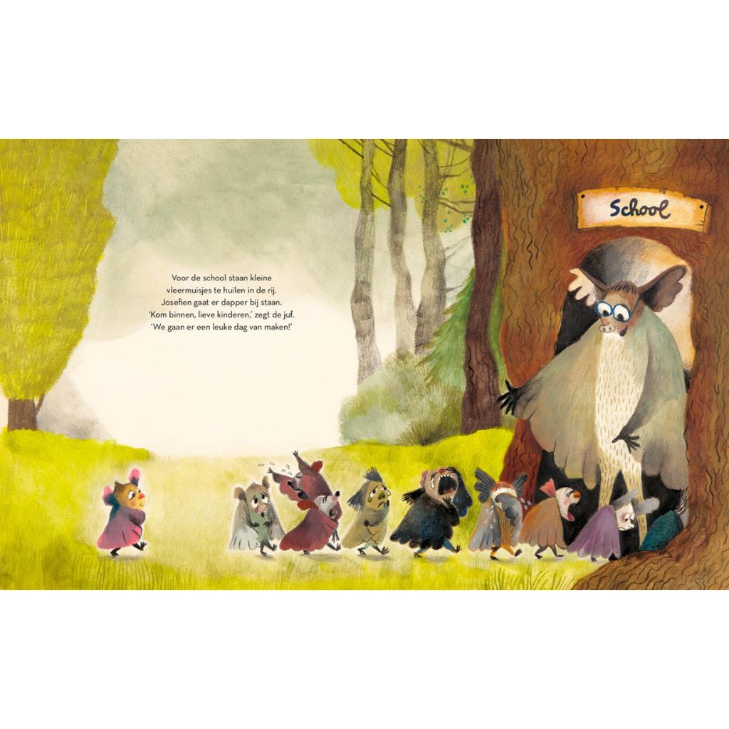 Josefien is een klein vleermuisje. Ze moet voor het eerst naar school, net als iedereen. Maar ze weigert, verzet zich en schreeuwt zo hard… De andere dieren marcheren gehoorzaam naar school, maar Josefien kan het niets schelen. “Nooit niet!” verklaart ze. Ze gaat NIET. Ze schreeuwt zo luid dat haar ouders krimpen tot de grootte van pinda’s – precies de juiste maat om knus onder Josefiens vleugel te passen. Nu kunnen ze allemaal samen naar school gaan!