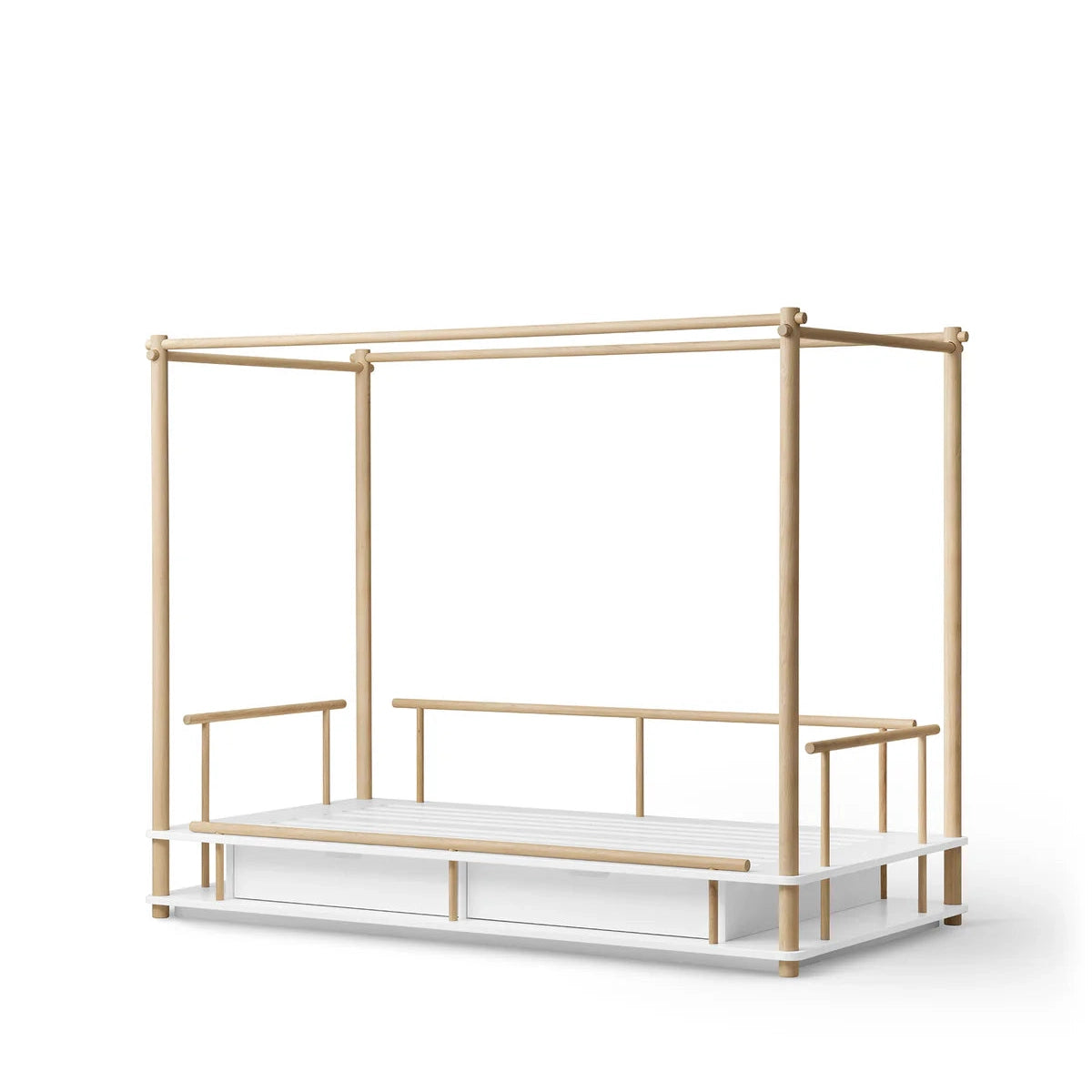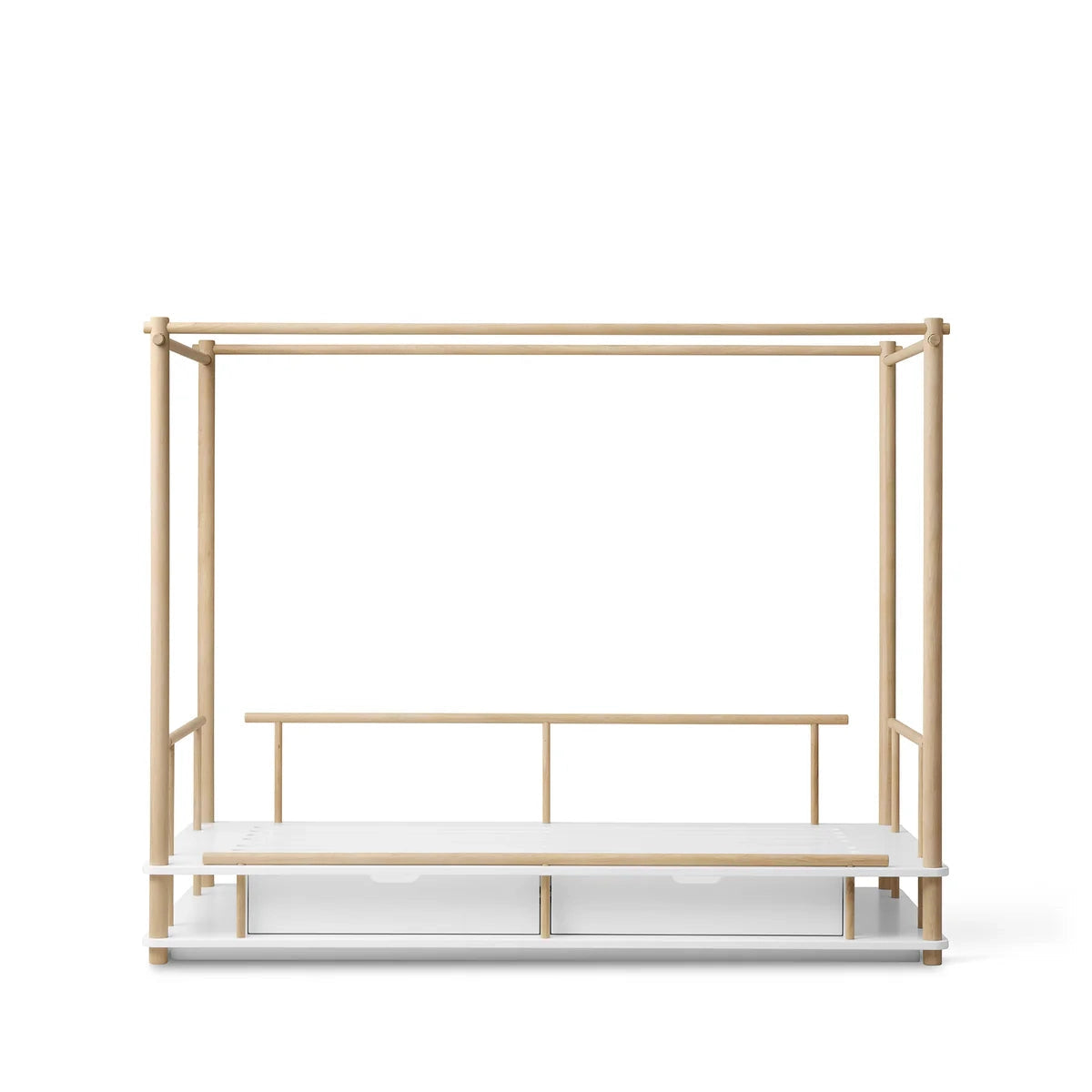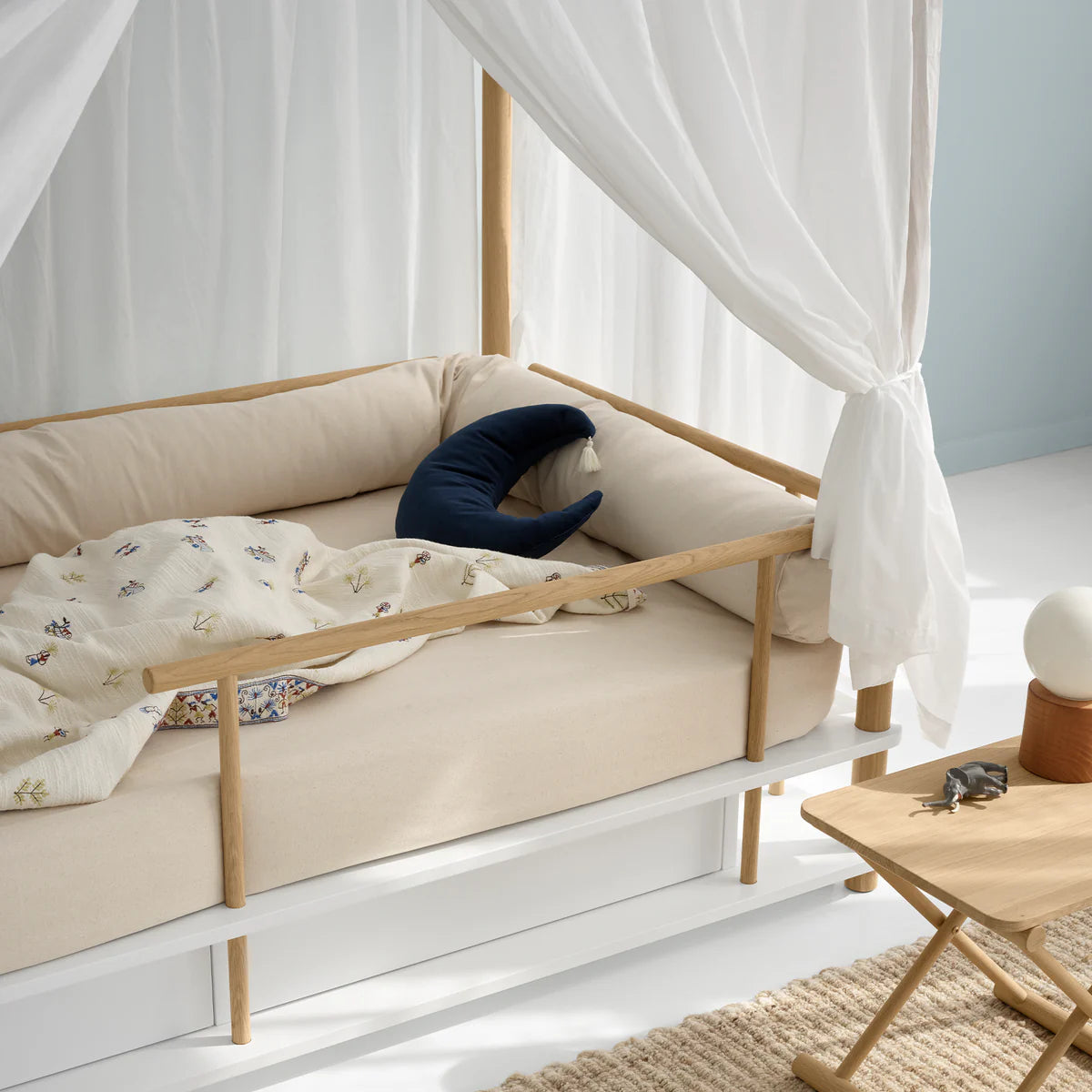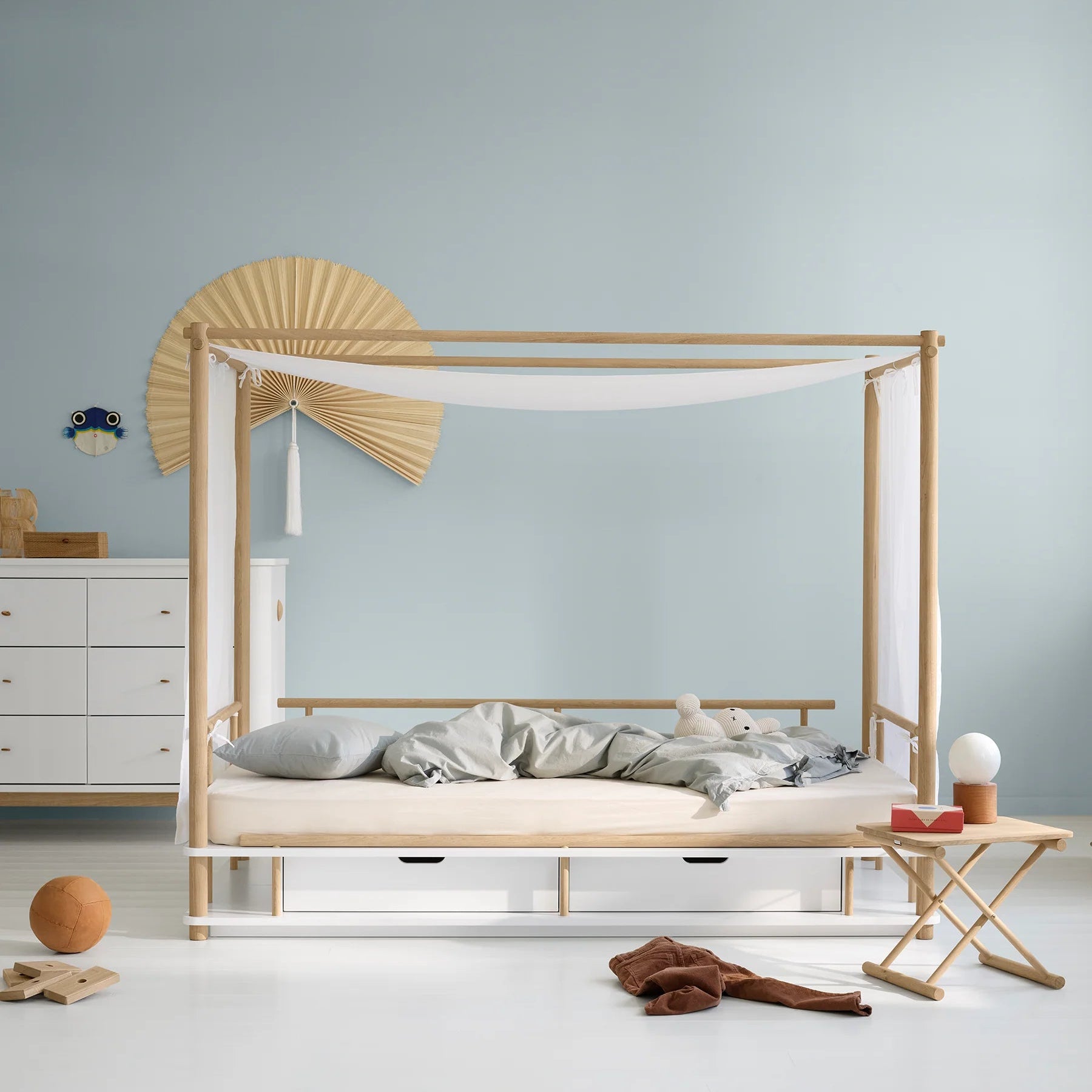 Het massief eikenhouten frame met verborgen schroeven en verfijnde afwerking straalt kwaliteit en vakmanschap uit. Praktische lades onder het bed zorgen voor extra opbergruimte, ideaal voor beddengoed, speelgoed of knuffels. Het Camp canopy bed komt volledig tot leven in combinatie met één van de speciaal ontworpen bedhemels, die elk hun eigen sfeer en fantasiewereld creëren. Overdag vormt het bed een uitnodigende plek om te spelen en te dagdromen, ’s nachts een geborgen cocon voor een goede nachtrust.