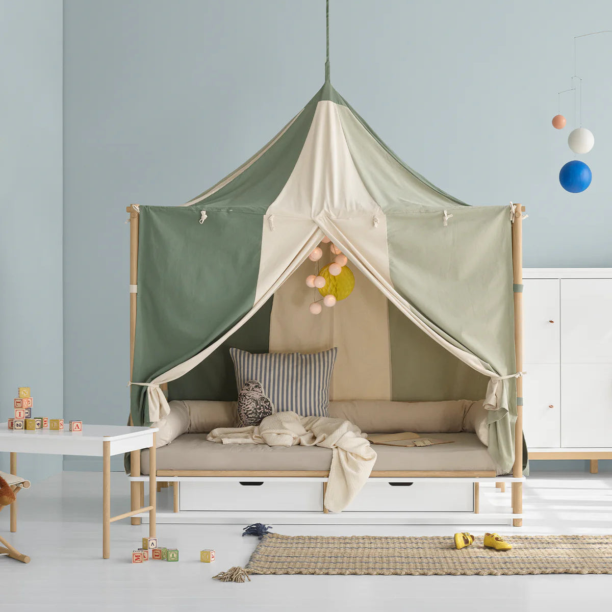 Het Camp canopy bed kan uitgebreid worden met verschillende bedhemels, elk met een unieke uitstraling: Camp canopy Sahara, Camp canopy Circus, Camp canopy Wild en Camp canopy Kyoto. Daarnaast kan het bed later worden omgebouwd tot een daybed met lage zij- en achterpanelen in massief eikenhout (extra aankoop).