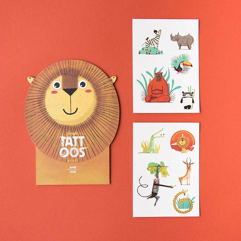 Tien tijdelijke tattoos met jungledieren die je op je huid kunt zetten. Ze zijn veilig, leuk, niet-giftig en gemaakt in Europa!