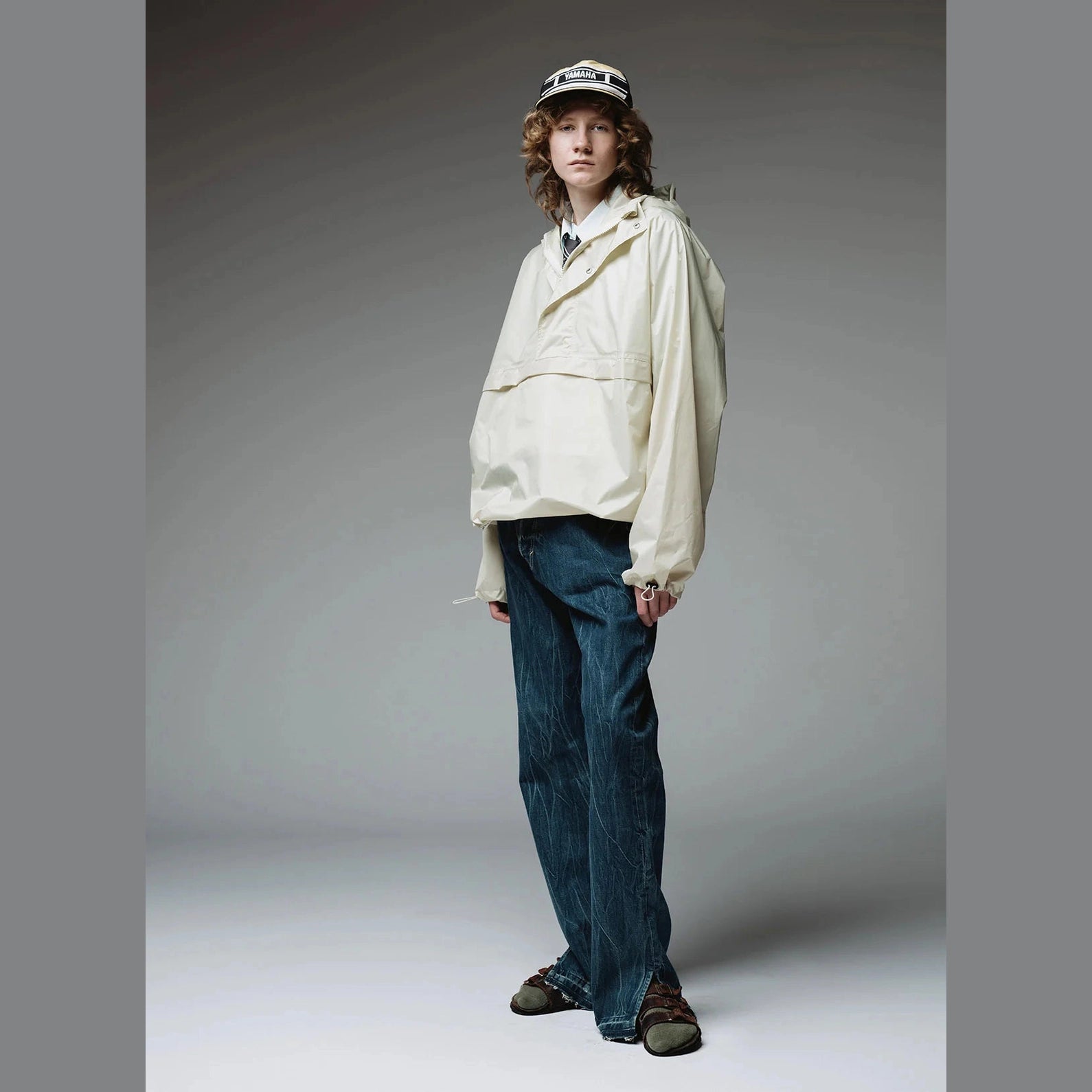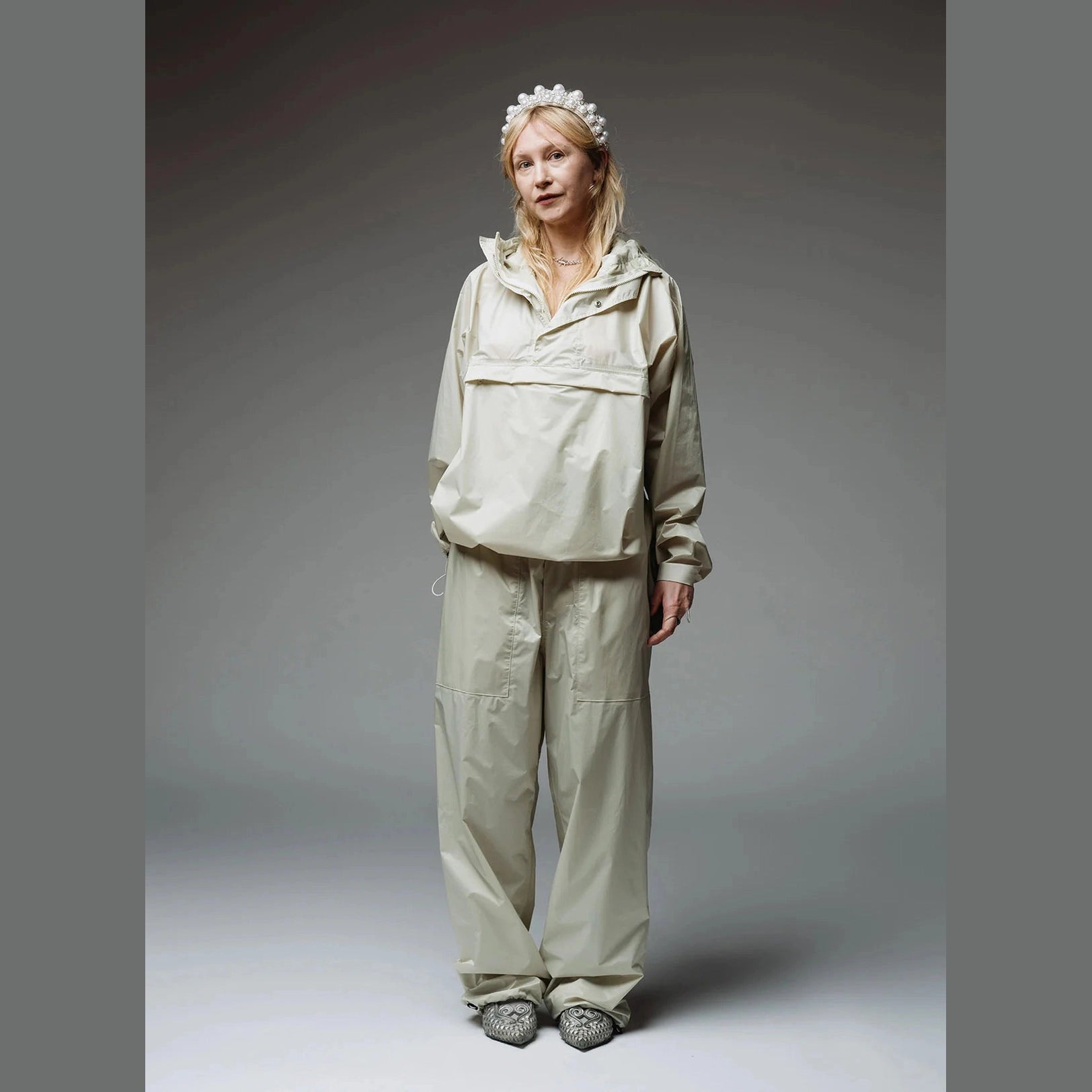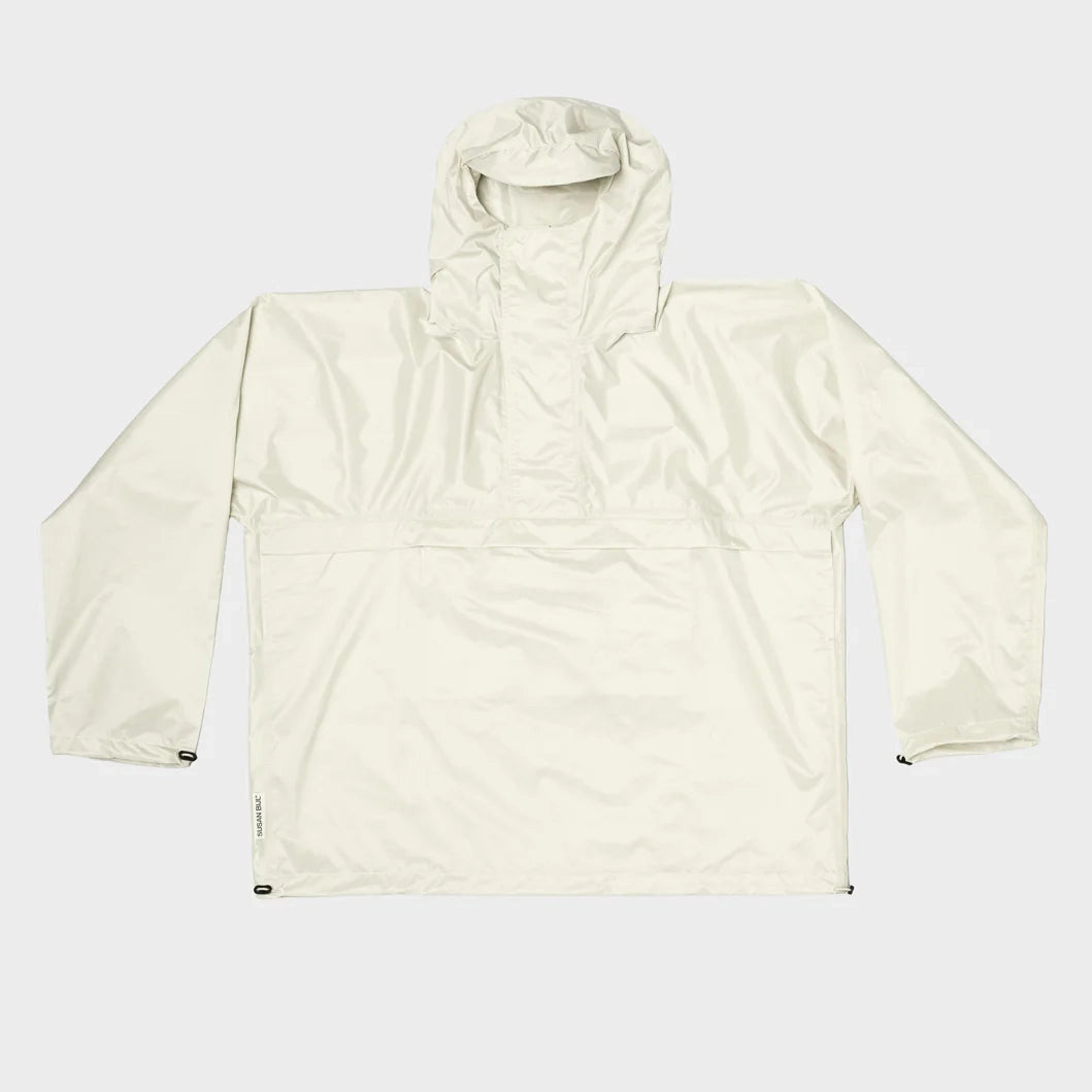 Een unisex anorak met een minimalistisch en verstelbaar silhouet. Dit korte, waterdichte jack biedt bewegingsvrijheid bij nat weer. Het pulloverontwerp heeft een grote zak aan de voorkant en een hoge kraag die tot over de kin kan worden geritst.