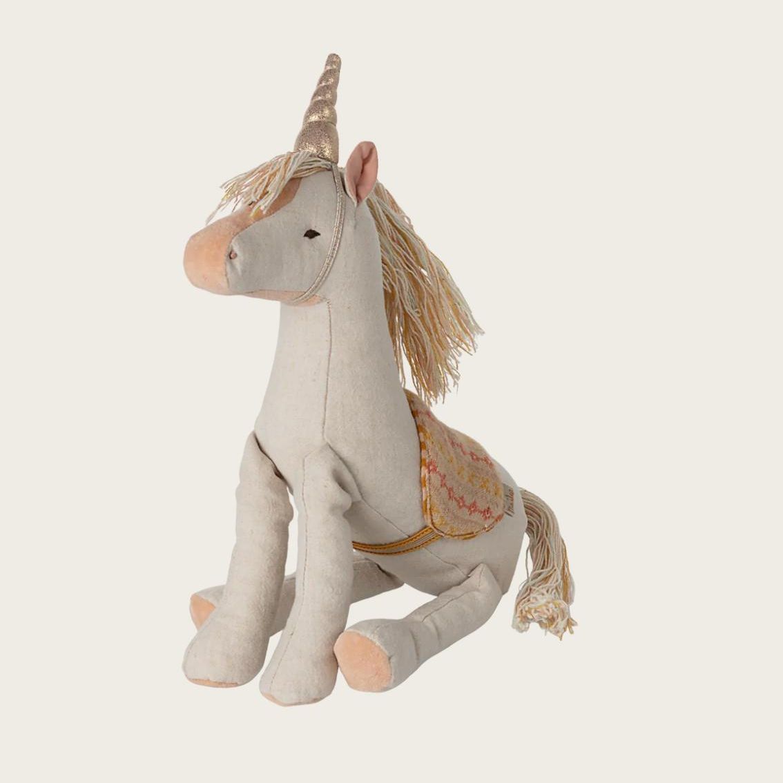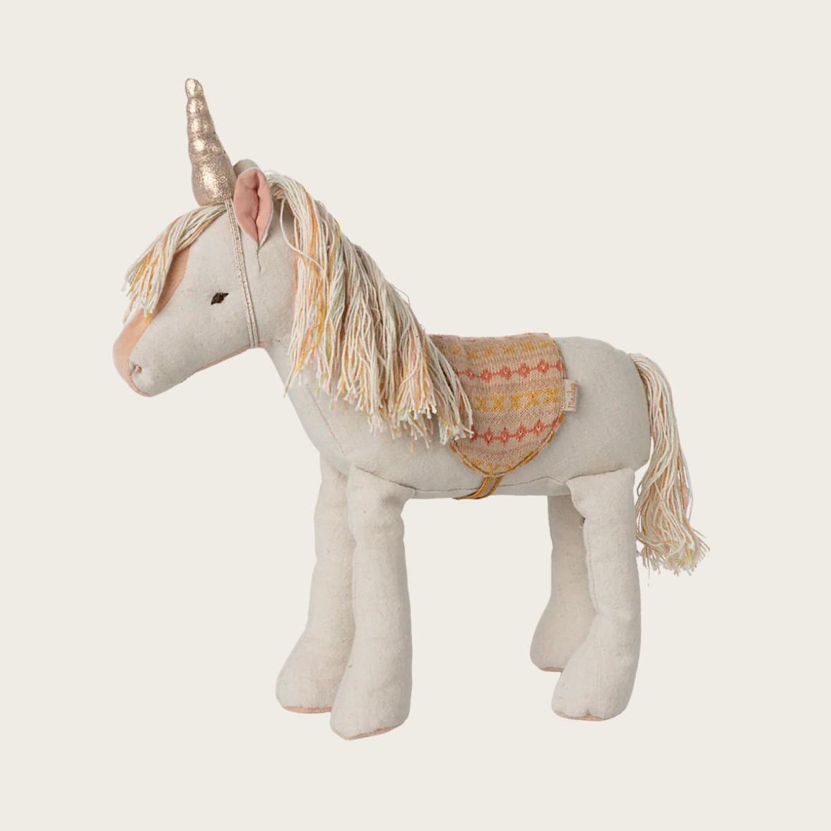 De gebroken witte eenhoorn is gemaakt van mooie zachte stof en heeft een harnas op de rug. Klaar voor het avontuur van je leven?