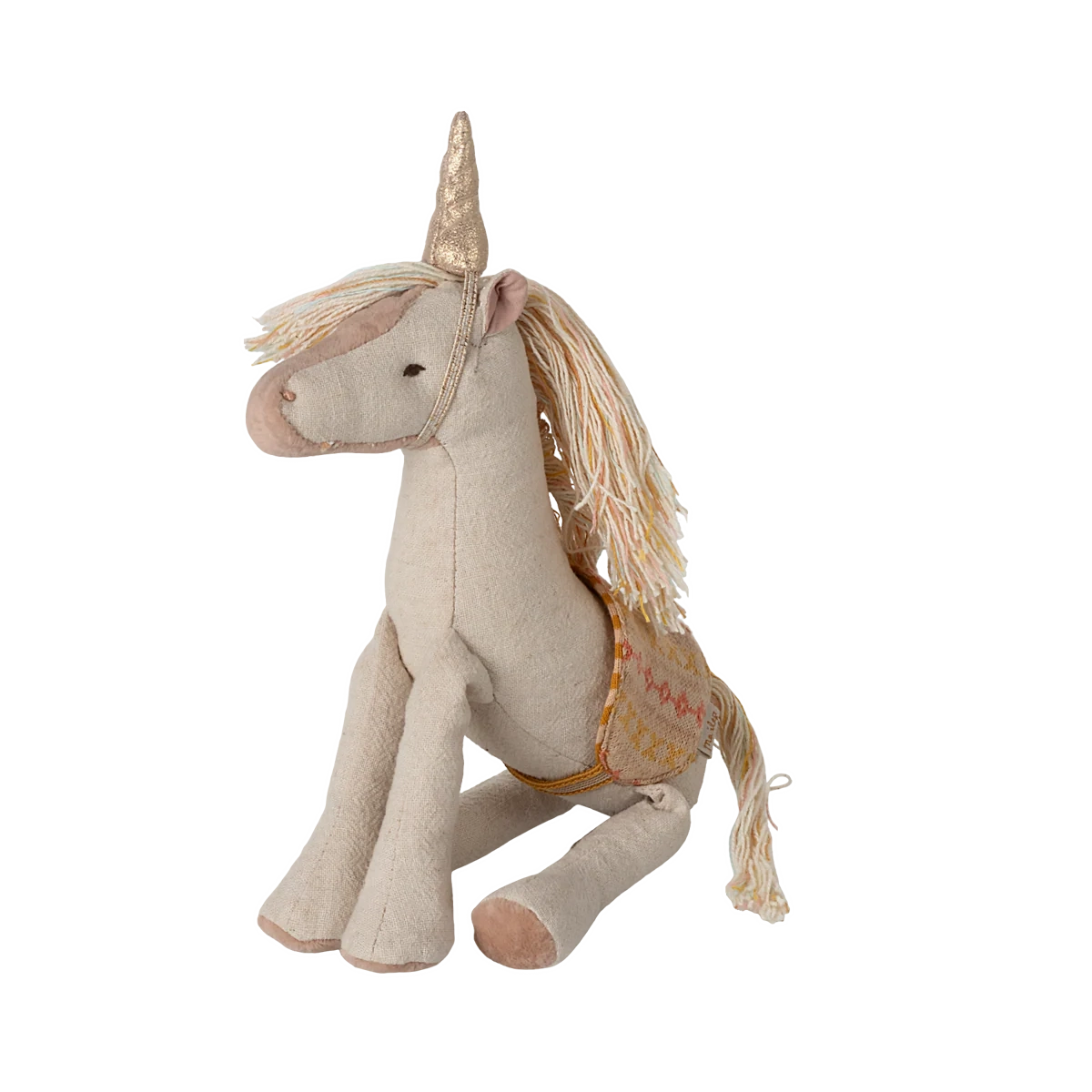 Een magisch verhaal staat op het punt te beginnen. Met deze eenhoorn in kleurrijke tinten en een gouden hoorn zijn er veel verhalen te vertellen. De eenhoorn wordt geleverd met een zadel voor een comfortabele rit.