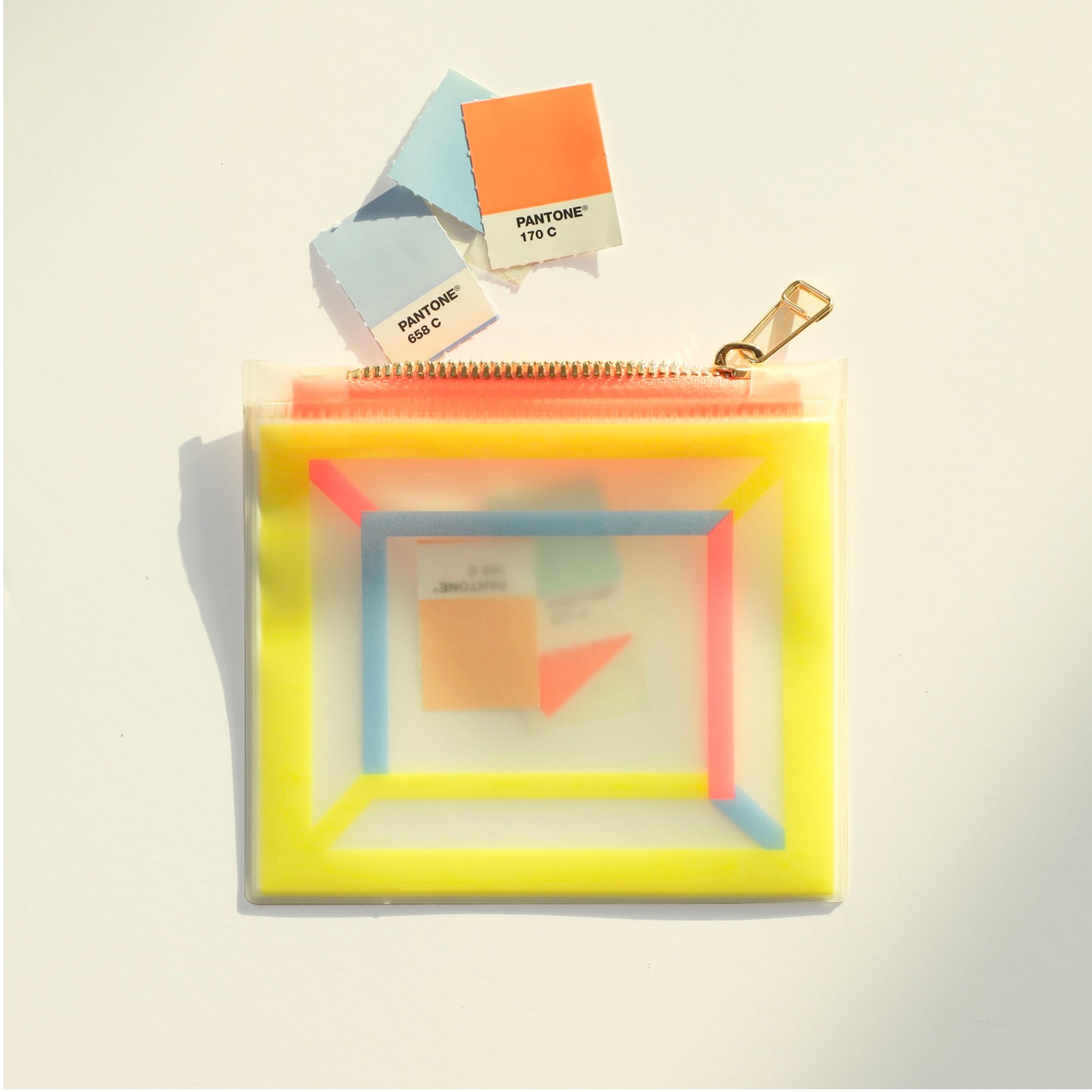 Op de afbeelding is een compacte pouch te zien met felgekleurde lijnen in blauw, roze en geel, die de speelse Lighttree-stijl duidelijk laten zien.