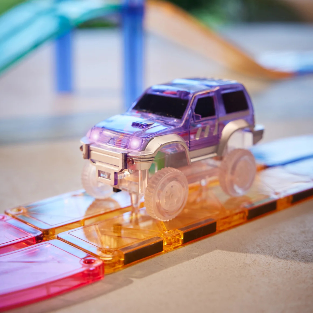 Maak je Cleverclixx Race Track nog spannender met deze Pastel Purple Race Car. Deze magnetische racewagen is speciaal ontworpen om perfect over de Cleverclixx Race Track te zoeven — met echte koplampen die oplichten zodra de motor start!