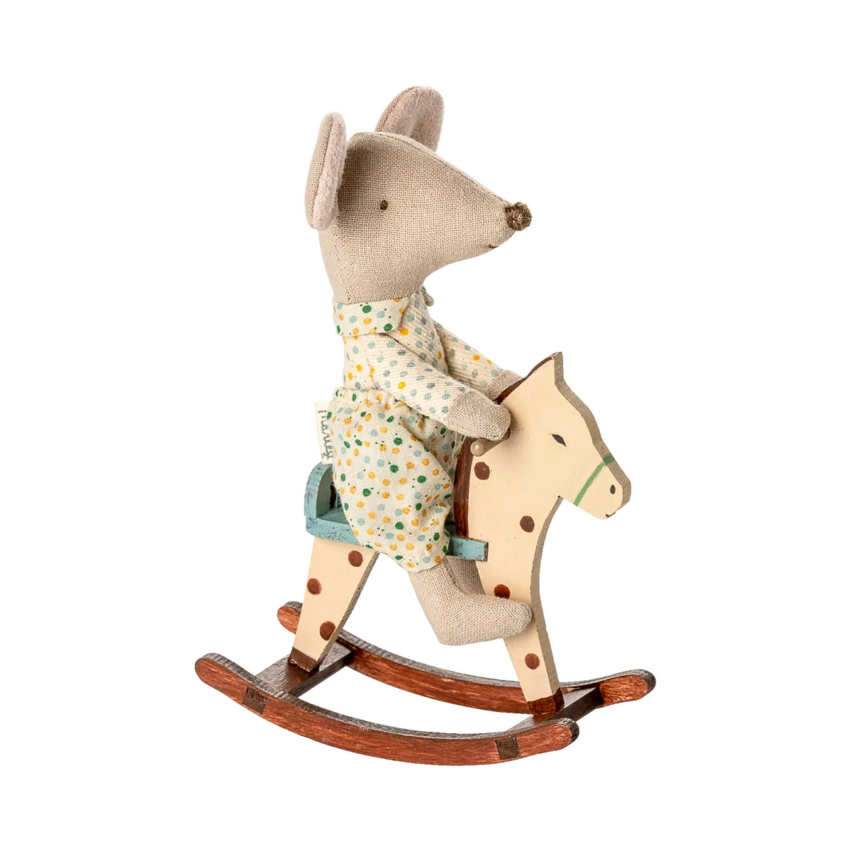 Dit houten hobbelpaard is een must voor alle speelse muizen. Dankzij de metalen handvatten kunnen muizen met magneten in hun handen zich gemakkelijk vasthouden en het kleine gaatje voor de staart zorgt voor een fijne rit. Geschikt voor kleine en grote broertjes en zusjes.