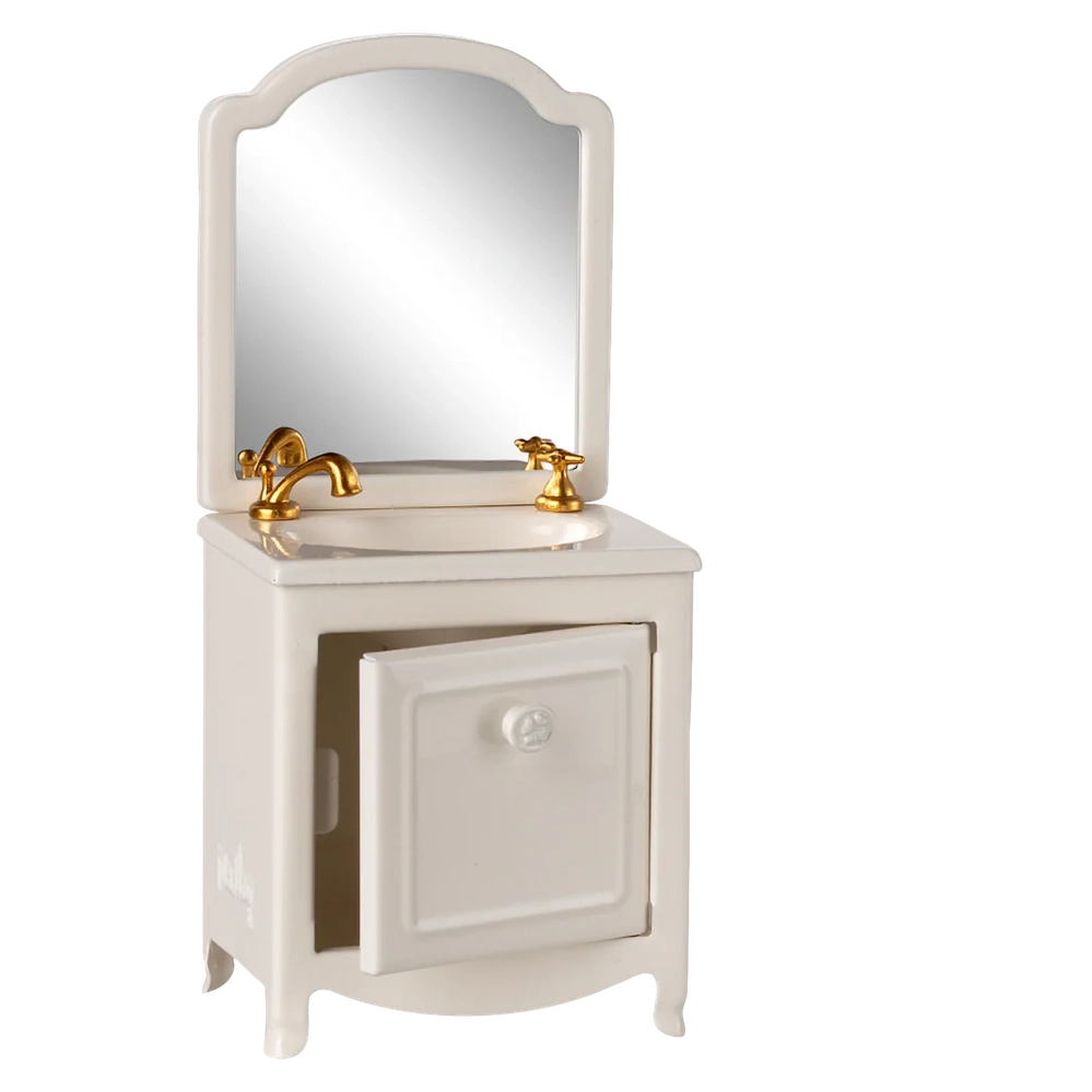 Een onmisbaar item voor de badkamer in Mouse Hole Farmhouse. Het heeft een klein kastje onder de wastafel en natuurlijk ook een spiegel. Voeg het Maileg-toilet en -bad toe om het speelplezier te vergroten.