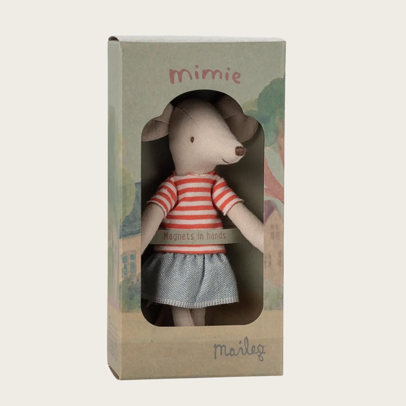 Deze muis is het zusje van LouiMax en draagt een rood gestreept t-shirt en een spijkerrok. Ze heeft magneten in haar handen en wordt verkocht in een heel mooie decoratiedoos.