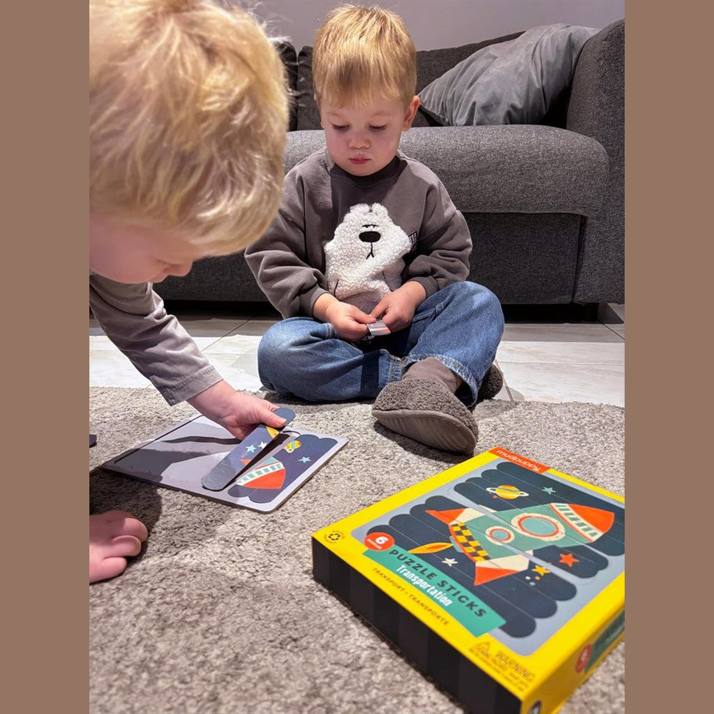 • 24 dubbelzijdige stokjes waarmee 6 unieke puzzels kunnen worden gemaakt, inclusief puzzelbakje
