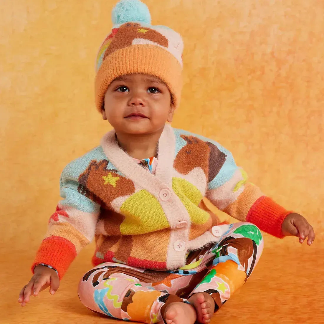 Warm als een knuffel! Deze zachte, pluizige gebreide cardigan houdt je kind deze winter heerlijk warm en comfortabel. De cardigan heeft een centrale knoopsluiting, een subtiele fluffy afwerking en een speels gebreid ontwerp uit onze Giddy Up-collectie aan beide zijden. De cardigan behoudt zijn vorm uitstekend, zodat je er keer op keer van kunt genieten.