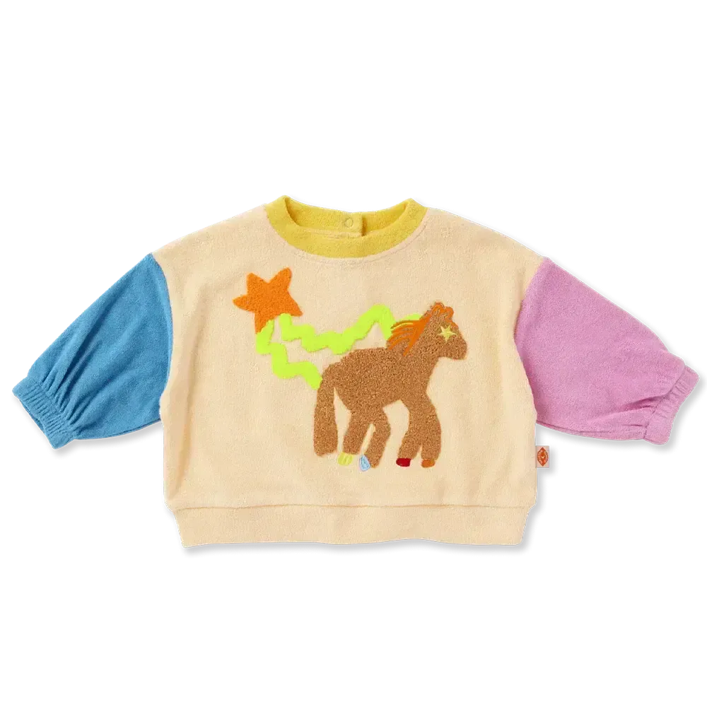Let’s roll! Ontspan of ga eropuit in deze comfortabele en duurzame terry sweater voor baby’s en kinderen. Deze sweater heeft een speelse boucle applicatie uit onze Giddy Up-collectie, geïnspireerd door de allerschattigste pony’s die galopperen onder een fonkelende sterrenhemel.